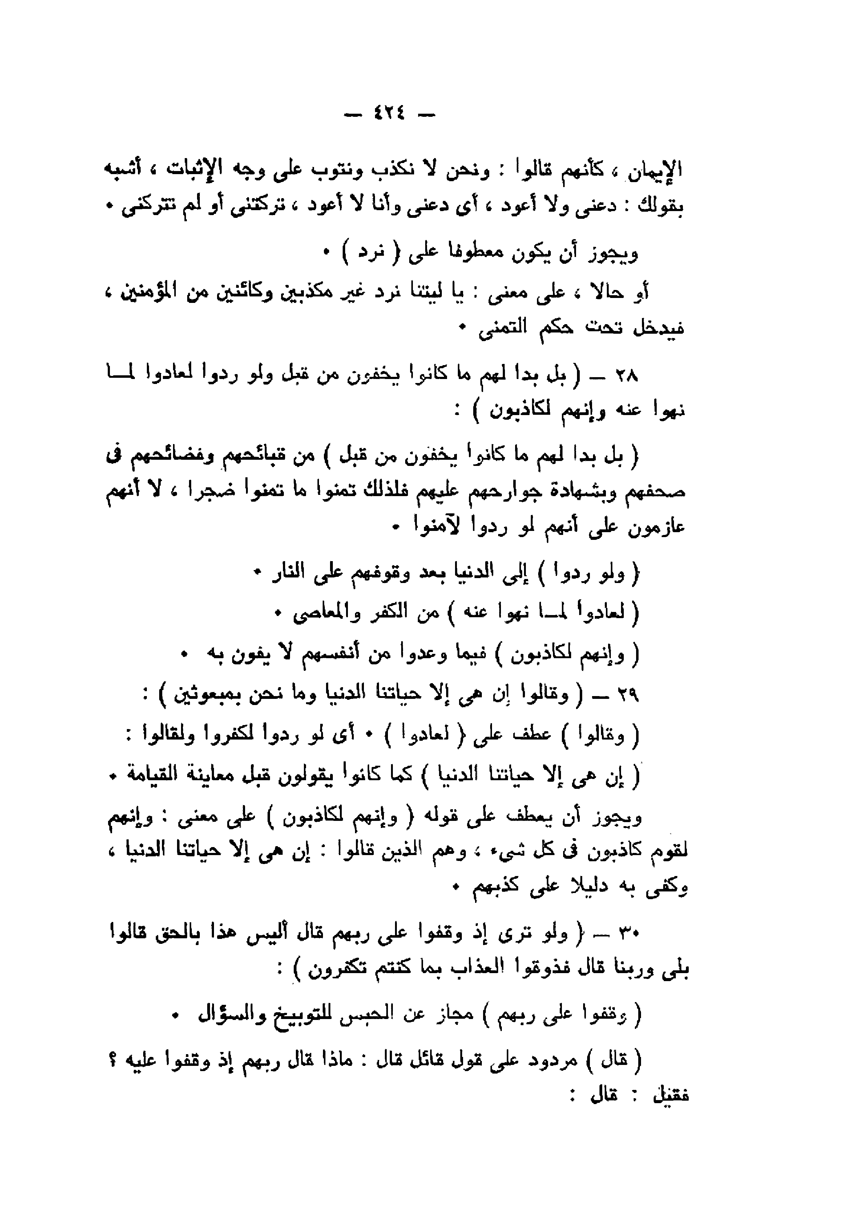 بَلْ بَدا لَهُمْ ما كانُوا يُخْفُونَ مِنْ قَبْلُ وَلَوْ رُدُّوا لَعادُوا لِما نُهُوا عَنْهُ وَإِنَّهُمْ لَكاذِبُونَ (28) وَقالُوا إِنْ هِيَ إِلاَّ حَياتُنَا الدُّنْيا وَما نَحْنُ بِمَبْعُوثِينَ (29) وَلَوْ تَرى إِذْ وُقِفُوا عَلى رَبِّهِمْ قالَ أَلَيْسَ هذا بِالْحَقِّ قالُوا بَلى وَرَبِّنا قالَ فَذُوقُوا الْعَذابَ بِما كُنْتُمْ تَكْفُرُونَ (30)