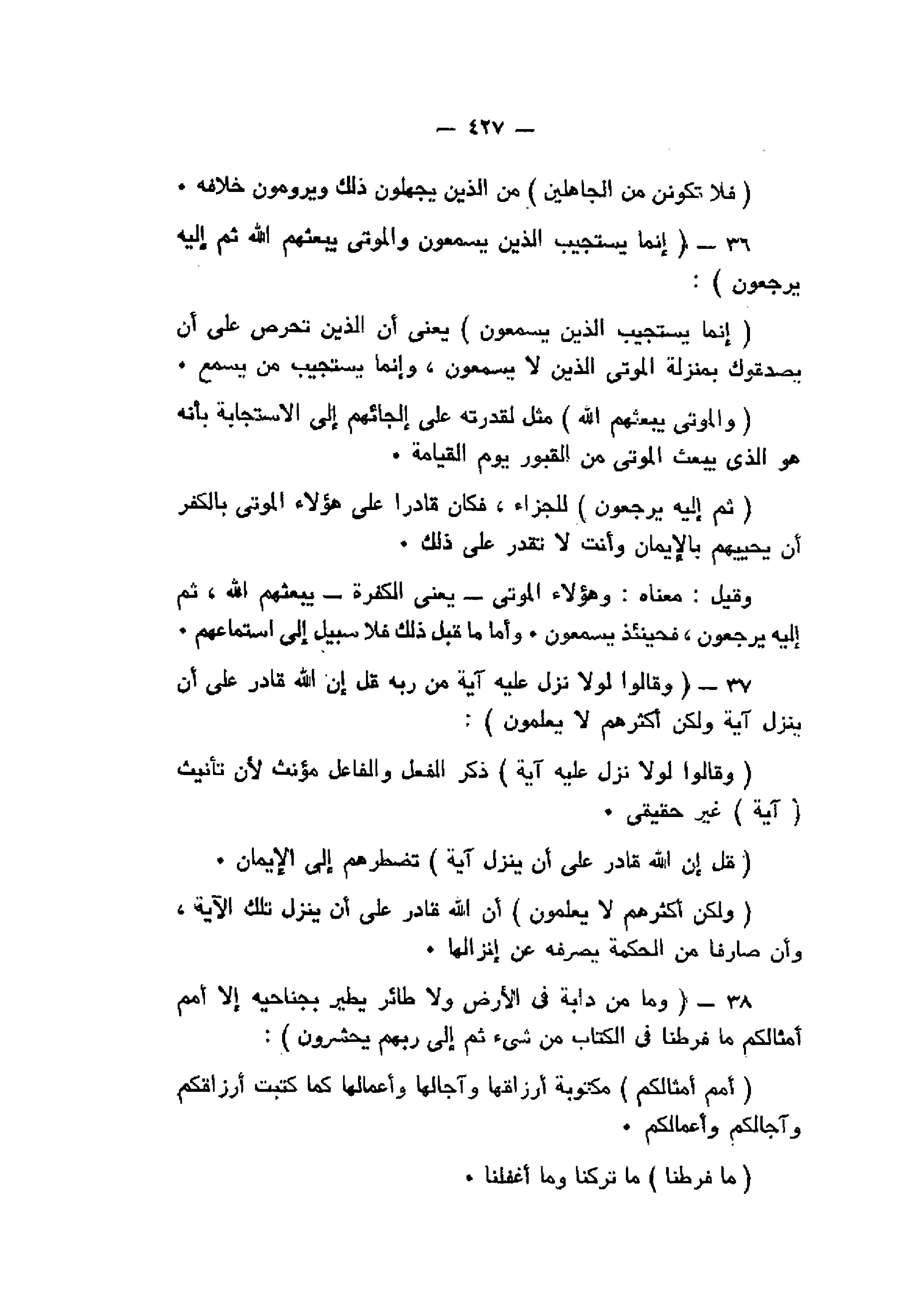 إِنَّما يَسْتَجِيبُ الَّذِينَ يَسْمَعُونَ وَالْمَوْتى يَبْعَثُهُمُ اللَّهُ ثُمَّ إِلَيْهِ يُرْجَعُونَ (36) وَقالُوا لَوْلا نُزِّلَ عَلَيْهِ آيَةٌ مِنْ رَبِّهِ قُلْ إِنَّ اللَّهَ قادِرٌ عَلى أَنْ يُنَزِّلَ آيَةً وَلكِنَّ أَكْثَرَهُمْ لا يَعْلَمُونَ (37) وَما مِنْ دَابَّةٍ فِي الْأَرْضِ وَلا طائِرٍ يَطِيرُ بِجَناحَيْهِ إِلاَّ أُمَمٌ أَمْثالُكُمْ ما فَرَّطْنا فِي الْكِتابِ مِنْ شَيْءٍ ثُمَّ إِلى رَبِّهِمْ يُحْشَرُونَ (38)