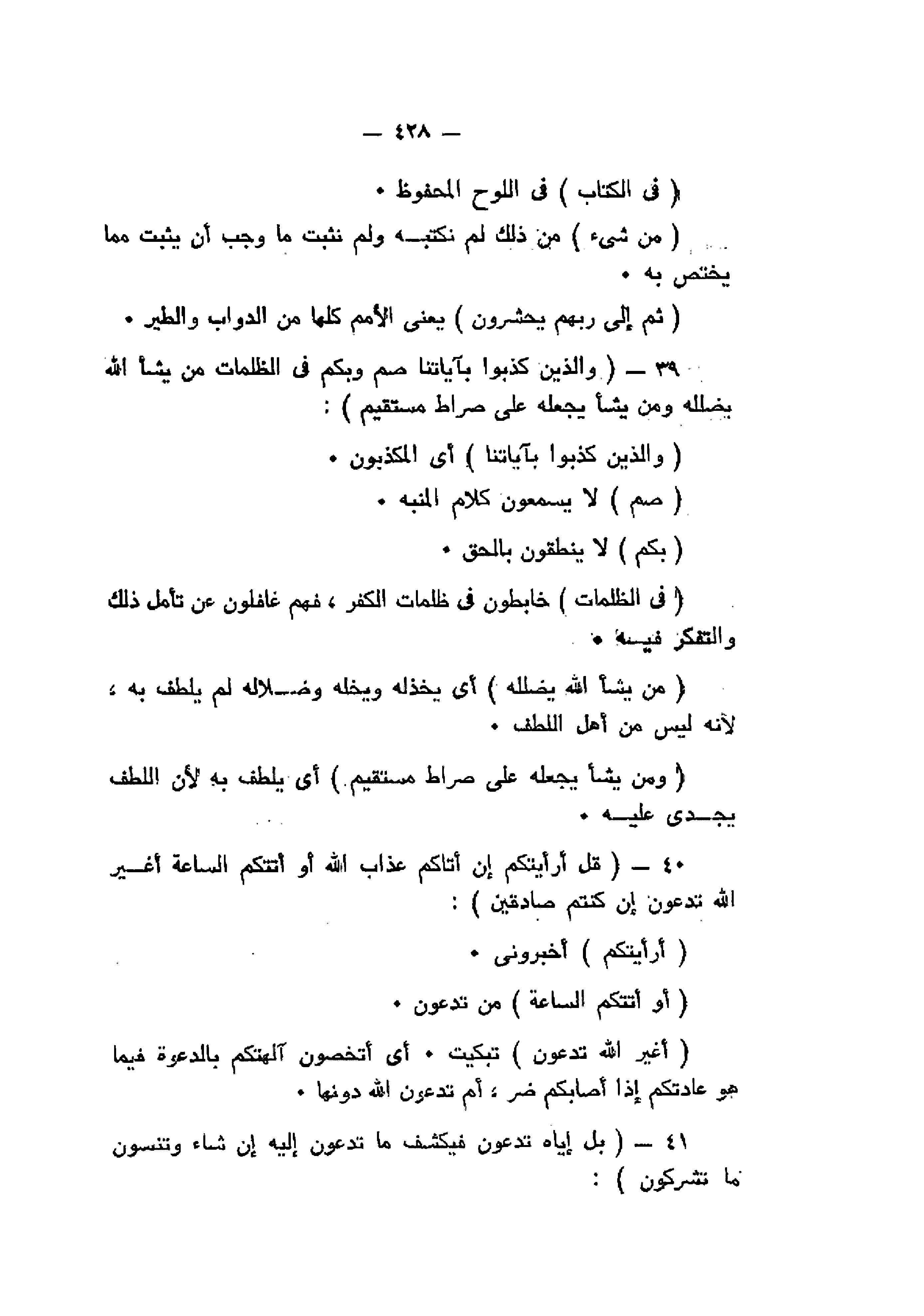 وَالَّذِينَ كَذَّبُوا بِآياتِنا صُمٌّ وَبُكْمٌ فِي الظُّلُماتِ مَنْ يَشَأِ اللَّهُ يُضْلِلْهُ وَمَنْ يَشَأْ يَجْعَلْهُ عَلى صِراطٍ مُسْتَقِيمٍ (39) قُلْ أَرَأَيْتَكُمْ إِنْ أَتاكُمْ عَذابُ اللَّهِ أَوْ أَتَتْكُمُ السَّاعَةُ أَغَيْرَ اللَّهِ تَدْعُونَ إِنْ كُنْتُمْ صادِقِينَ (40) بَلْ إِيَّاهُ تَدْعُونَ فَيَكْشِفُ ما تَدْعُونَ إِلَيْهِ إِنْ شاءَ وَتَنْسَوْنَ ما تُشْرِكُونَ (41)
