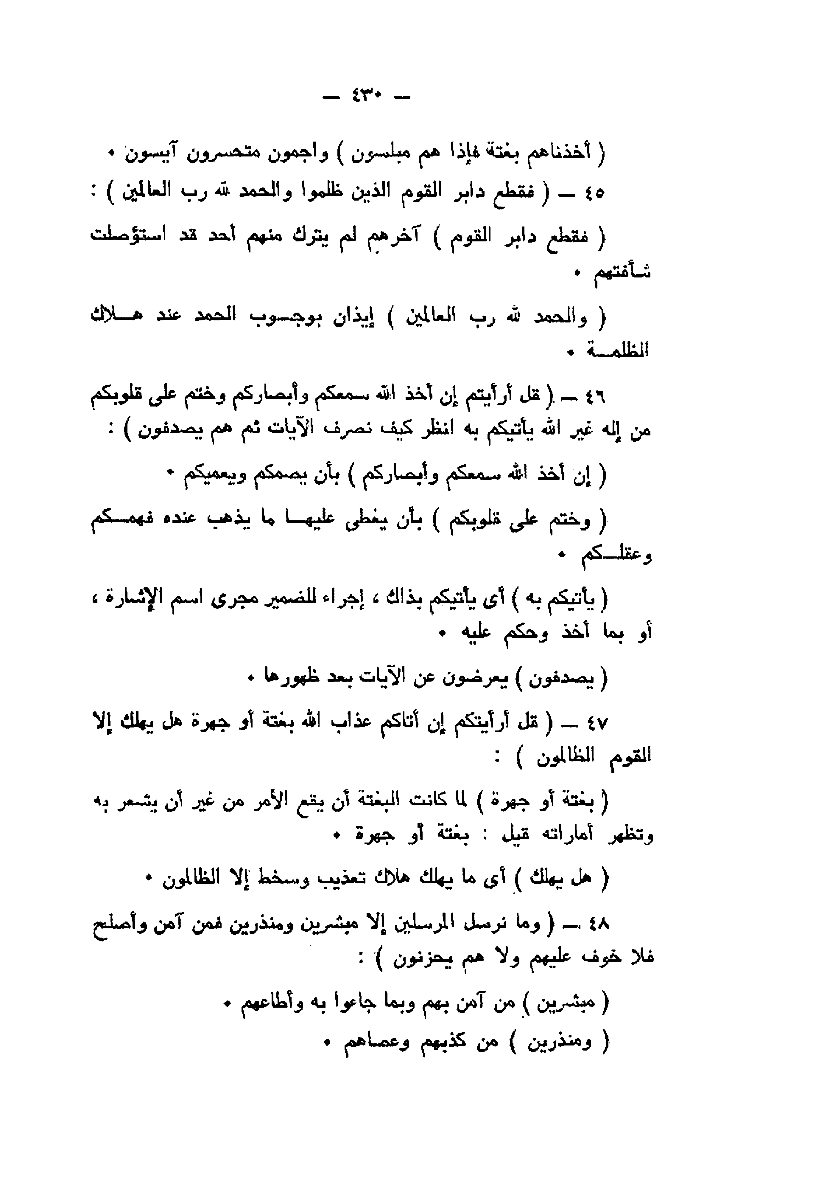 فَقُطِعَ دابِرُ الْقَوْمِ الَّذِينَ ظَلَمُوا وَالْحَمْدُ لِلَّهِ رَبِّ الْعالَمِينَ (45) قُلْ أَرَأَيْتُمْ إِنْ أَخَذَ اللَّهُ سَمْعَكُمْ وَأَبْصارَكُمْ وَخَتَمَ عَلى قُلُوبِكُمْ مَنْ إِلهٌ غَيْرُ اللَّهِ يَأْتِيكُمْ بِهِ انْظُرْ كَيْفَ نُصَرِّفُ الْآياتِ ثُمَّ هُمْ يَصْدِفُونَ (46) قُلْ أَرَأَيْتَكُمْ إِنْ أَتاكُمْ عَذابُ اللَّهِ بَغْتَةً أَوْ جَهْرَةً هَلْ يُهْلَكُ إِلاَّ الْقَوْمُ الظَّالِمُونَ (47) وَما نُرْسِلُ الْمُرْسَلِينَ إِلاَّ مُبَشِّرِينَ وَمُنْذِرِينَ فَمَنْ آمَنَ وَأَصْلَحَ فَلا خَوْفٌ عَلَيْهِمْ وَلا هُمْ يَحْزَنُونَ (48)