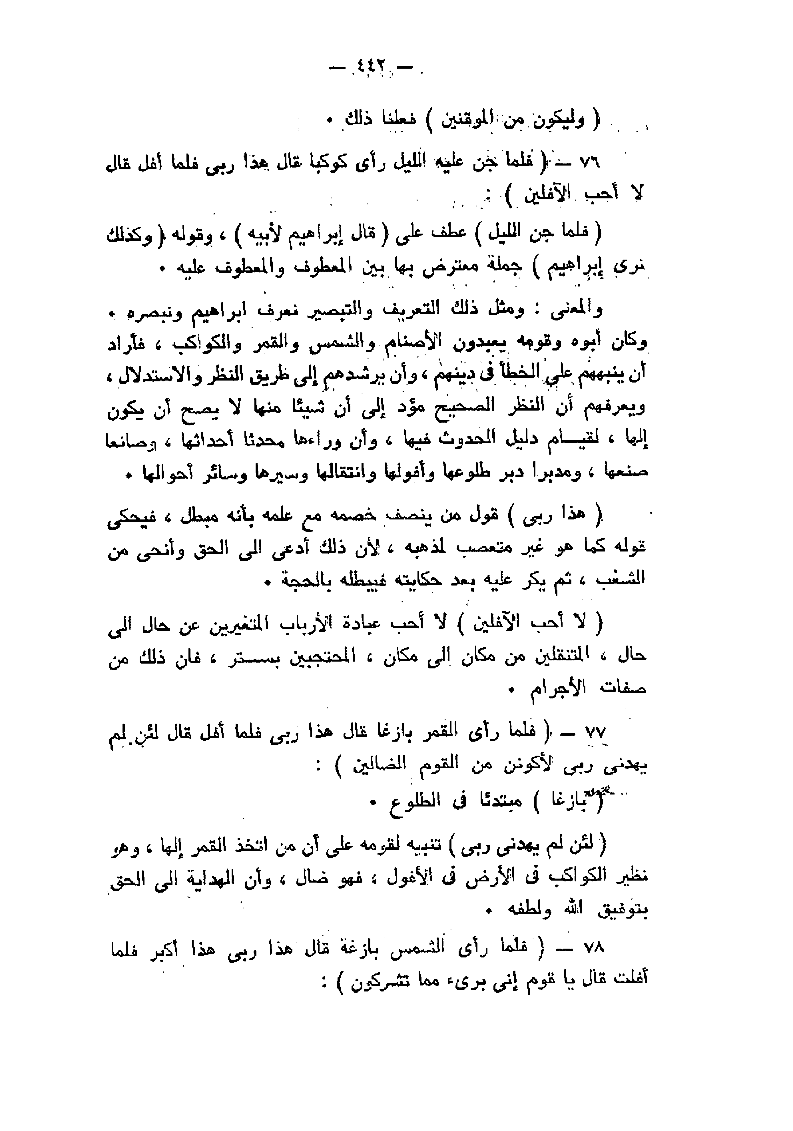 فَلَمَّا جَنَّ عَلَيْهِ اللَّيْلُ رَأى كَوْكَباً قالَ هذا رَبِّي فَلَمَّا أَفَلَ قالَ لا أُحِبُّ الْآفِلِينَ (76) فَلَمَّا رَأَى الْقَمَرَ بازِغاً قالَ هذا رَبِّي فَلَمَّا أَفَلَ قالَ لَئِنْ لَمْ يَهْدِنِي رَبِّي لَأَكُونَنَّ مِنَ الْقَوْمِ الضَّالِّينَ (77) فَلَمَّا رَأَى الشَّمْسَ بازِغَةً قالَ هذا رَبِّي هذا أَكْبَرُ فَلَمَّا أَفَلَتْ قالَ يا قَوْمِ إِنِّي بَرِيءٌ مِمَّا تُشْرِكُونَ (78)