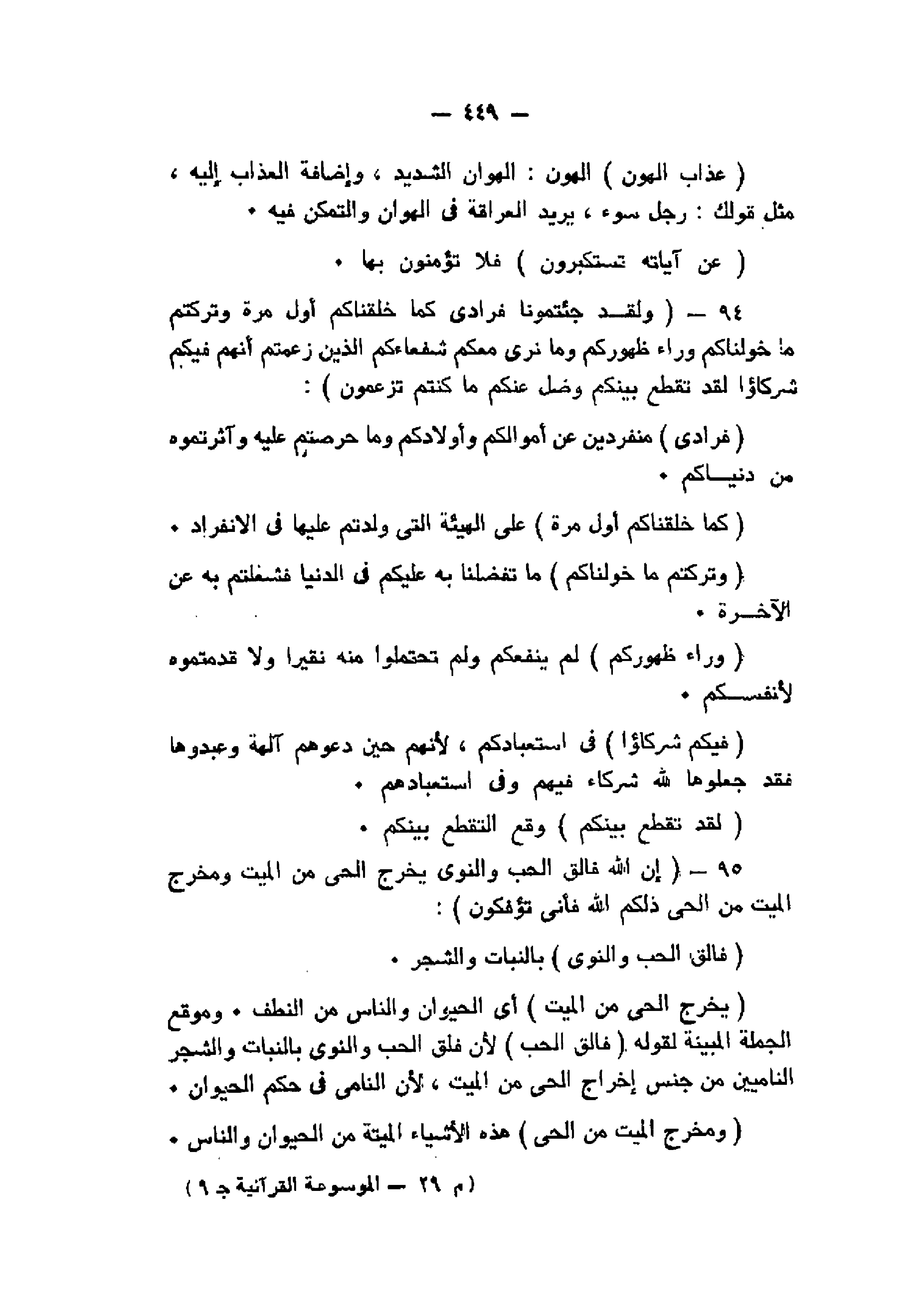 وَلَقَدْ جِئْتُمُونا فُرادى كَما خَلَقْناكُمْ أَوَّلَ مَرَّةٍ وَتَرَكْتُمْ ما خَوَّلْناكُمْ وَراءَ ظُهُورِكُمْ وَما نَرى مَعَكُمْ شُفَعاءَكُمُ الَّذِينَ زَعَمْتُمْ أَنَّهُمْ فِيكُمْ شُرَكاءُ لَقَدْ تَقَطَّعَ بَيْنَكُمْ وَضَلَّ عَنْكُمْ ما كُنْتُمْ تَزْعُمُونَ (94) إِنَّ اللَّهَ فالِقُ الْحَبِّ وَالنَّوى يُخْرِجُ الْحَيَّ مِنَ الْمَيِّتِ وَمُخْرِجُ الْمَيِّتِ مِنَ الْحَيِّ ذلِكُمُ اللَّهُ فَأَنَّى تُؤْفَكُونَ (95)