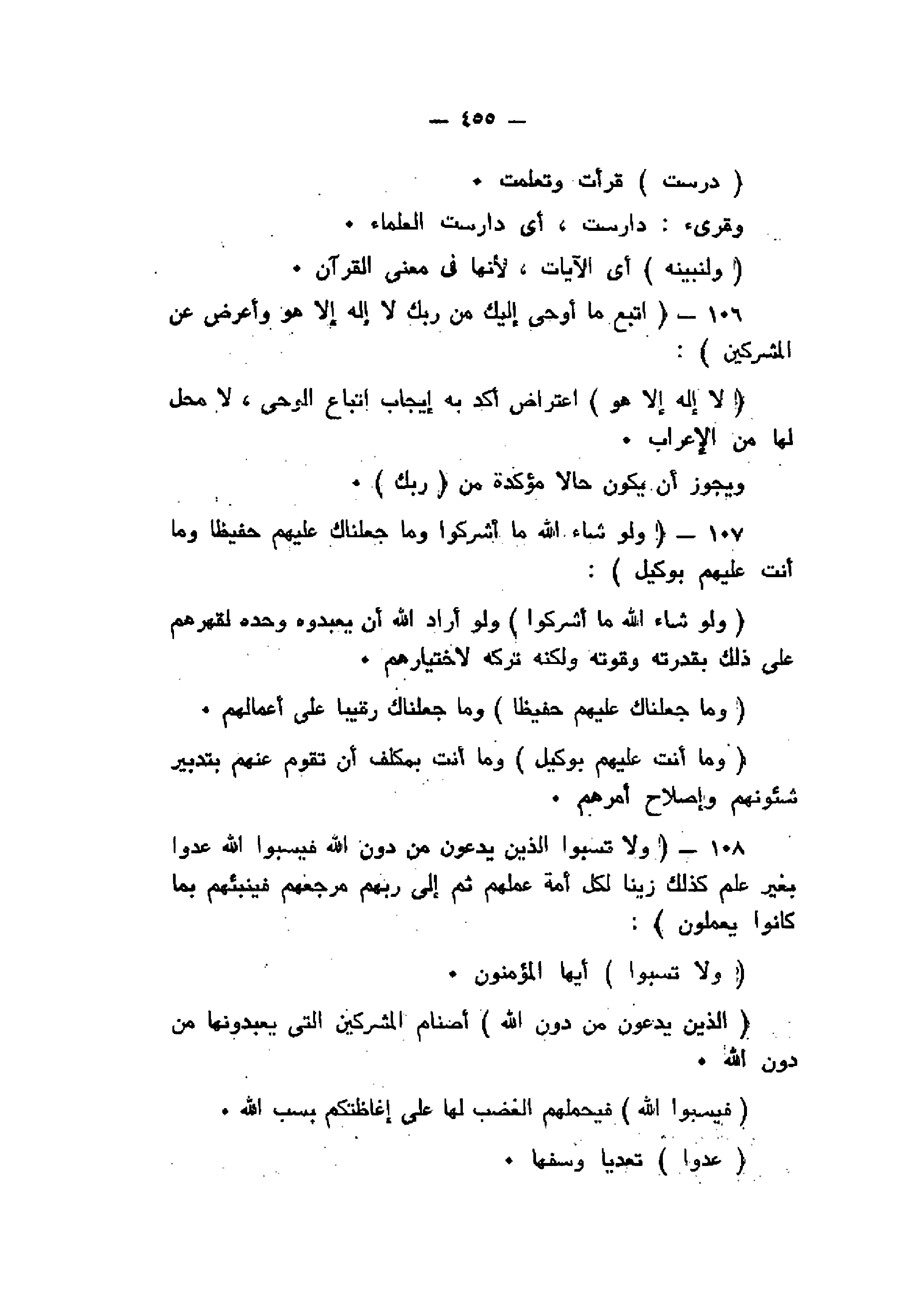 اتَّبِعْ ما أُوحِيَ إِلَيْكَ مِنْ رَبِّكَ لا إِلهَ إِلاَّ هُوَ وَأَعْرِضْ عَنِ الْمُشْرِكِينَ (106) وَلَوْ شاءَ اللَّهُ ما أَشْرَكُوا وَما جَعَلْناكَ عَلَيْهِمْ حَفِيظاً وَما أَنْتَ عَلَيْهِمْ بِوَكِيلٍ (107) وَلا تَسُبُّوا الَّذِينَ يَدْعُونَ مِنْ دُونِ اللَّهِ فَيَسُبُّوا اللَّهَ عَدْواً بِغَيْرِ عِلْمٍ كَذلِكَ زَيَّنَّا لِكُلِّ أُمَّةٍ عَمَلَهُمْ ثُمَّ إِلى رَبِّهِمْ مَرْجِعُهُمْ فَيُنَبِّئُهُمْ بِما كانُوا يَعْمَلُونَ (108)