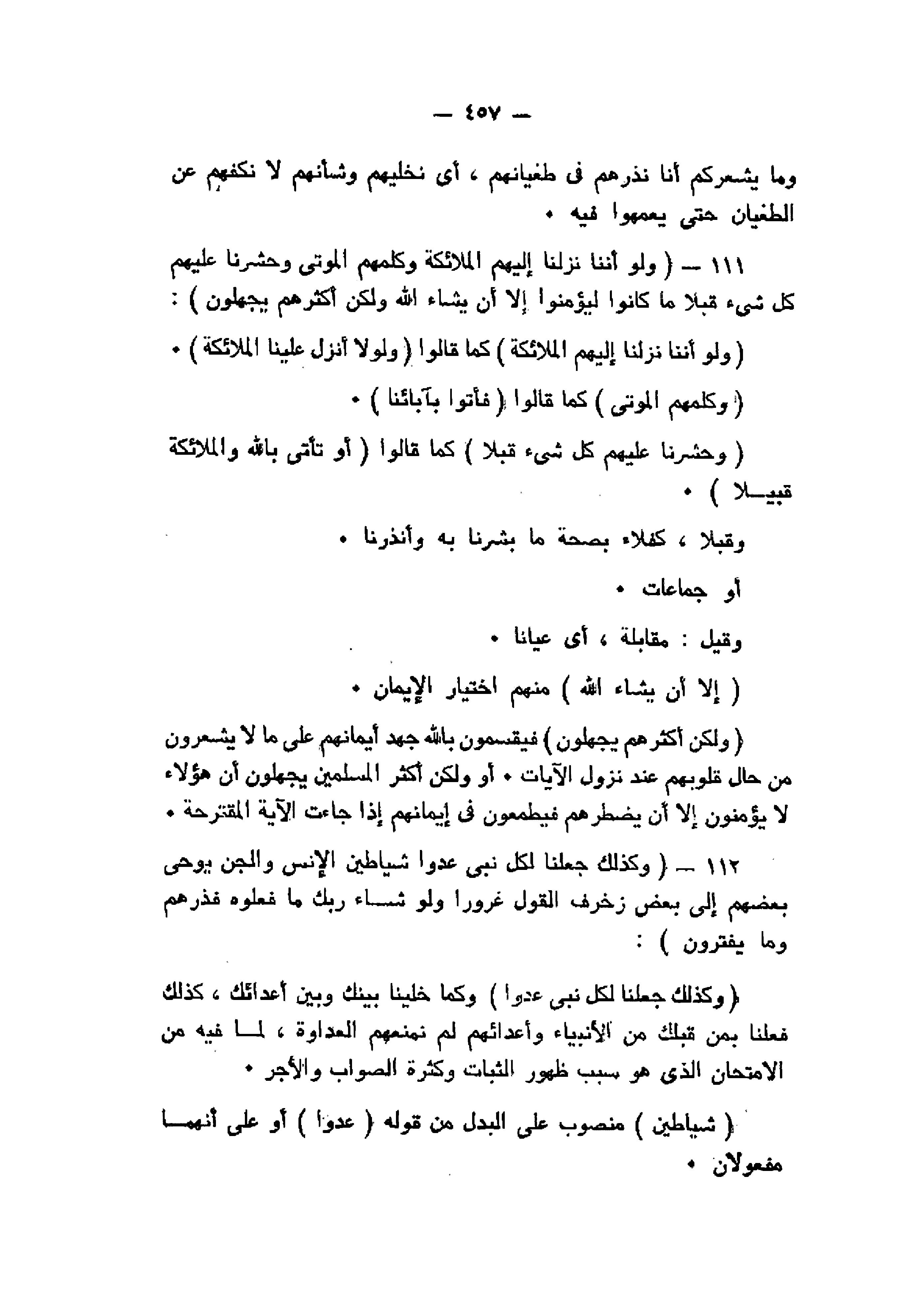 وَلَوْ أَنَّنا نَزَّلْنا إِلَيْهِمُ الْمَلائِكَةَ وَكَلَّمَهُمُ الْمَوْتى وَحَشَرْنا عَلَيْهِمْ كُلَّ شَيْءٍ قُبُلاً ما كانُوا لِيُؤْمِنُوا إِلاَّ أَنْ يَشاءَ اللَّهُ وَلكِنَّ أَكْثَرَهُمْ يَجْهَلُونَ (111) وَكَذلِكَ جَعَلْنا لِكُلِّ نَبِيٍّ عَدُوًّا شَياطِينَ الْإِنْسِ وَالْجِنِّ يُوحِي بَعْضُهُمْ إِلى بَعْضٍ زُخْرُفَ الْقَوْلِ غُرُوراً وَلَوْ شاءَ رَبُّكَ ما فَعَلُوهُ فَذَرْهُمْ وَما يَفْتَرُونَ (112)