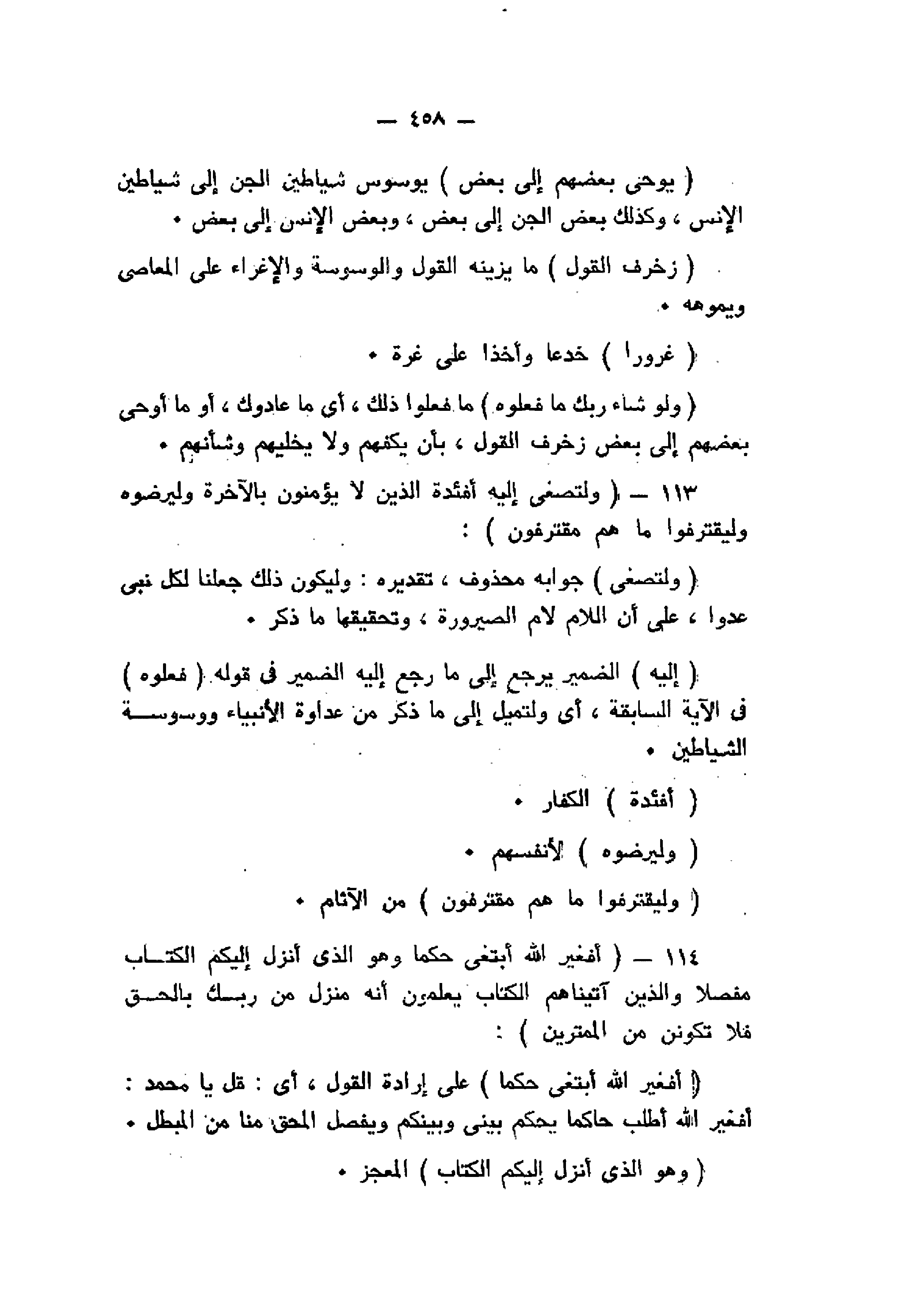 وَلِتَصْغى إِلَيْهِ أَفْئِدَةُ الَّذِينَ لا يُؤْمِنُونَ بِالْآخِرَةِ وَلِيَرْضَوْهُ وَلِيَقْتَرِفُوا ما هُمْ مُقْتَرِفُونَ (113) أَفَغَيْرَ اللَّهِ أَبْتَغِي حَكَماً وَهُوَ الَّذِي أَنْزَلَ إِلَيْكُمُ الْكِتابَ مُفَصَّلاً وَالَّذِينَ آتَيْناهُمُ الْكِتابَ يَعْلَمُونَ أَنَّهُ مُنَزَّلٌ مِنْ رَبِّكَ بِالْحَقِّ فَلا تَكُونَنَّ مِنَ الْمُمْتَرِينَ (114)