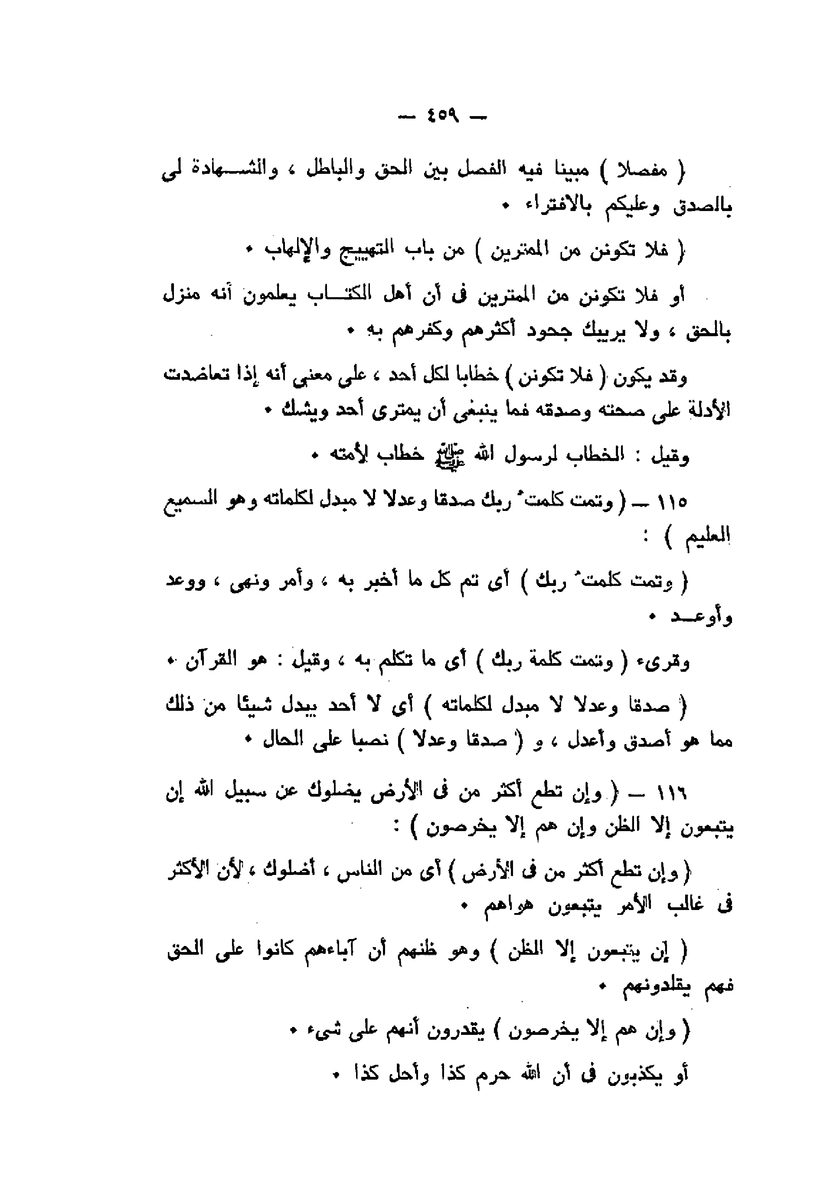 وَتَمَّتْ كَلِمَةُ رَبِّكَ صِدْقاً وَعَدْلاً لا مُبَدِّلَ لِكَلِماتِهِ وَهُوَ السَّمِيعُ الْعَلِيمُ (115) وَإِنْ تُطِعْ أَكْثَرَ مَنْ فِي الْأَرْضِ يُضِلُّوكَ عَنْ سَبِيلِ اللَّهِ إِنْ يَتَّبِعُونَ إِلاَّ الظَّنَّ وَإِنْ هُمْ إِلاَّ يَخْرُصُونَ (116)