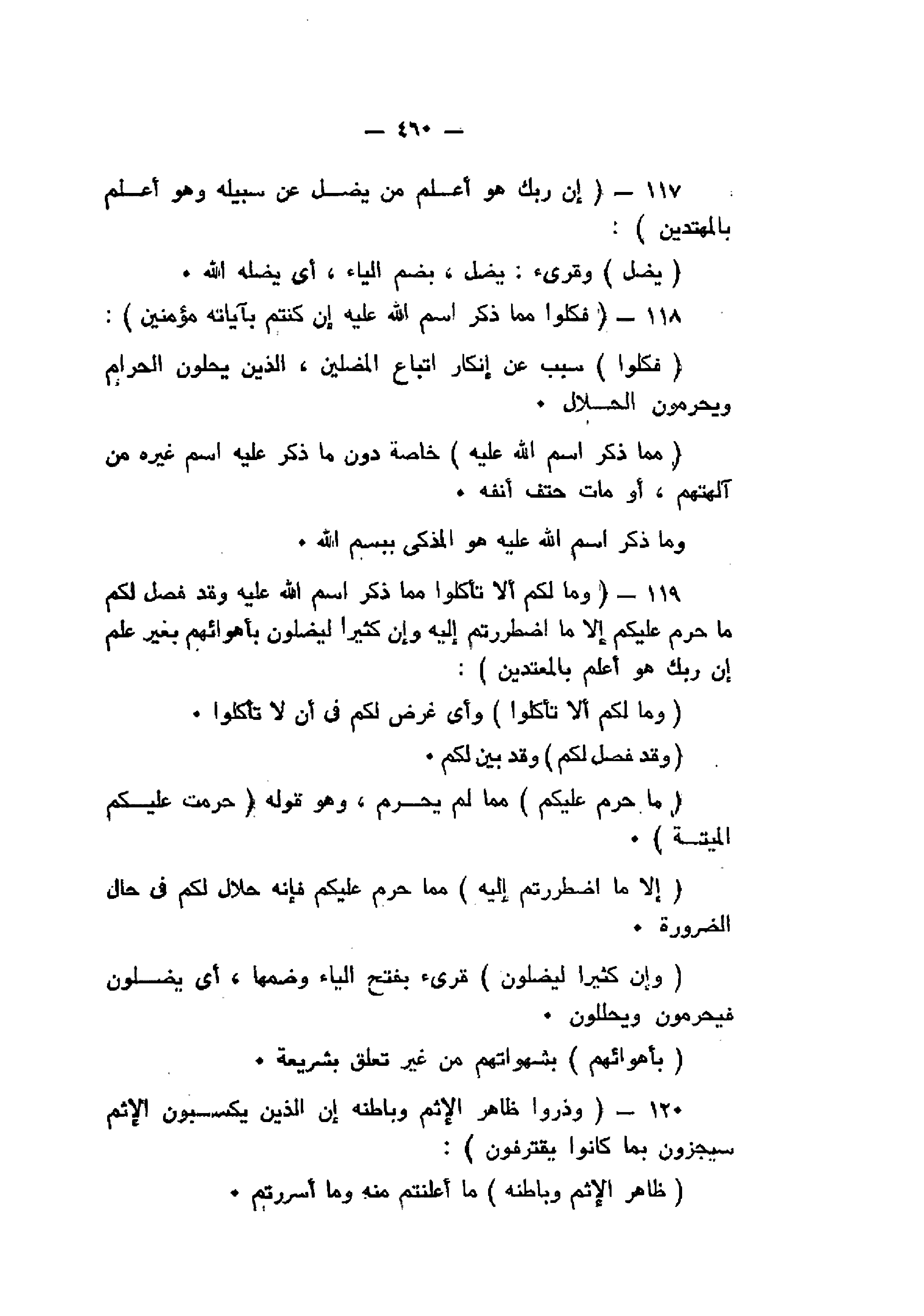 إِنَّ رَبَّكَ هُوَ أَعْلَمُ مَنْ يَضِلُّ عَنْ سَبِيلِهِ وَهُوَ أَعْلَمُ بِالْمُهْتَدِينَ (117) فَكُلُوا مِمَّا ذُكِرَ اسْمُ اللَّهِ عَلَيْهِ إِنْ كُنْتُمْ بِآياتِهِ مُؤْمِنِينَ (118) وَما لَكُمْ أَلاَّ تَأْكُلُوا مِمَّا ذُكِرَ اسْمُ اللَّهِ عَلَيْهِ وَقَدْ فَصَّلَ لَكُمْ ما حَرَّمَ عَلَيْكُمْ إِلاَّ مَا اضْطُرِرْتُمْ إِلَيْهِ وَإِنَّ كَثِيراً لَيُضِلُّونَ بِأَهْوائِهِمْ بِغَيْرِ عِلْمٍ إِنَّ رَبَّكَ هُوَ أَعْلَمُ بِالْمُعْتَدِينَ (119) وَذَرُوا ظاهِرَ الْإِثْمِ وَباطِنَهُ إِنَّ الَّذِينَ يَكْسِبُونَ الْإِثْمَ سَيُجْزَوْنَ بِما كانُوا يَقْتَرِفُونَ (120)