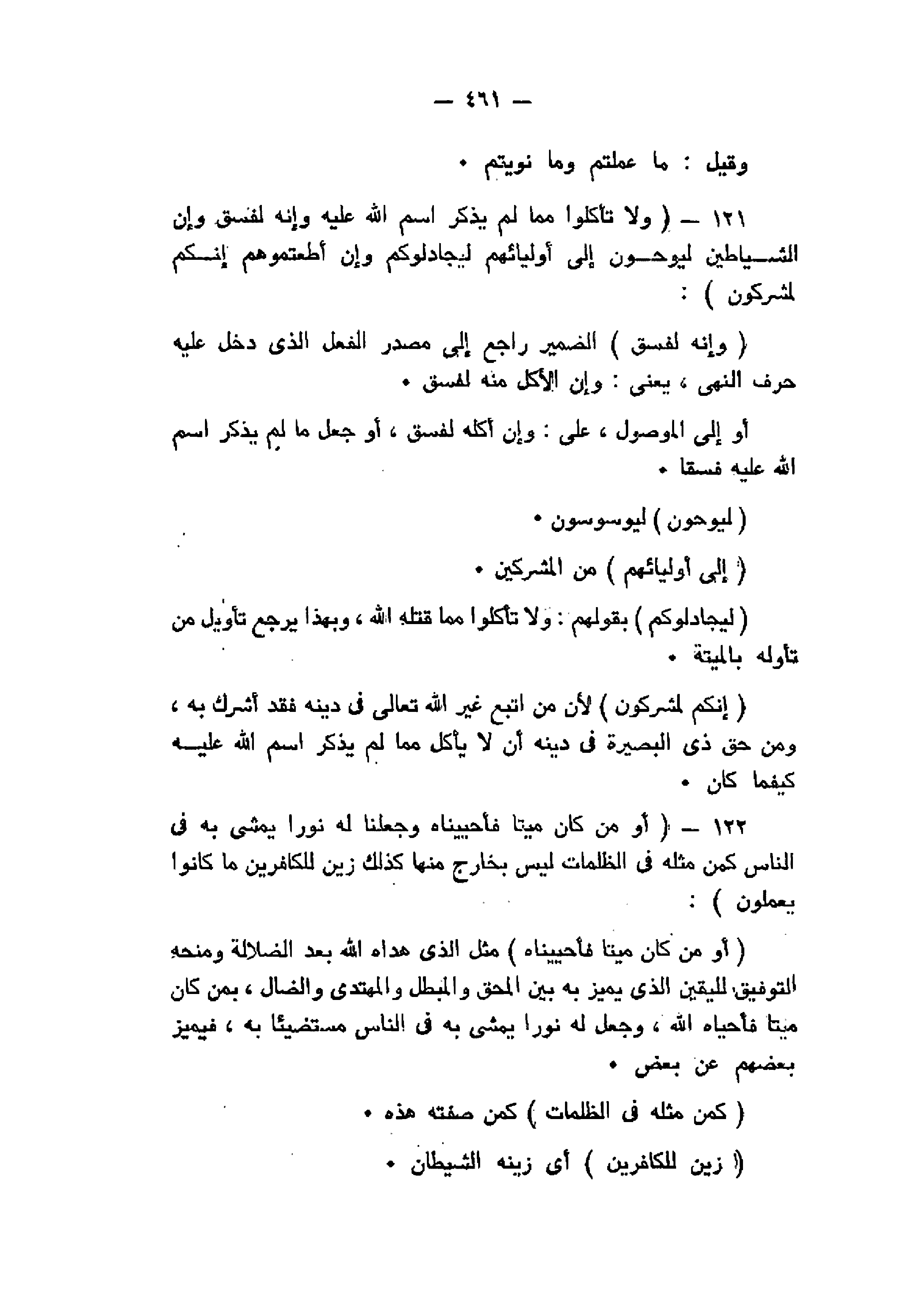 وَلا تَأْكُلُوا مِمَّا لَمْ يُذْكَرِ اسْمُ اللَّهِ عَلَيْهِ وَإِنَّهُ لَفِسْقٌ وَإِنَّ الشَّياطِينَ لَيُوحُونَ إِلى أَوْلِيائِهِمْ لِيُجادِلُوكُمْ وَإِنْ أَطَعْتُمُوهُمْ إِنَّكُمْ لَمُشْرِكُونَ (121) أَوَمَنْ كانَ مَيْتاً فَأَحْيَيْناهُ وَجَعَلْنا لَهُ نُوراً يَمْشِي بِهِ فِي النَّاسِ كَمَنْ مَثَلُهُ فِي الظُّلُماتِ لَيْسَ بِخارِجٍ مِنْها كَذلِكَ زُيِّنَ لِلْكافِرِينَ ما كانُوا يَعْمَلُونَ (122)