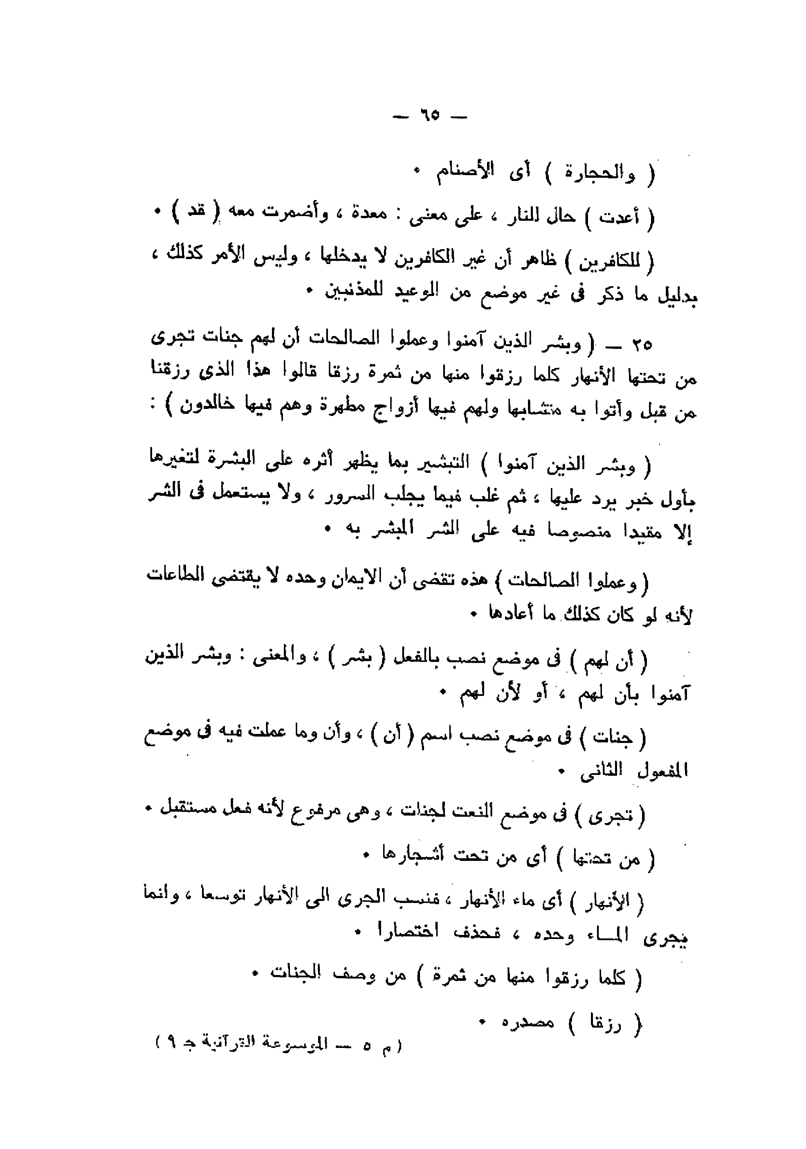 25- وَبَشِّرِ الَّذِينَ آمَنُوا وَعَمِلُوا الصَّالِحاتِ أَنَّ لَهُمْ جَنَّاتٍ تَجْرِي مِنْ تَحْتِهَا الْأَنْهارُ كُلَّما رُزِقُوا مِنْها مِنْ ثَمَرَةٍ رِزْقاً قالُوا هذَا الَّذِي رُزِقْنا مِنْ قَبْلُ وَأُتُوا بِهِ مُتَشابِهاً وَلَهُمْ فِيها أَزْواجٌ مُطَهَّرَةٌ وَهُمْ فِيها خالِدُونَ: