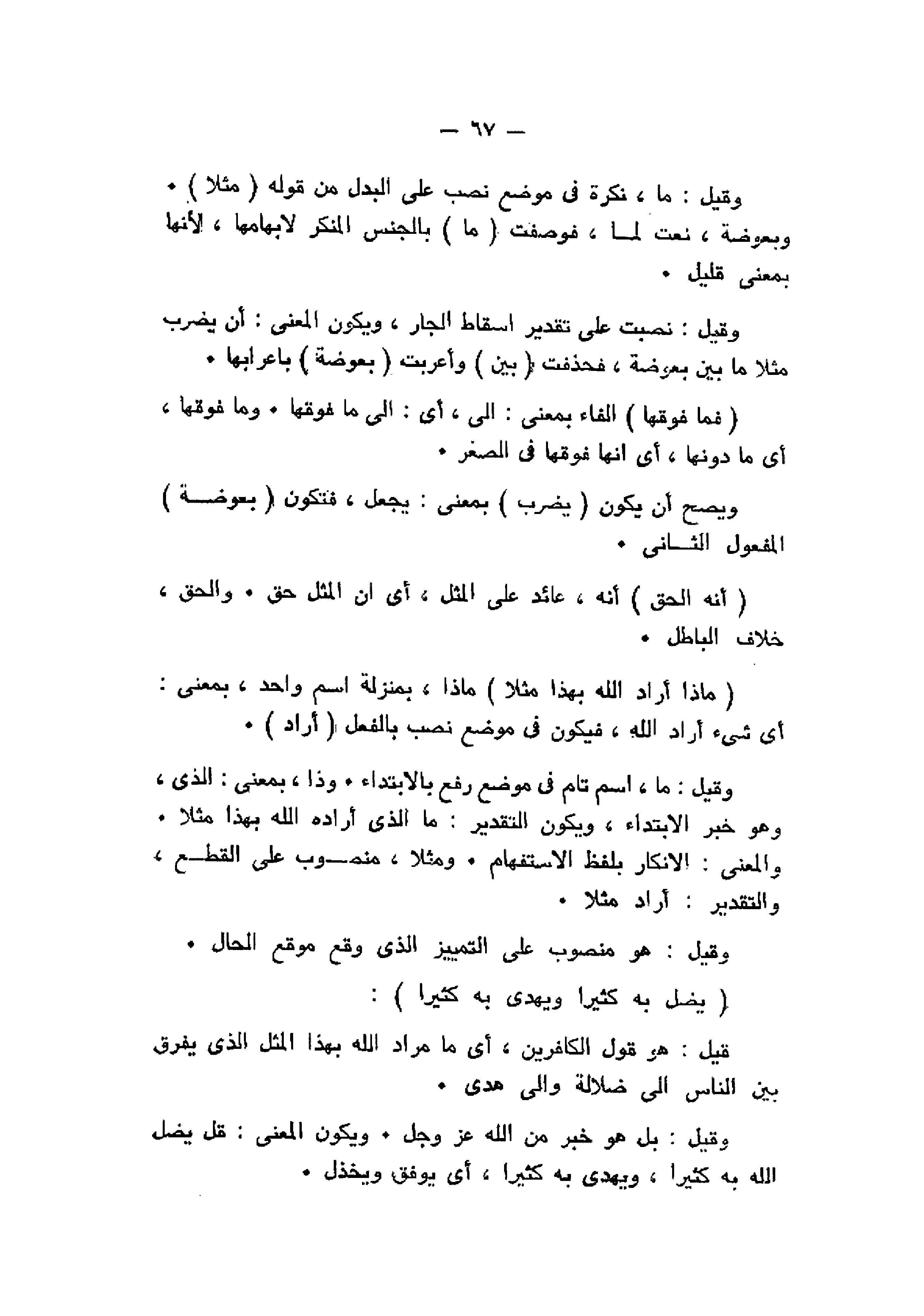 وقيل: نصبت على تقدير إسقاط الجار، ويكون المعنى: أن يضرب مثلا ما بين بعوضة، فحذفت (بين) وأعربت بَعُوضَةً باعرابها.