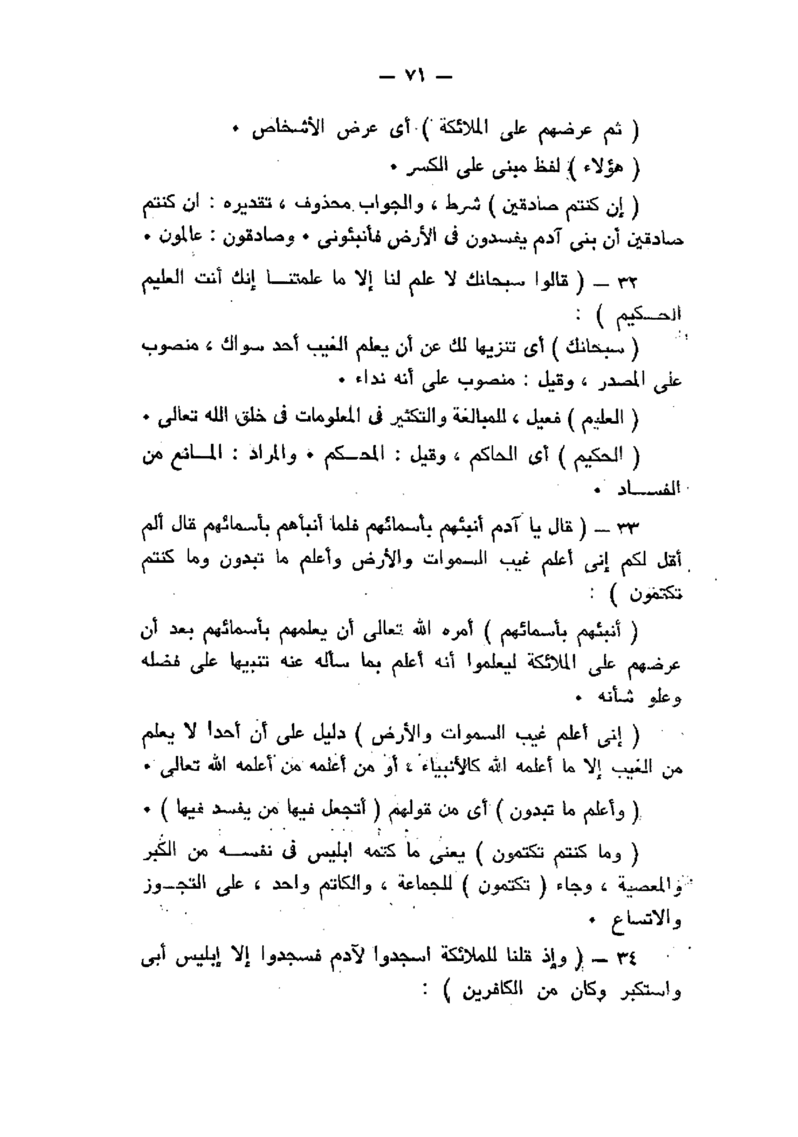 قالُوا سُبْحانَكَ لا عِلْمَ لَنا إِلاَّ ما عَلَّمْتَنا إِنَّكَ أَنْتَ الْعَلِيمُ الْحَكِيمُ (32) قالَ يا آدَمُ أَنْبِئْهُمْ بِأَسْمائِهِمْ فَلَمَّا أَنْبَأَهُمْ بِأَسْمائِهِمْ قالَ أَلَمْ أَقُلْ لَكُمْ إِنِّي أَعْلَمُ غَيْبَ السَّماواتِ وَالْأَرْضِ وَأَعْلَمُ ما تُبْدُونَ وَما كُنْتُمْ تَكْتُمُونَ (33) وَإِذْ قُلْنا لِلْمَلائِكَةِ اسْجُدُوا لِآدَمَ فَسَجَدُوا إِلاَّ إِبْلِيسَ أَبى وَاسْتَكْبَرَ وَكانَ مِنَ الْكافِرِينَ (34)