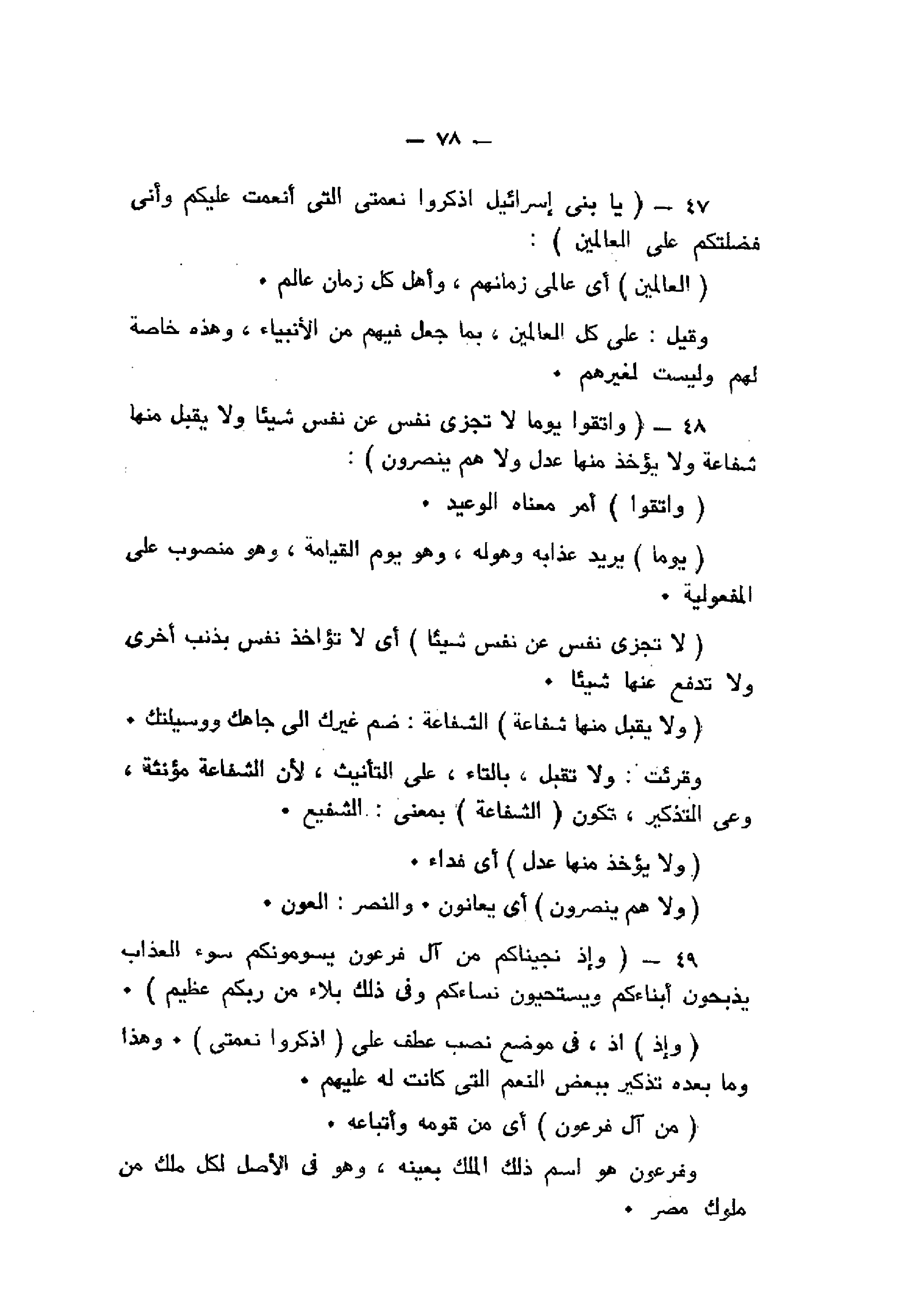 يا بَنِي إِسْرائِيلَ اذْكُرُوا نِعْمَتِيَ الَّتِي أَنْعَمْتُ عَلَيْكُمْ وَأَنِّي فَضَّلْتُكُمْ عَلَى الْعالَمِينَ (47) وَاتَّقُوا يَوْماً لا تَجْزِي نَفْسٌ عَنْ نَفْسٍ شَيْئاً وَلا يُقْبَلُ مِنْها شَفاعَةٌ وَلا يُؤْخَذُ مِنْها عَدْلٌ وَلا هُمْ يُنْصَرُونَ (48) وَإِذْ نَجَّيْناكُمْ مِنْ آلِ فِرْعَوْنَ يَسُومُونَكُمْ سُوءَ الْعَذابِ يُذَبِّحُونَ أَبْناءَكُمْ وَيَسْتَحْيُونَ نِساءَكُمْ وَفِي ذلِكُمْ بَلاءٌ مِنْ رَبِّكُمْ عَظِيمٌ (49)