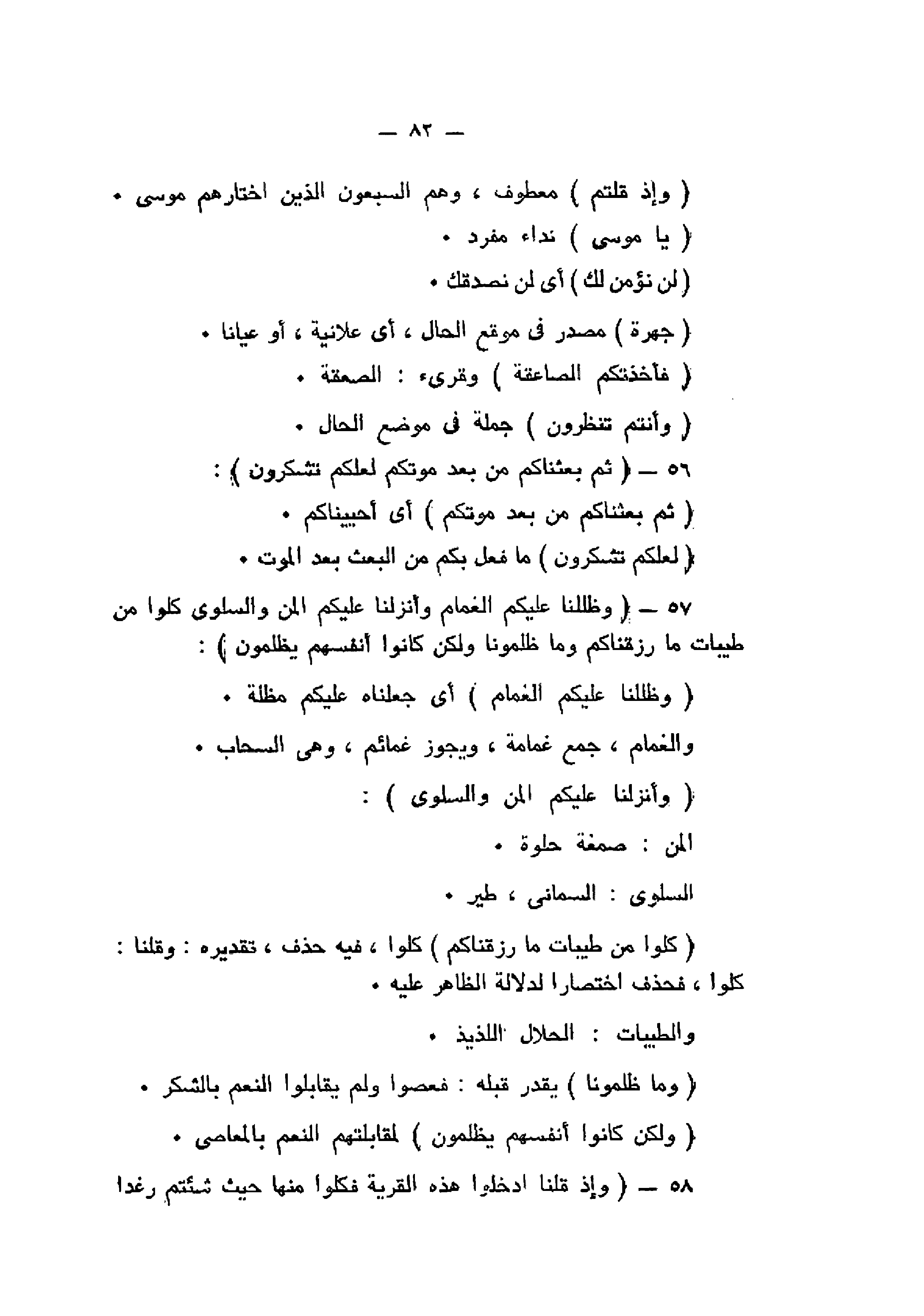 ثُمَّ بَعَثْناكُمْ مِنْ بَعْدِ مَوْتِكُمْ لَعَلَّكُمْ تَشْكُرُونَ (56) وَظَلَّلْنا عَلَيْكُمُ الْغَمامَ وَأَنْزَلْنا عَلَيْكُمُ الْمَنَّ وَالسَّلْوى كُلُوا مِنْ طَيِّباتِ ما رَزَقْناكُمْ وَما ظَلَمُونا وَلكِنْ كانُوا أَنْفُسَهُمْ يَظْلِمُونَ (57) وَإِذْ قُلْنَا ادْخُلُوا هذِهِ الْقَرْيَةَ فَكُلُوا مِنْها حَيْثُ شِئْتُمْ رَغَداً وَادْخُلُوا الْبابَ سُجَّداً وَقُولُوا حِطَّةٌ نَغْفِرْ لَكُمْ خَطاياكُمْ وَسَنَزِيدُ الْمُحْسِنِينَ (58)