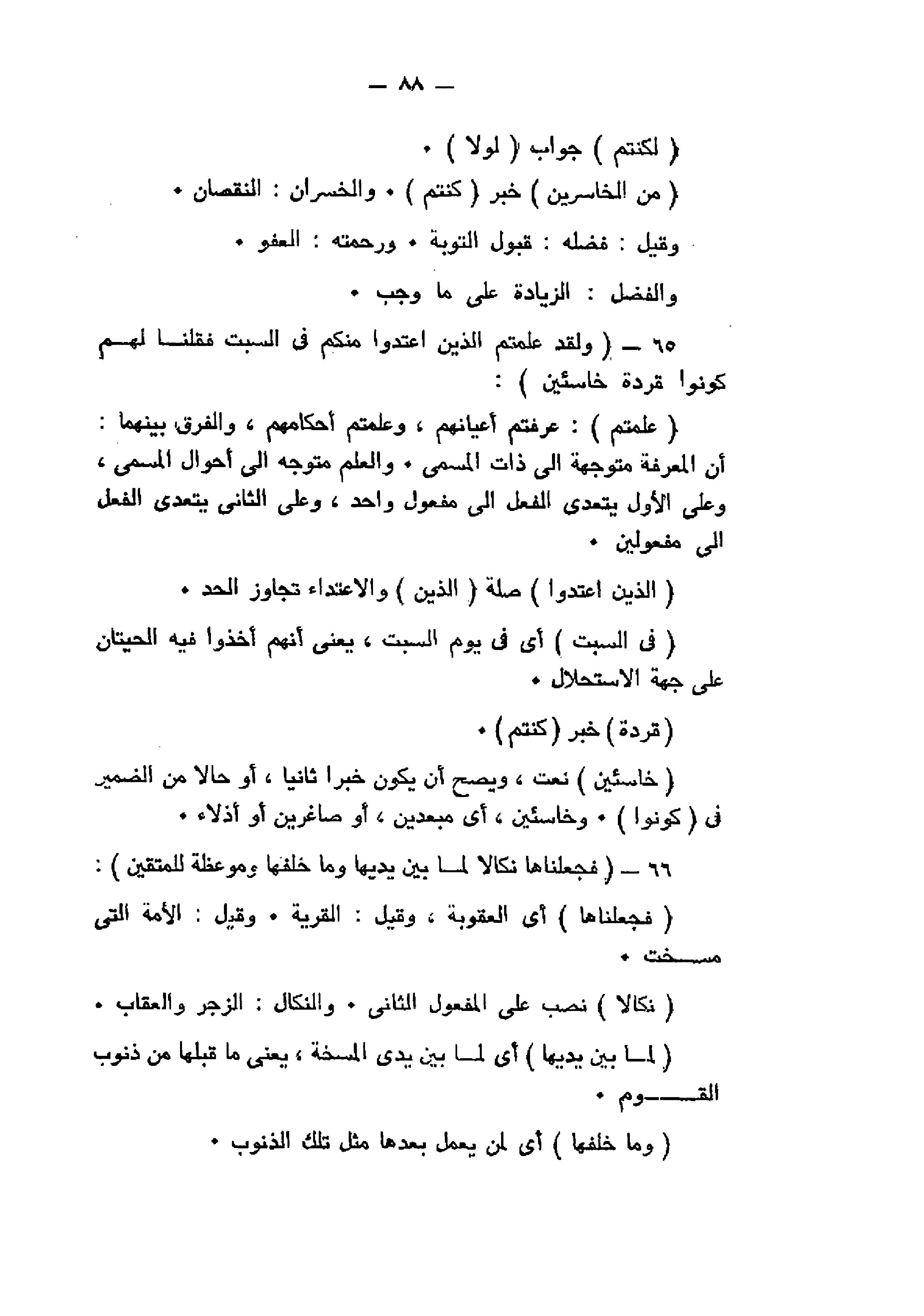 وَلَقَدْ عَلِمْتُمُ الَّذِينَ اعْتَدَوْا مِنْكُمْ فِي السَّبْتِ فَقُلْنا لَهُمْ كُونُوا قِرَدَةً خاسِئِينَ (65) فَجَعَلْناها نَكالاً لِما بَيْنَ يَدَيْها وَما خَلْفَها وَمَوْعِظَةً لِلْمُتَّقِينَ (66)