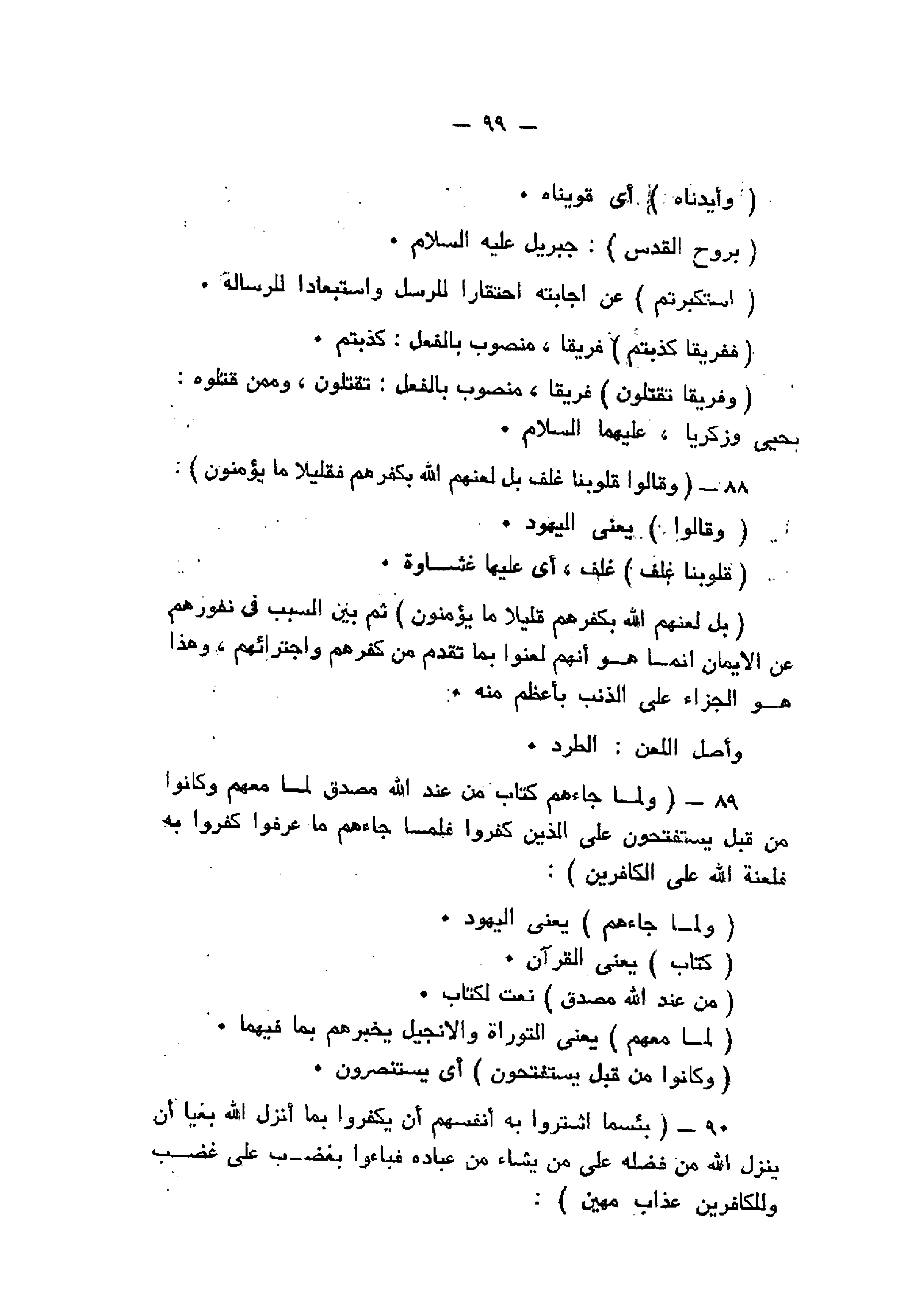 وَقالُوا قُلُوبُنا غُلْفٌ بَلْ لَعَنَهُمُ اللَّهُ بِكُفْرِهِمْ فَقَلِيلاً ما يُؤْمِنُونَ (88) وَلَمَّا جاءَهُمْ كِتابٌ مِنْ عِنْدِ اللَّهِ مُصَدِّقٌ لِما مَعَهُمْ وَكانُوا مِنْ قَبْلُ يَسْتَفْتِحُونَ عَلَى الَّذِينَ كَفَرُوا فَلَمَّا جاءَهُمْ ما عَرَفُوا كَفَرُوا بِهِ فَلَعْنَةُ اللَّهِ عَلَى الْكافِرِينَ (89) بِئْسَمَا اشْتَرَوْا بِهِ أَنْفُسَهُمْ أَنْ يَكْفُرُوا بِما أَنْزَلَ اللَّهُ بَغْياً أَنْ يُنَزِّلَ اللَّهُ مِنْ فَضْلِهِ عَلى مَنْ يَشاءُ مِنْ عِبادِهِ فَباؤُ بِغَضَبٍ عَلى غَضَبٍ وَلِلْكافِرِينَ عَذابٌ مُهِينٌ (90)