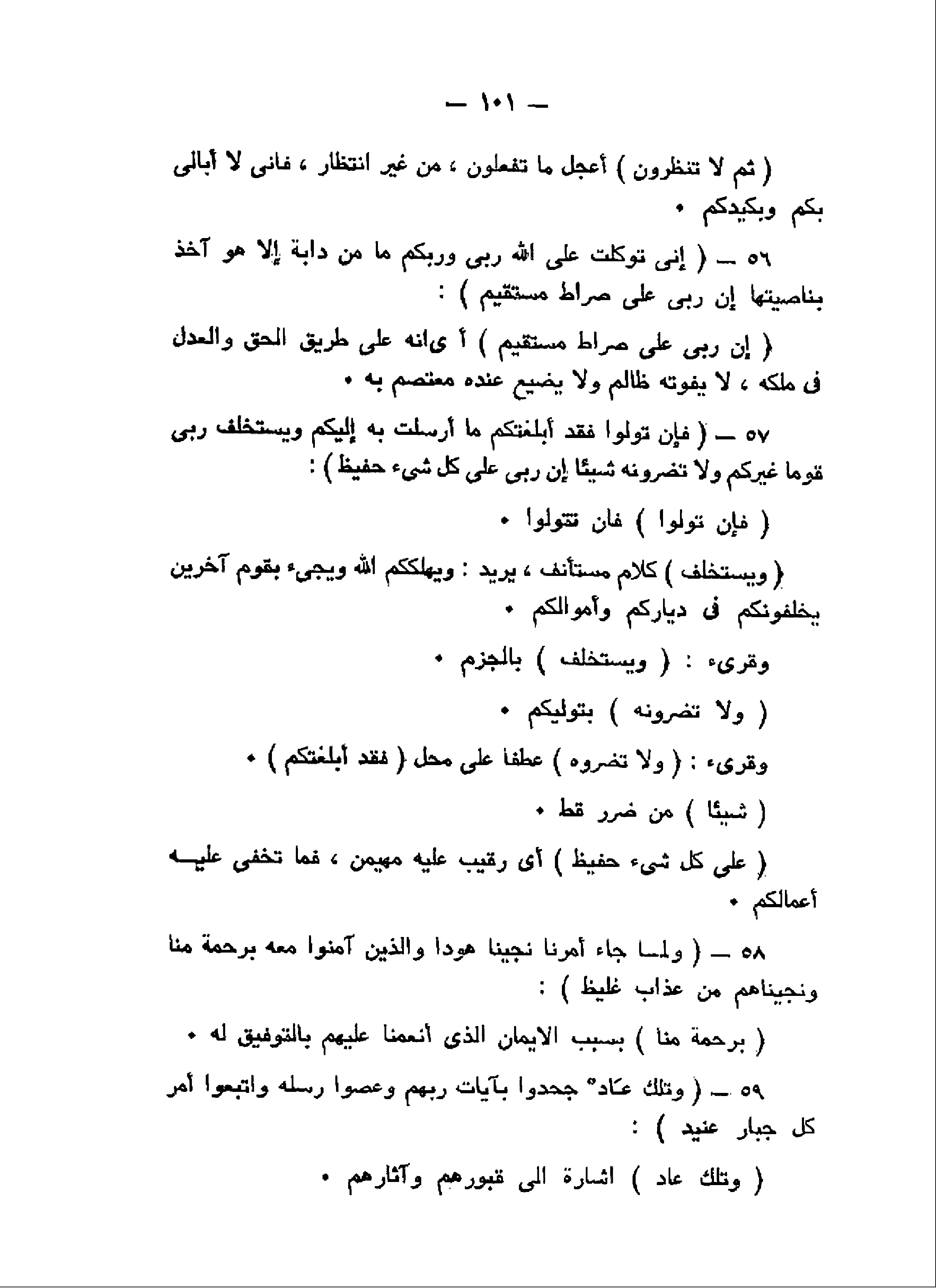 إِنِّي تَوَكَّلْتُ عَلَى اللَّهِ رَبِّي وَرَبِّكُمْ ما مِنْ دَابَّةٍ إِلاَّ هُوَ آخِذٌ بِناصِيَتِها إِنَّ رَبِّي عَلى صِراطٍ مُسْتَقِيمٍ (56) فَإِنْ تَوَلَّوْا فَقَدْ أَبْلَغْتُكُمْ ما أُرْسِلْتُ بِهِ إِلَيْكُمْ وَيَسْتَخْلِفُ رَبِّي قَوْماً غَيْرَكُمْ وَلا تَضُرُّونَهُ شَيْئاً إِنَّ رَبِّي عَلى كُلِّ شَيْءٍ حَفِيظٌ (57) وَلَمَّا جاءَ أَمْرُنا نَجَّيْنا هُوداً وَالَّذِينَ آمَنُوا مَعَهُ بِرَحْمَةٍ مِنَّا وَنَجَّيْناهُمْ مِنْ عَذابٍ غَلِيظٍ (58) وَتِلْكَ عادٌ جَحَدُوا بِآياتِ رَبِّهِمْ وَعَصَوْا رُسُلَهُ وَاتَّبَعُوا أَمْرَ كُلِّ جَبَّارٍ عَنِيدٍ (59)