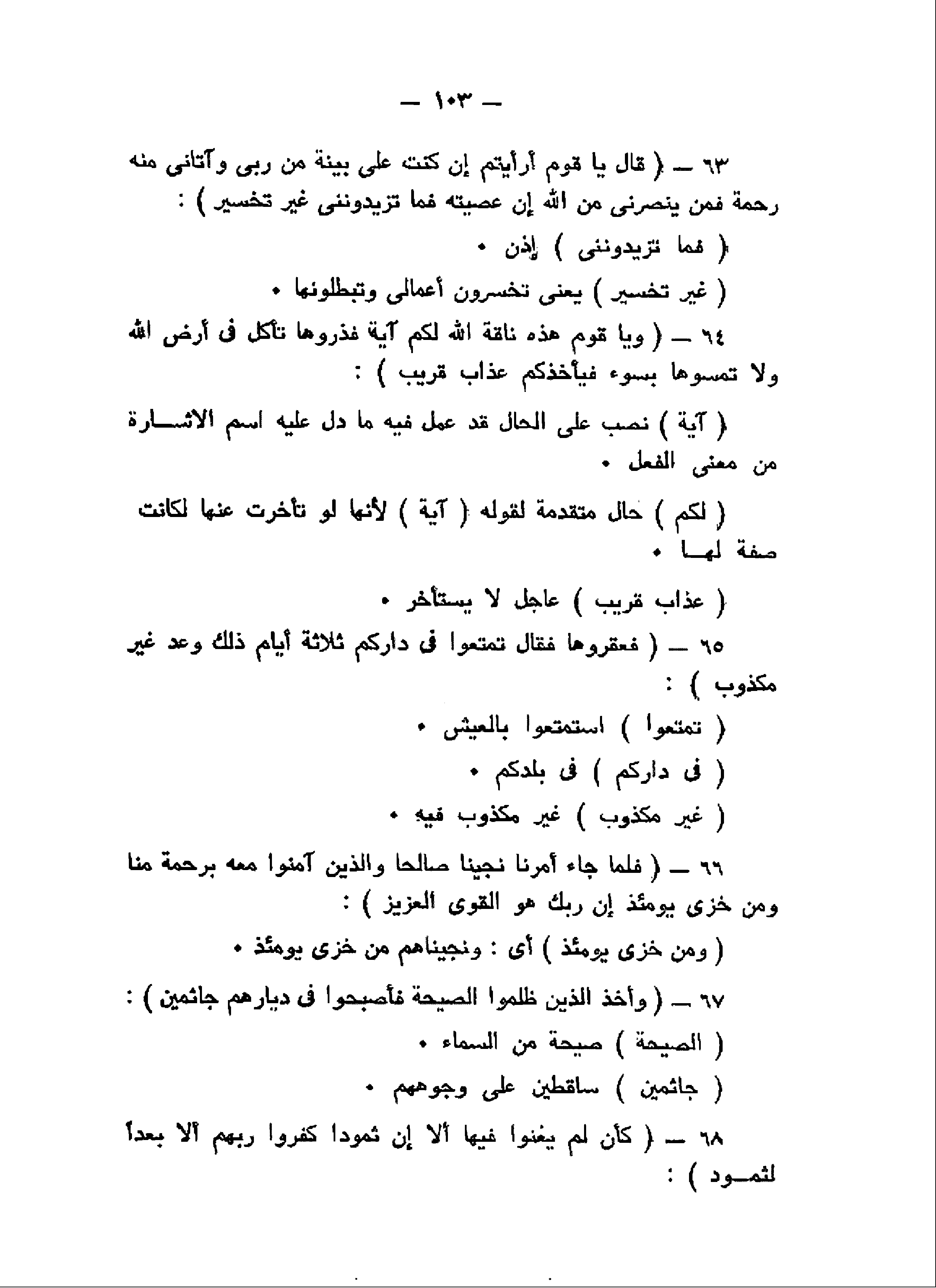 قالَ يا قَوْمِ أَرَأَيْتُمْ إِنْ كُنْتُ عَلى بَيِّنَةٍ مِنْ رَبِّي وَآتانِي مِنْهُ رَحْمَةً فَمَنْ يَنْصُرُنِي مِنَ اللَّهِ إِنْ عَصَيْتُهُ فَما تَزِيدُونَنِي غَيْرَ تَخْسِيرٍ (63) وَيا قَوْمِ هذِهِ ناقَةُ اللَّهِ لَكُمْ آيَةً فَذَرُوها تَأْكُلْ فِي أَرْضِ اللَّهِ وَلا تَمَسُّوها بِسُوءٍ فَيَأْخُذَكُمْ عَذابٌ قَرِيبٌ (64) فَعَقَرُوها فَقالَ تَمَتَّعُوا فِي دارِكُمْ ثَلاثَةَ أَيَّامٍ ذلِكَ وَعْدٌ غَيْرُ مَكْذُوبٍ (65) فَلَمَّا جاءَ أَمْرُنا نَجَّيْنا صالِحاً وَالَّذِينَ آمَنُوا مَعَهُ بِرَحْمَةٍ مِنَّا وَمِنْ خِزْيِ يَوْمِئِذٍ إِنَّ رَبَّكَ هُوَ الْقَوِيُّ الْعَزِيزُ (66) وَأَخَذَ الَّذِينَ ظَلَمُوا الصَّيْحَةُ فَأَصْبَحُوا فِي دِيارِهِمْ جاثِمِينَ (67)