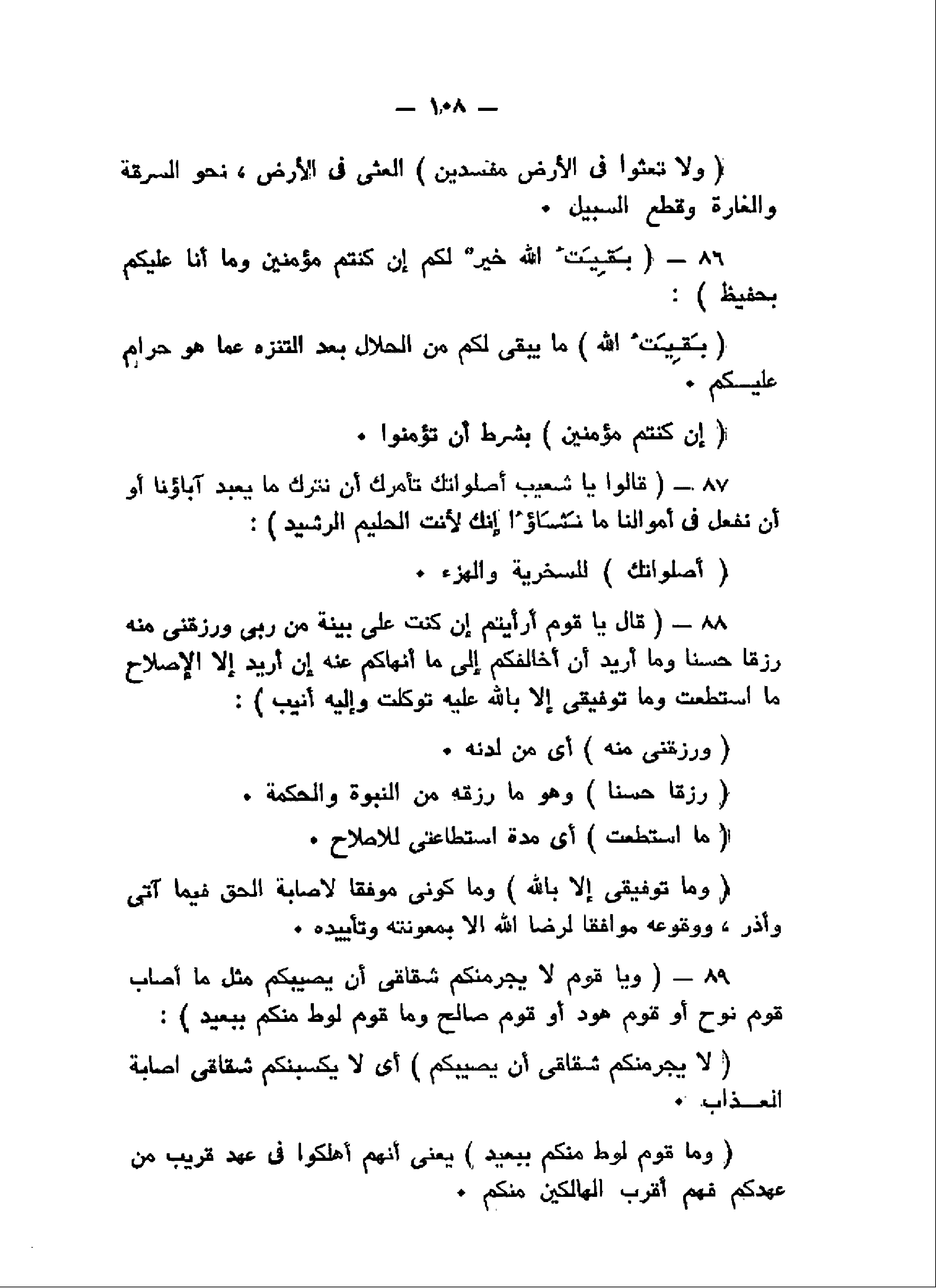 بَقِيَّتُ اللَّهِ خَيْرٌ لَكُمْ إِنْ كُنْتُمْ مُؤْمِنِينَ وَما أَنَا عَلَيْكُمْ بِحَفِيظٍ (86) قالُوا يا شُعَيْبُ أَصَلاتُكَ تَأْمُرُكَ أَنْ نَتْرُكَ ما يَعْبُدُ آباؤُنا أَوْ أَنْ نَفْعَلَ فِي أَمْوالِنا ما نَشؤُا إِنَّكَ لَأَنْتَ الْحَلِيمُ الرَّشِيدُ (87) قالَ يا قَوْمِ أَرَأَيْتُمْ إِنْ كُنْتُ عَلى بَيِّنَةٍ مِنْ رَبِّي وَرَزَقَنِي مِنْهُ رِزْقاً حَسَناً وَما أُرِيدُ أَنْ أُخالِفَكُمْ إِلى ما أَنْهاكُمْ عَنْهُ إِنْ أُرِيدُ إِلاَّ الْإِصْلاحَ مَا اسْتَطَعْتُ وَما تَوْفِيقِي إِلاَّ بِاللَّهِ عَلَيْهِ تَوَكَّلْتُ وَإِلَيْهِ أُنِيبُ (88) وَيا قَوْمِ لا يَجْرِمَنَّكُمْ شِقاقِي أَنْ يُصِيبَكُمْ مِثْلُ ما أَصابَ قَوْمَ نُوحٍ أَوْ قَوْمَ هُودٍ أَوْ قَوْمَ صالِحٍ وَما قَوْمُ لُوطٍ مِنْكُمْ بِبَعِيدٍ (89)