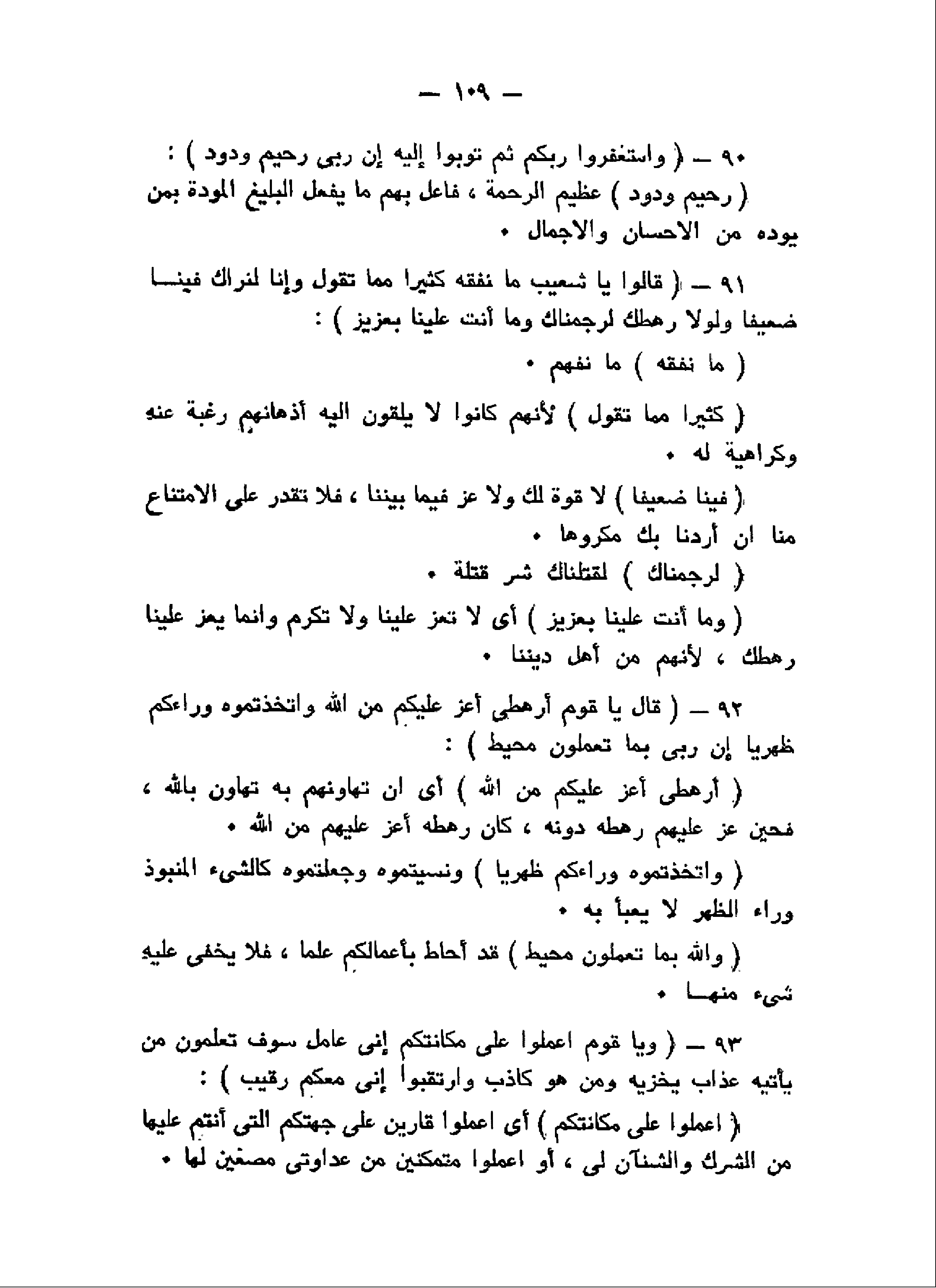 وَاسْتَغْفِرُوا رَبَّكُمْ ثُمَّ تُوبُوا إِلَيْهِ إِنَّ رَبِّي رَحِيمٌ وَدُودٌ (90) قالُوا يا شُعَيْبُ ما نَفْقَهُ كَثِيراً مِمَّا تَقُولُ وَإِنَّا لَنَراكَ فِينا ضَعِيفاً وَلَوْلا رَهْطُكَ لَرَجَمْناكَ وَما أَنْتَ عَلَيْنا بِعَزِيزٍ (91) قالَ يا قَوْمِ أَرَهْطِي أَعَزُّ عَلَيْكُمْ مِنَ اللَّهِ وَاتَّخَذْتُمُوهُ وَراءَكُمْ ظِهْرِيًّا إِنَّ رَبِّي بِما تَعْمَلُونَ مُحِيطٌ (92) وَيا قَوْمِ اعْمَلُوا عَلى مَكانَتِكُمْ إِنِّي عامِلٌ سَوْفَ تَعْلَمُونَ مَنْ يَأْتِيهِ عَذابٌ يُخْزِيهِ وَمَنْ هُوَ كاذِبٌ وَارْتَقِبُوا إِنِّي مَعَكُمْ رَقِيبٌ (93)