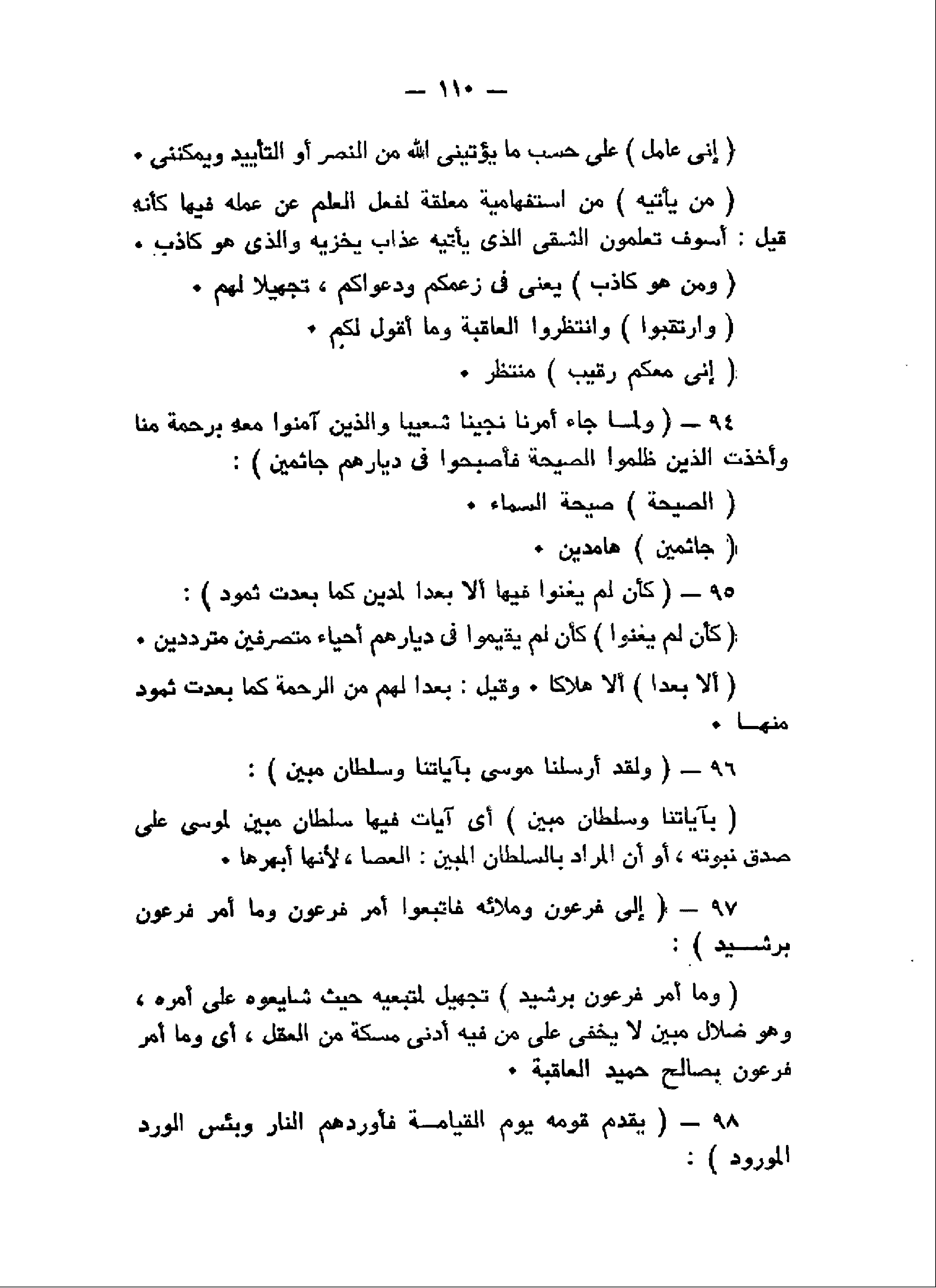 وَلَمَّا جاءَ أَمْرُنا نَجَّيْنا شُعَيْباً وَالَّذِينَ آمَنُوا مَعَهُ بِرَحْمَةٍ مِنَّا وَأَخَذَتِ الَّذِينَ ظَلَمُوا الصَّيْحَةُ فَأَصْبَحُوا فِي دِيارِهِمْ جاثِمِينَ (94) كَأَنْ لَمْ يَغْنَوْا فِيها أَلا بُعْداً لِمَدْيَنَ كَما بَعِدَتْ ثَمُودُ (95) وَلَقَدْ أَرْسَلْنا مُوسى بِآياتِنا وَسُلْطانٍ مُبِينٍ (96) إِلى فِرْعَوْنَ وَمَلائِهِ فَاتَّبَعُوا أَمْرَ فِرْعَوْنَ وَما أَمْرُ فِرْعَوْنَ بِرَشِيدٍ (97) يَقْدُمُ قَوْمَهُ يَوْمَ الْقِيامَةِ فَأَوْرَدَهُمُ النَّارَ وَبِئْسَ الْوِرْدُ الْمَوْرُودُ (98)
