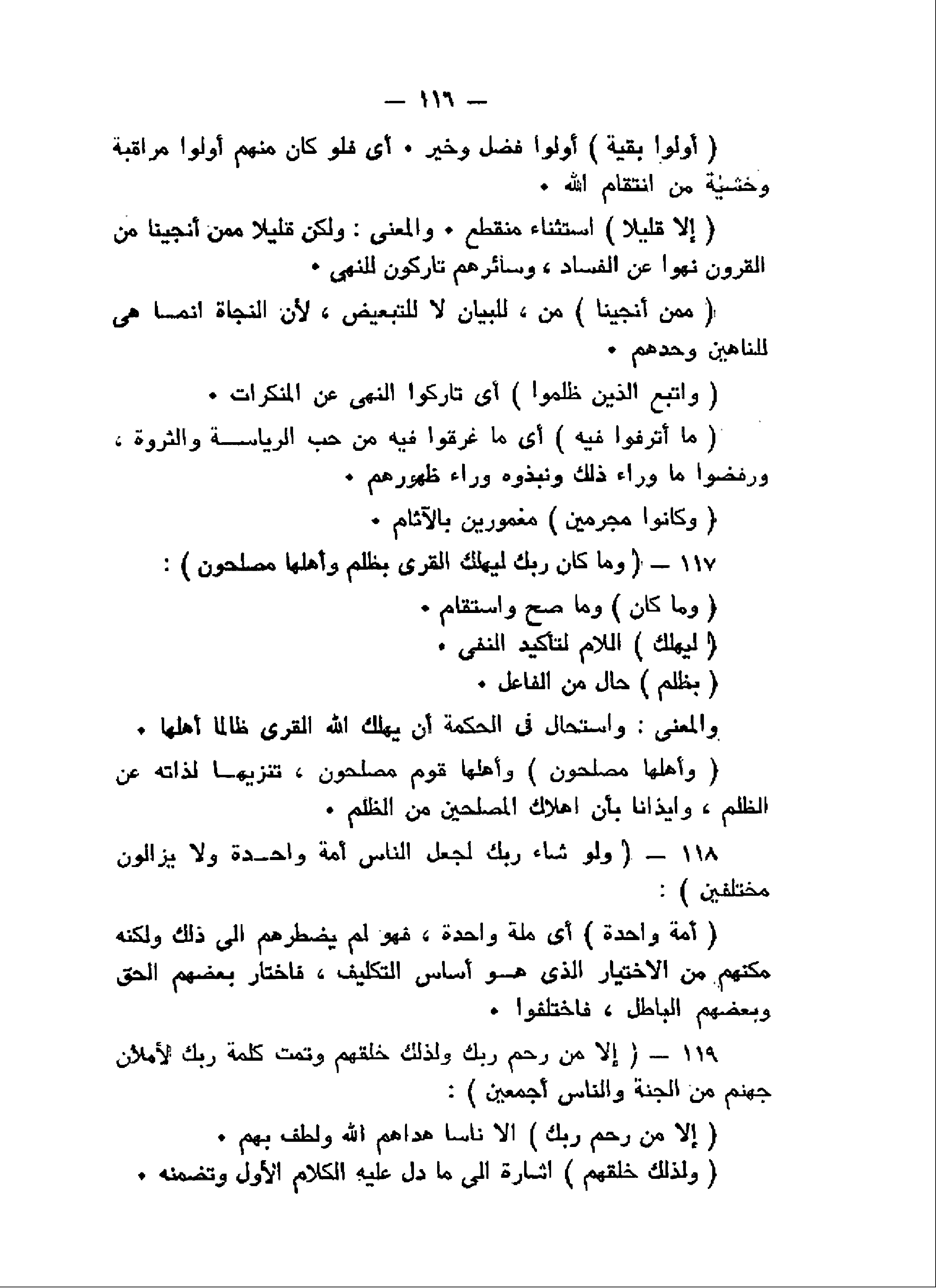 وَما كانَ رَبُّكَ لِيُهْلِكَ الْقُرى بِظُلْمٍ وَأَهْلُها مُصْلِحُونَ (117) وَلَوْ شاءَ رَبُّكَ لَجَعَلَ النَّاسَ أُمَّةً واحِدَةً وَلا يَزالُونَ مُخْتَلِفِينَ (118) إِلاَّ مَنْ رَحِمَ رَبُّكَ وَلِذلِكَ خَلَقَهُمْ وَتَمَّتْ كَلِمَةُ رَبِّكَ لَأَمْلَأَنَّ جَهَنَّمَ مِنَ الْجِنَّةِ وَالنَّاسِ أَجْمَعِينَ (119)