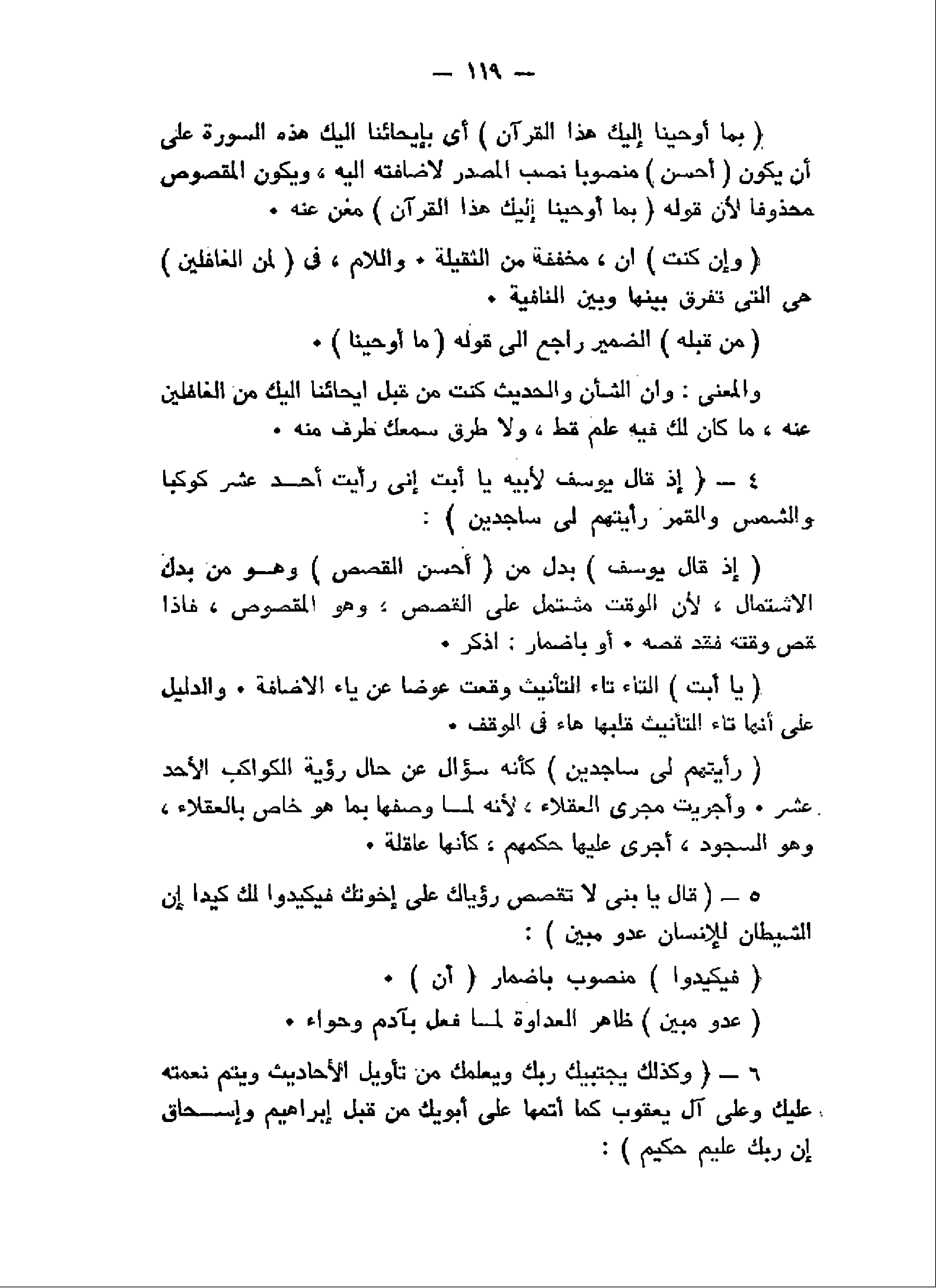 إِذْ قالَ يُوسُفُ لِأَبِيهِ يا أَبَتِ إِنِّي رَأَيْتُ أَحَدَ عَشَرَ كَوْكَباً وَالشَّمْسَ وَالْقَمَرَ رَأَيْتُهُمْ لِي ساجِدِينَ (4) قالَ يا بُنَيَّ لا تَقْصُصْ رُؤْياكَ عَلى إِخْوَتِكَ فَيَكِيدُوا لَكَ كَيْداً إِنَّ الشَّيْطانَ لِلْإِنْسانِ عَدُوٌّ مُبِينٌ (5) وَكَذلِكَ يَجْتَبِيكَ رَبُّكَ وَيُعَلِّمُكَ مِنْ تَأْوِيلِ الْأَحادِيثِ وَيُتِمُّ نِعْمَتَهُ عَلَيْكَ وَعَلى آلِ يَعْقُوبَ كَما أَتَمَّها عَلى أَبَوَيْكَ مِنْ قَبْلُ إِبْراهِيمَ وَإِسْحاقَ إِنَّ رَبَّكَ عَلِيمٌ حَكِيمٌ (6)
