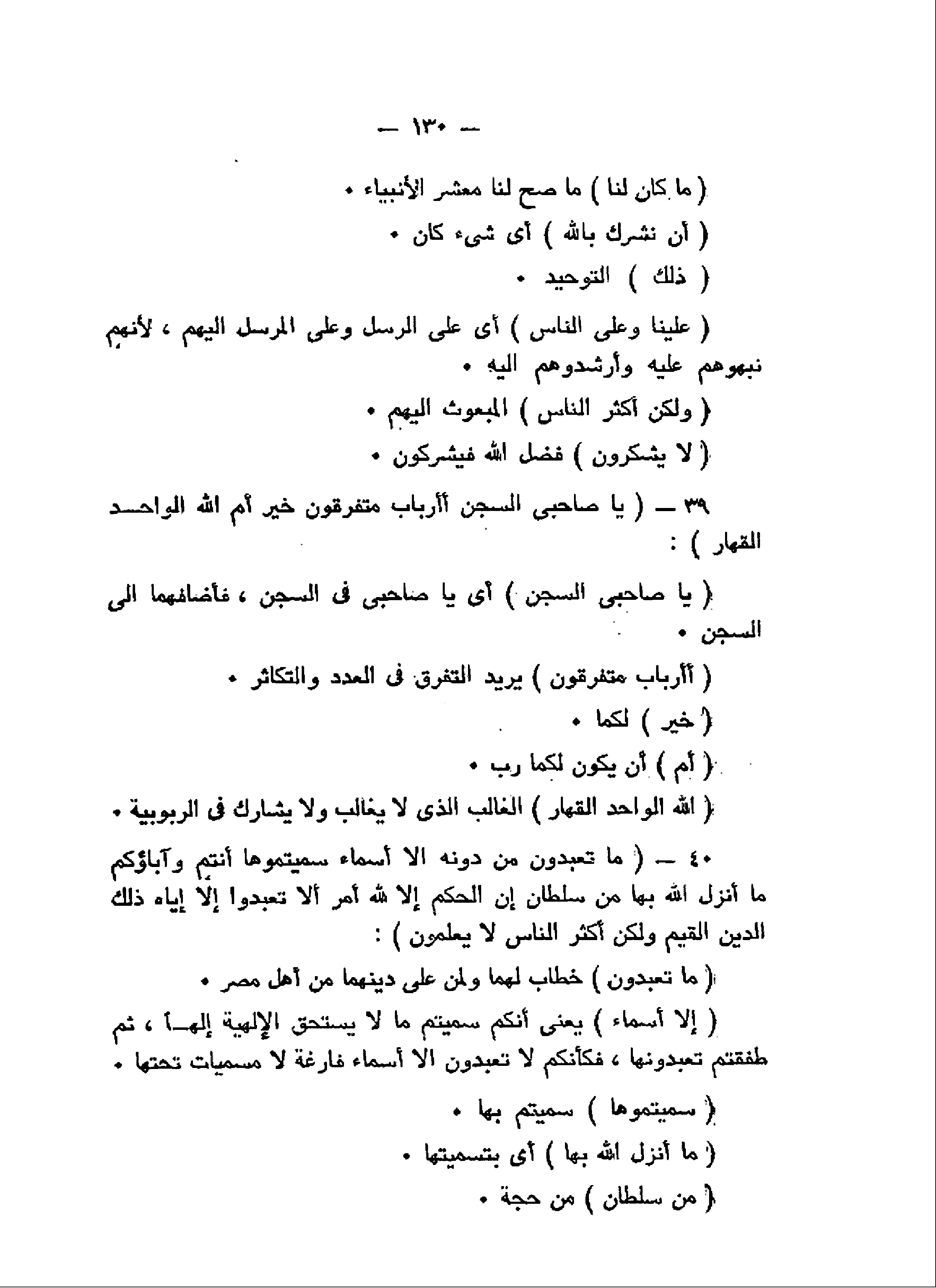 يا صاحِبَيِ السِّجْنِ أَأَرْبابٌ مُتَفَرِّقُونَ خَيْرٌ أَمِ اللَّهُ الْواحِدُ الْقَهَّارُ (39) ما تَعْبُدُونَ مِنْ دُونِهِ إِلاَّ أَسْماءً سَمَّيْتُمُوها أَنْتُمْ وَآباؤُكُمْ ما أَنْزَلَ اللَّهُ بِها مِنْ سُلْطانٍ إِنِ الْحُكْمُ إِلاَّ لِلَّهِ أَمَرَ أَلاَّ تَعْبُدُوا إِلاَّ إِيَّاهُ ذلِكَ الدِّينُ الْقَيِّمُ وَلكِنَّ أَكْثَرَ النَّاسِ لا يَعْلَمُونَ (40)