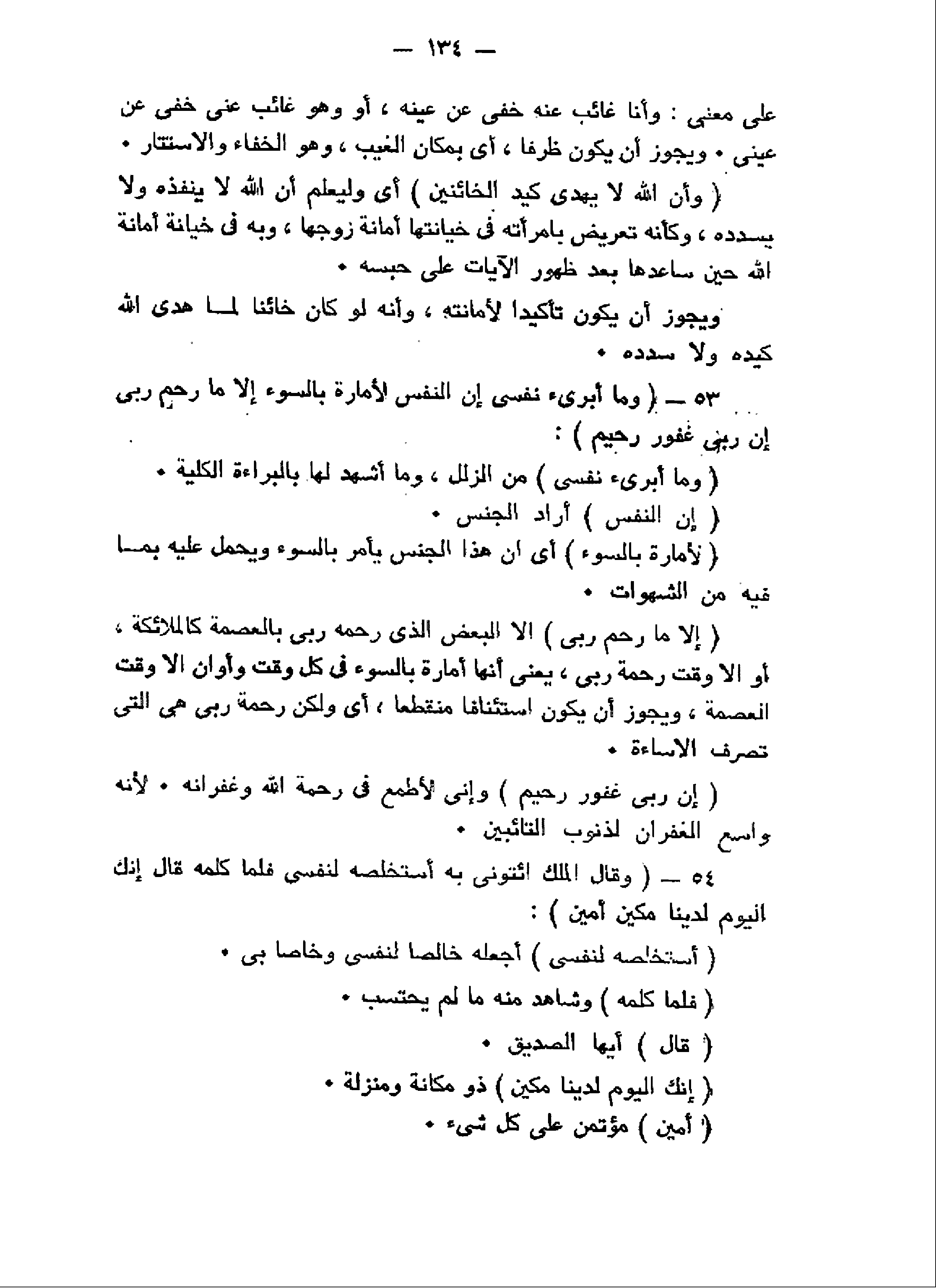 وَما أُبَرِّئُ نَفْسِي إِنَّ النَّفْسَ لَأَمَّارَةٌ بِالسُّوءِ إِلاَّ ما رَحِمَ رَبِّي إِنَّ رَبِّي غَفُورٌ رَحِيمٌ (53) وَقالَ الْمَلِكُ ائْتُونِي بِهِ أَسْتَخْلِصْهُ لِنَفْسِي فَلَمَّا كَلَّمَهُ قالَ إِنَّكَ الْيَوْمَ لَدَيْنا مَكِينٌ أَمِينٌ (54)