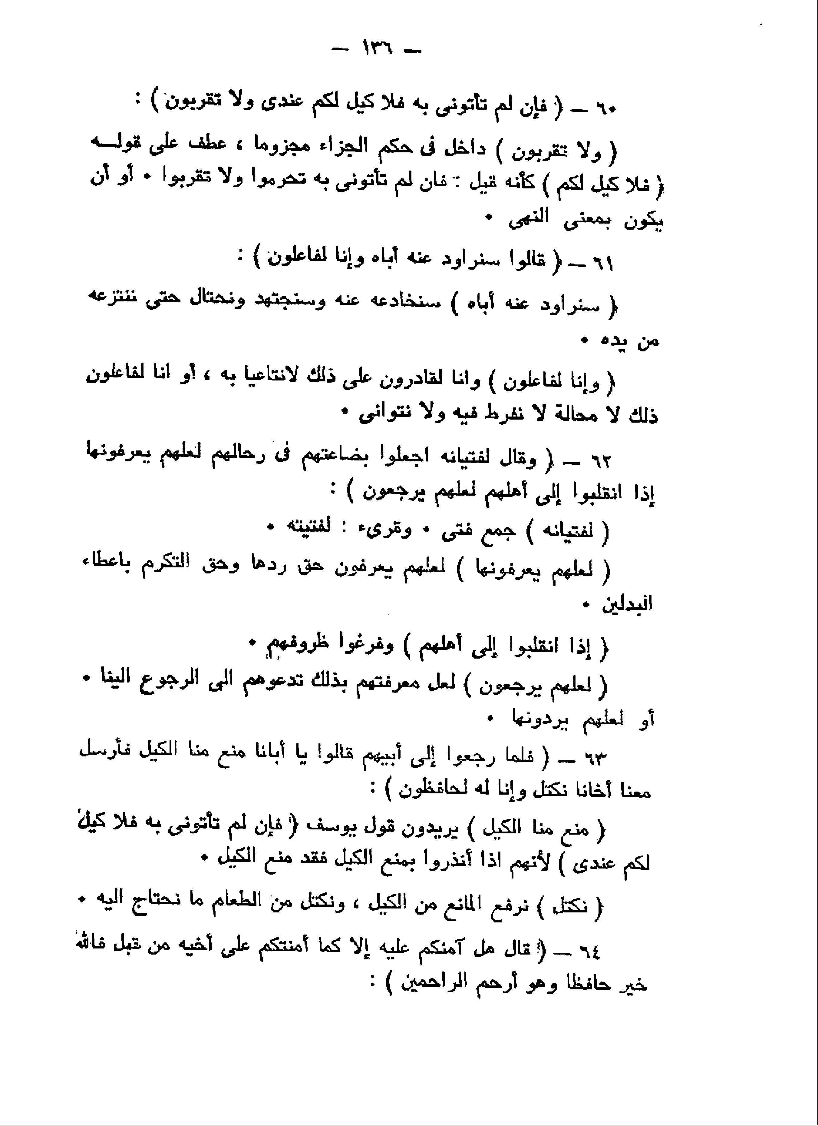 فَإِنْ لَمْ تَأْتُونِي بِهِ فَلا كَيْلَ لَكُمْ عِنْدِي وَلا تَقْرَبُونِ (60) قالُوا سَنُراوِدُ عَنْهُ أَباهُ وَإِنَّا لَفاعِلُونَ (61) وَقالَ لِفِتْيانِهِ اجْعَلُوا بِضاعَتَهُمْ فِي رِحالِهِمْ لَعَلَّهُمْ يَعْرِفُونَها إِذَا انْقَلَبُوا إِلى أَهْلِهِمْ لَعَلَّهُمْ يَرْجِعُونَ (62) فَلَمَّا رَجَعُوا إِلى أَبِيهِمْ قالُوا يا أَبانا مُنِعَ مِنَّا الْكَيْلُ فَأَرْسِلْ مَعَنا أَخانا نَكْتَلْ وَإِنَّا لَهُ لَحافِظُونَ (63) قالَ هَلْ آمَنُكُمْ عَلَيْهِ إِلاَّ كَما أَمِنْتُكُمْ عَلى أَخِيهِ مِنْ قَبْلُ فَاللَّهُ خَيْرٌ حافِظاً وَهُوَ أَرْحَمُ الرَّاحِمِينَ (64)