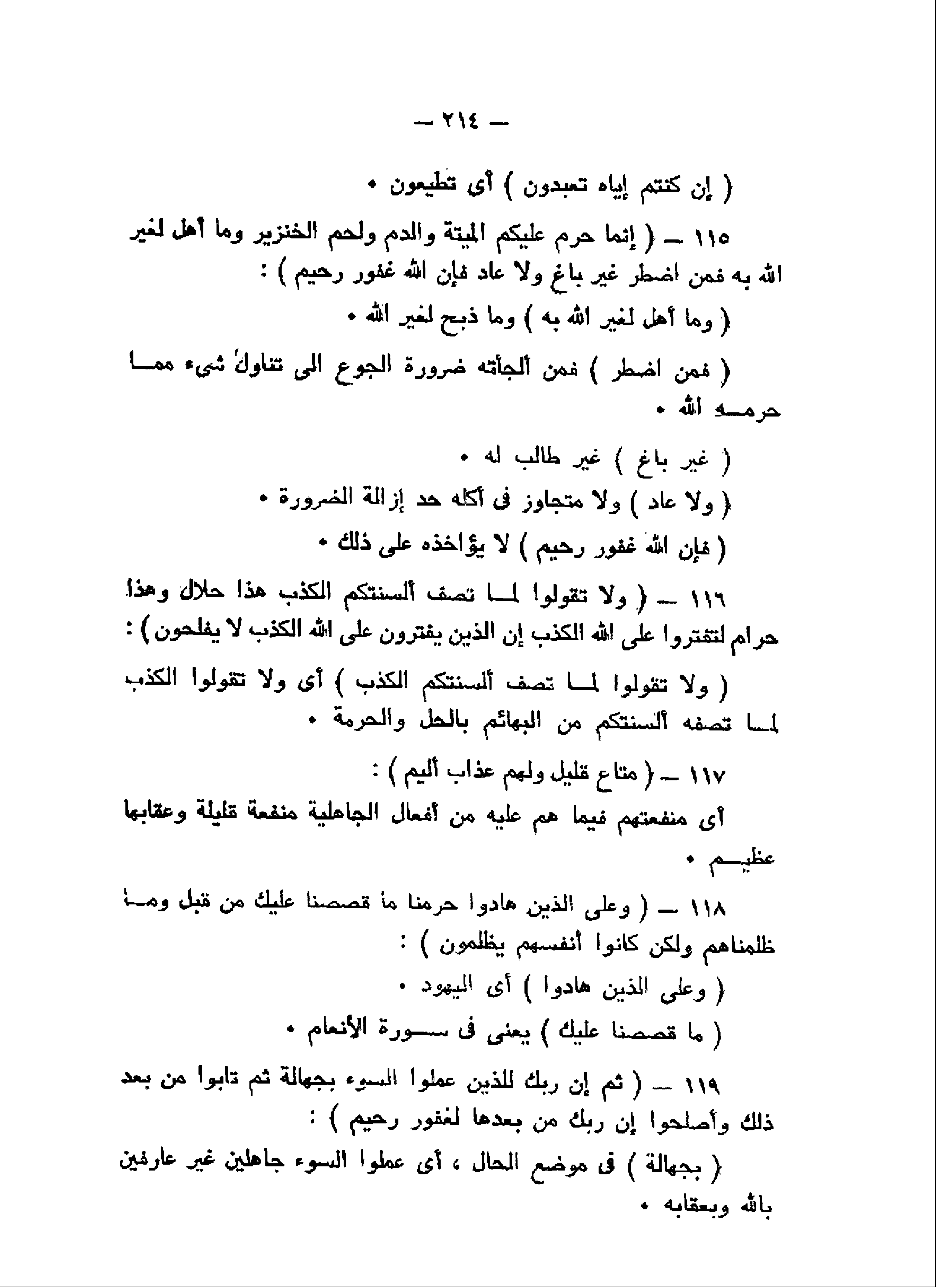 إِنَّما حَرَّمَ عَلَيْكُمُ الْمَيْتَةَ وَالدَّمَ وَلَحْمَ الْخِنْزِيرِ وَما أُهِلَّ لِغَيْرِ اللَّهِ بِهِ فَمَنِ اضْطُرَّ غَيْرَ باغٍ وَلا عادٍ فَإِنَّ اللَّهَ غَفُورٌ رَحِيمٌ (115) وَلا تَقُولُوا لِما تَصِفُ أَلْسِنَتُكُمُ الْكَذِبَ هذا حَلالٌ وَهذا حَرامٌ لِتَفْتَرُوا عَلَى اللَّهِ الْكَذِبَ إِنَّ الَّذِينَ يَفْتَرُونَ عَلَى اللَّهِ الْكَذِبَ لا يُفْلِحُونَ (116) مَتاعٌ قَلِيلٌ وَلَهُمْ عَذابٌ أَلِيمٌ (117) وَعَلَى الَّذِينَ هادُوا حَرَّمْنا ما قَصَصْنا عَلَيْكَ مِنْ قَبْلُ وَما ظَلَمْناهُمْ وَلكِنْ كانُوا أَنْفُسَهُمْ يَظْلِمُونَ (118) ثُمَّ إِنَّ رَبَّكَ لِلَّذِينَ عَمِلُوا السُّوءَ بِجَهالَةٍ ثُمَّ تابُوا مِنْ بَعْدِ ذلِكَ وَأَصْلَحُوا إِنَّ رَبَّكَ مِنْ بَعْدِها لَغَفُورٌ رَحِيمٌ (119)