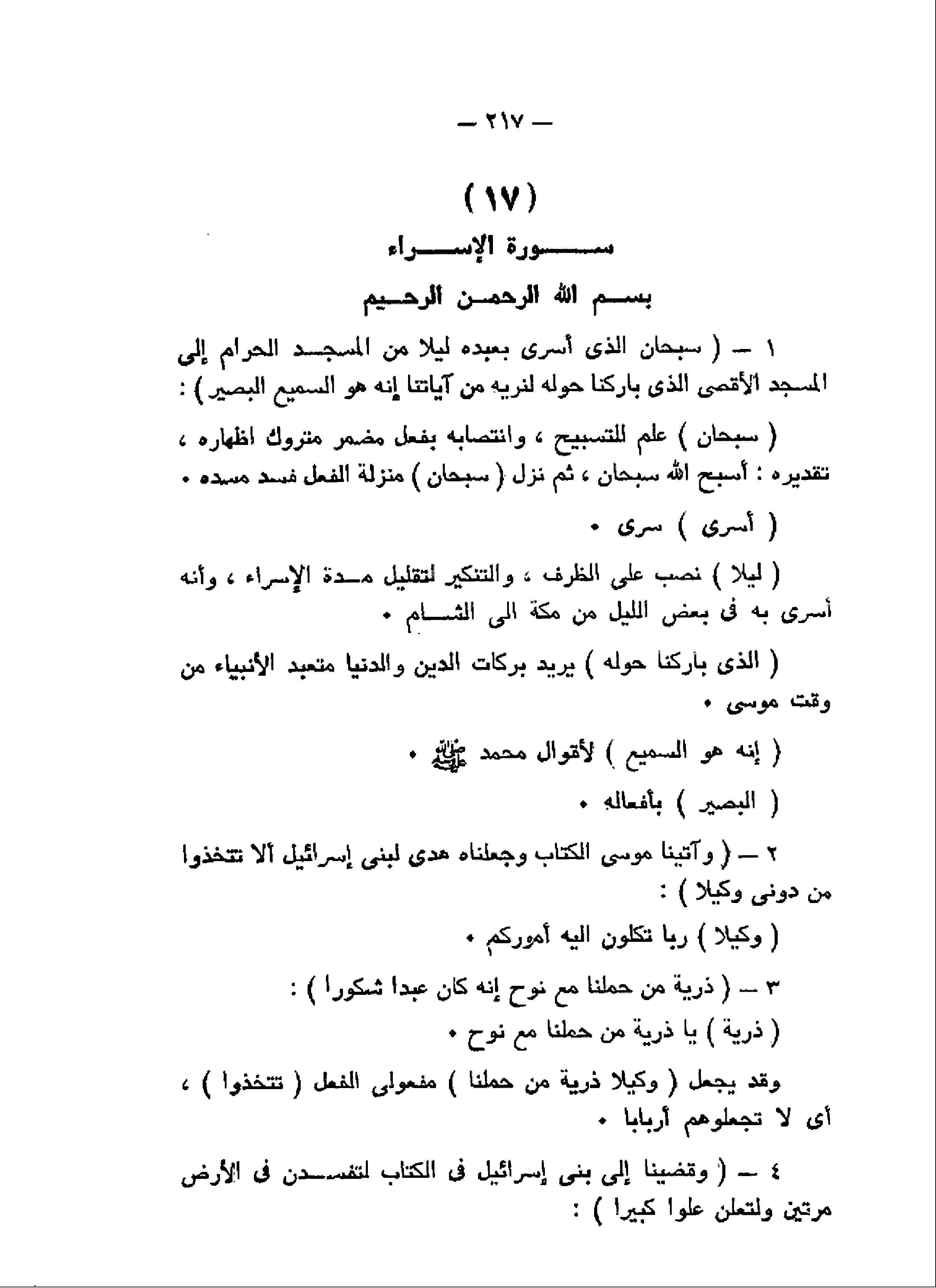 سُبْحانَ الَّذِي أَسْرى بِعَبْدِهِ لَيْلاً مِنَ الْمَسْجِدِ الْحَرامِ إِلَى الْمَسْجِدِ الْأَقْصَى الَّذِي بارَكْنا حَوْلَهُ لِنُرِيَهُ مِنْ آياتِنا إِنَّهُ هُوَ السَّمِيعُ الْبَصِيرُ (1) وَآتَيْنا مُوسَى الْكِتابَ وَجَعَلْناهُ هُدىً لِبَنِي إِسْرائِيلَ أَلاَّ تَتَّخِذُوا مِنْ دُونِي وَكِيلاً (2) ذُرِّيَّةَ مَنْ حَمَلْنا مَعَ نُوحٍ إِنَّهُ كانَ عَبْداً شَكُوراً (3) وَقَضَيْنا إِلى بَنِي إِسْرائِيلَ فِي الْكِتابِ لَتُفْسِدُنَّ فِي الْأَرْضِ مَرَّتَيْنِ وَلَتَعْلُنَّ عُلُوًّا كَبِيراً (4)