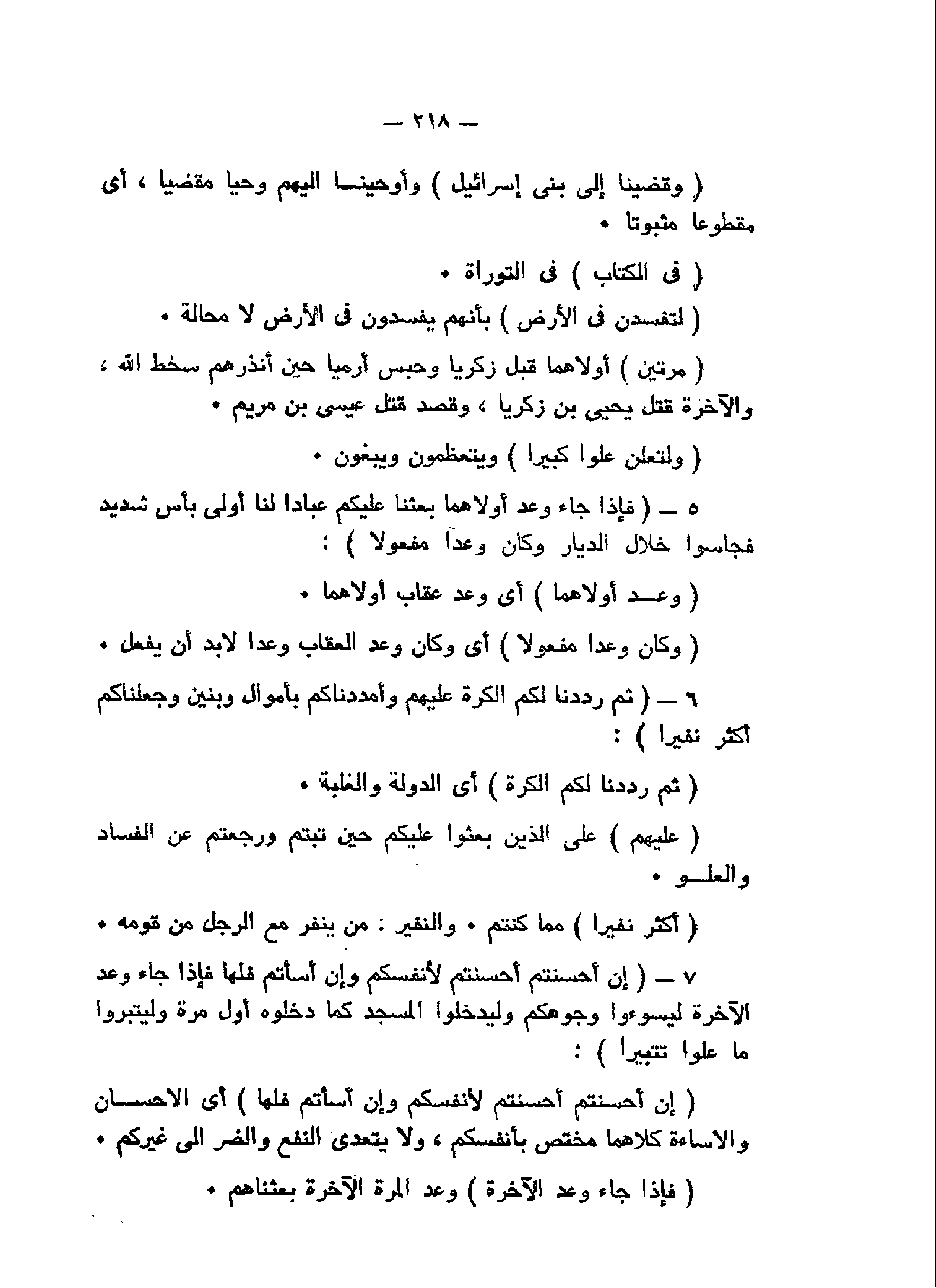 فَإِذا جاءَ وَعْدُ أُولاهُما بَعَثْنا عَلَيْكُمْ عِباداً لَنا أُولِي بَأْسٍ شَدِيدٍ فَجاسُوا خِلالَ الدِّيارِ وَكانَ وَعْداً مَفْعُولاً (5) ثُمَّ رَدَدْنا لَكُمُ الْكَرَّةَ عَلَيْهِمْ وَأَمْدَدْناكُمْ بِأَمْوالٍ وَبَنِينَ وَجَعَلْناكُمْ أَكْثَرَ نَفِيراً (6) إِنْ أَحْسَنْتُمْ أَحْسَنْتُمْ لِأَنْفُسِكُمْ وَإِنْ أَسَأْتُمْ فَلَها فَإِذا جاءَ وَعْدُ الْآخِرَةِ لِيَسُوؤُا وُجُوهَكُمْ وَلِيَدْخُلُوا الْمَسْجِدَ كَما دَخَلُوهُ أَوَّلَ مَرَّةٍ وَلِيُتَبِّرُوا ما عَلَوْا تَتْبِيراً (7)