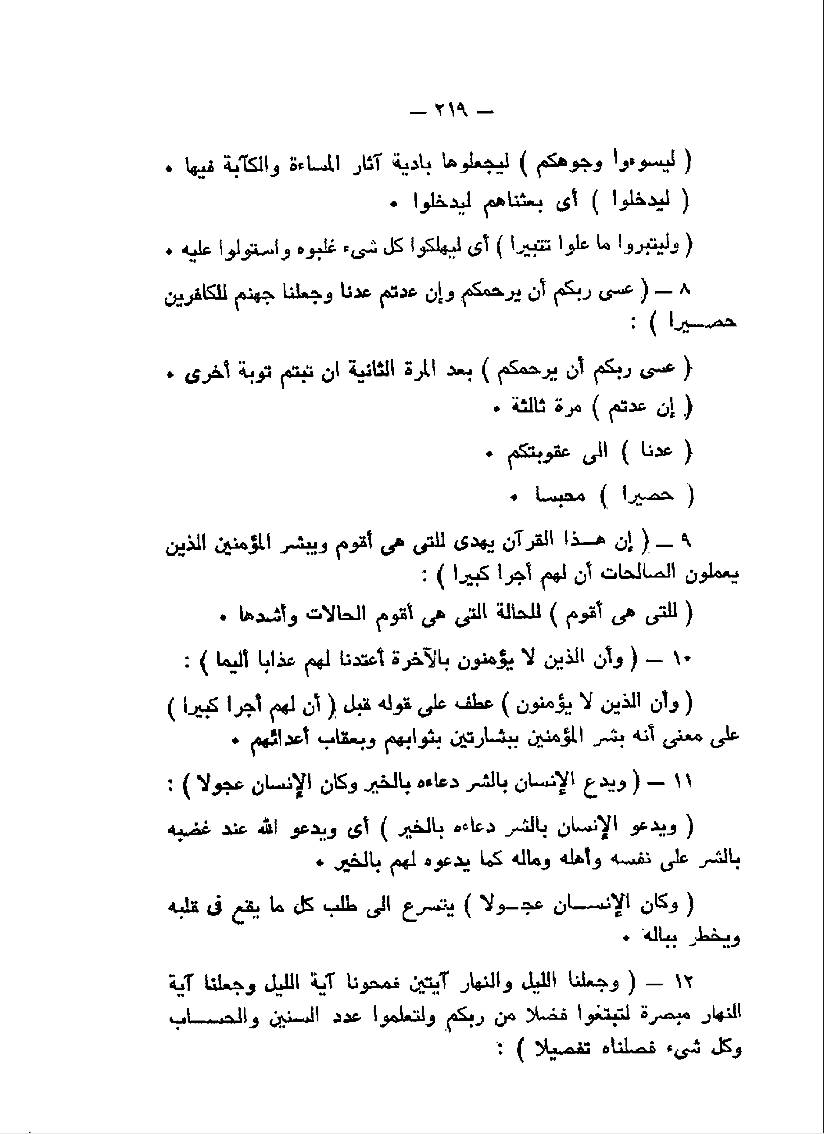 وَأَنَّ الَّذِينَ لا يُؤْمِنُونَ بِالْآخِرَةِ أَعْتَدْنا لَهُمْ عَذاباً أَلِيماً (10) وَيَدْعُ الْإِنْسانُ بِالشَّرِّ دُعاءَهُ بِالْخَيْرِ وَكانَ الْإِنْسانُ عَجُولاً (11) وَجَعَلْنَا اللَّيْلَ وَالنَّهارَ آيَتَيْنِ فَمَحَوْنا آيَةَ اللَّيْلِ وَجَعَلْنا آيَةَ النَّهارِ مُبْصِرَةً لِتَبْتَغُوا فَضْلاً مِنْ رَبِّكُمْ وَلِتَعْلَمُوا عَدَدَ السِّنِينَ وَالْحِسابَ وَكُلَّ شَيْءٍ فَصَّلْناهُ تَفْصِيلاً (12)