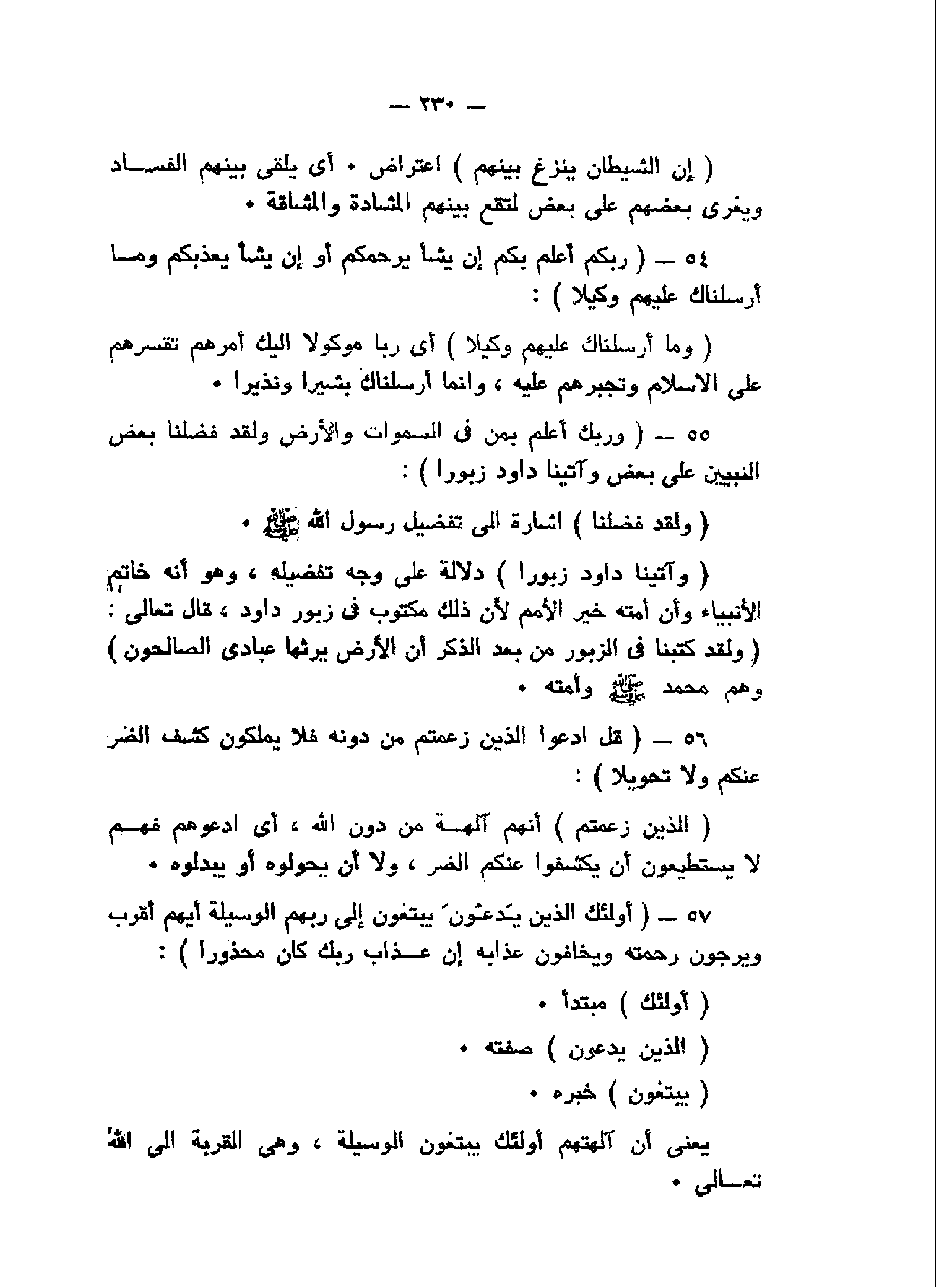 رَبُّكُمْ أَعْلَمُ بِكُمْ إِنْ يَشَأْ يَرْحَمْكُمْ أَوْ إِنْ يَشَأْ يُعَذِّبْكُمْ وَما أَرْسَلْناكَ عَلَيْهِمْ وَكِيلاً (54) وَرَبُّكَ أَعْلَمُ بِمَنْ فِي السَّماواتِ وَالْأَرْضِ وَلَقَدْ فَضَّلْنا بَعْضَ النَّبِيِّينَ عَلى بَعْضٍ وَآتَيْنا داوُدَ زَبُوراً (55) قُلِ ادْعُوا الَّذِينَ زَعَمْتُمْ مِنْ دُونِهِ فَلا يَمْلِكُونَ كَشْفَ الضُّرِّ عَنْكُمْ وَلا تَحْوِيلاً (56) أُولئِكَ الَّذِينَ يَدْعُونَ يَبْتَغُونَ إِلى رَبِّهِمُ الْوَسِيلَةَ أَيُّهُمْ أَقْرَبُ وَيَرْجُونَ رَحْمَتَهُ وَيَخافُونَ عَذابَهُ إِنَّ عَذابَ رَبِّكَ كانَ مَحْذُوراً (57)