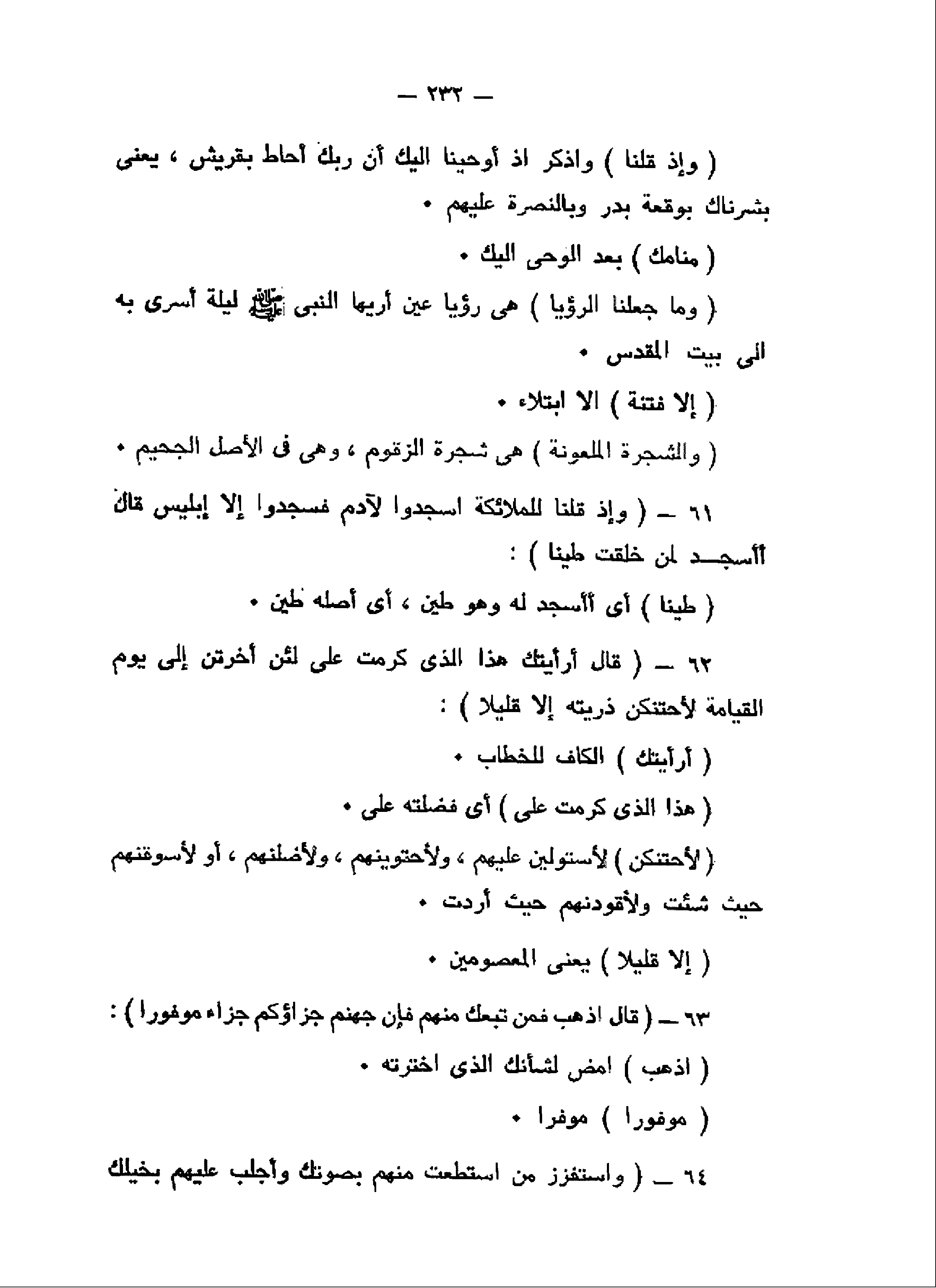 وَإِذْ قُلْنا لِلْمَلائِكَةِ اسْجُدُوا لِآدَمَ فَسَجَدُوا إِلاَّ إِبْلِيسَ قالَ أَأَسْجُدُ لِمَنْ خَلَقْتَ طِيناً (61) قالَ أَرَأَيْتَكَ هذَا الَّذِي كَرَّمْتَ عَلَيَّ لَئِنْ أَخَّرْتَنِ إِلى يَوْمِ الْقِيامَةِ لَأَحْتَنِكَنَّ ذُرِّيَّتَهُ إِلاَّ قَلِيلاً (62) قالَ اذْهَبْ فَمَنْ تَبِعَكَ مِنْهُمْ فَإِنَّ جَهَنَّمَ جَزاؤُكُمْ جَزاءً مَوْفُوراً (63) وَاسْتَفْزِزْ مَنِ اسْتَطَعْتَ مِنْهُمْ بِصَوْتِكَ وَأَجْلِبْ عَلَيْهِمْ بِخَيْلِكَ وَرَجِلِكَ وَشارِكْهُمْ فِي الْأَمْوالِ وَالْأَوْلادِ وَعِدْهُمْ وَما يَعِدُهُمُ الشَّيْطانُ إِلاَّ غُرُوراً (64)