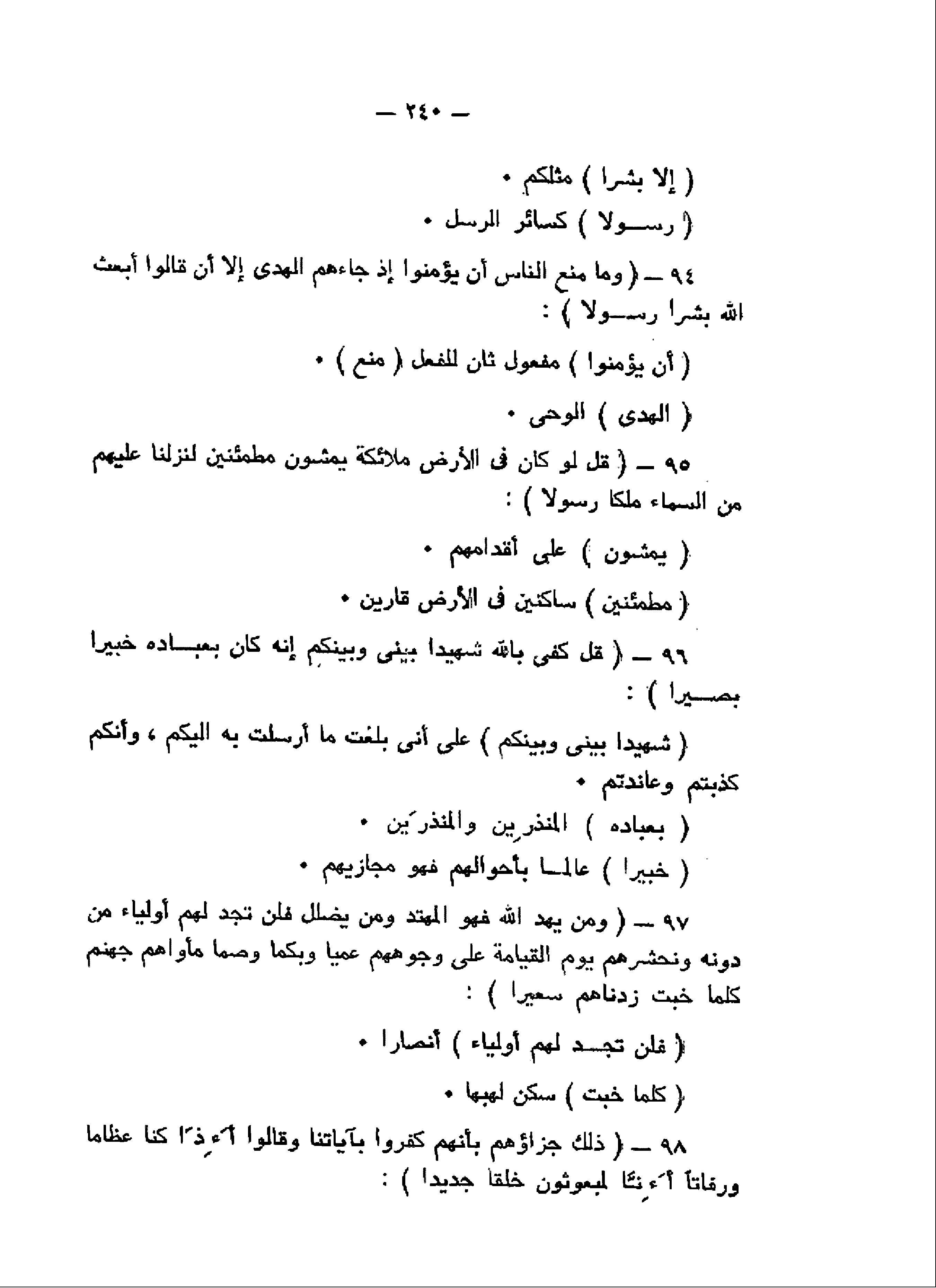 وَما مَنَعَ النَّاسَ أَنْ يُؤْمِنُوا إِذْ جاءَهُمُ الْهُدى إِلاَّ أَنْ قالُوا أَبَعَثَ اللَّهُ بَشَراً رَسُولاً (94) قُلْ لَوْ كانَ فِي الْأَرْضِ مَلائِكَةٌ يَمْشُونَ مُطْمَئِنِّينَ لَنَزَّلْنا عَلَيْهِمْ مِنَ السَّماءِ مَلَكاً رَسُولاً (95) قُلْ كَفى بِاللَّهِ شَهِيداً بَيْنِي وَبَيْنَكُمْ إِنَّهُ كانَ بِعِبادِهِ خَبِيراً بَصِيراً (96) وَمَنْ يَهْدِ اللَّهُ فَهُوَ الْمُهْتَدِ وَمَنْ يُضْلِلْ فَلَنْ تَجِدَ لَهُمْ أَوْلِياءَ مِنْ دُونِهِ وَنَحْشُرُهُمْ يَوْمَ الْقِيامَةِ عَلى وُجُوهِهِمْ عُمْياً وَبُكْماً وَصُمًّا مَأْواهُمْ جَهَنَّمُ كُلَّما خَبَتْ زِدْناهُمْ سَعِيراً (97) ذلِكَ جَزاؤُهُمْ بِأَنَّهُمْ كَفَرُوا بِآياتِنا وَقالُوا أَإِذا كُنَّا عِظاماً وَرُفاتاً أَإِنَّا لَمَبْعُوثُونَ خَلْقاً جَدِيداً (98)