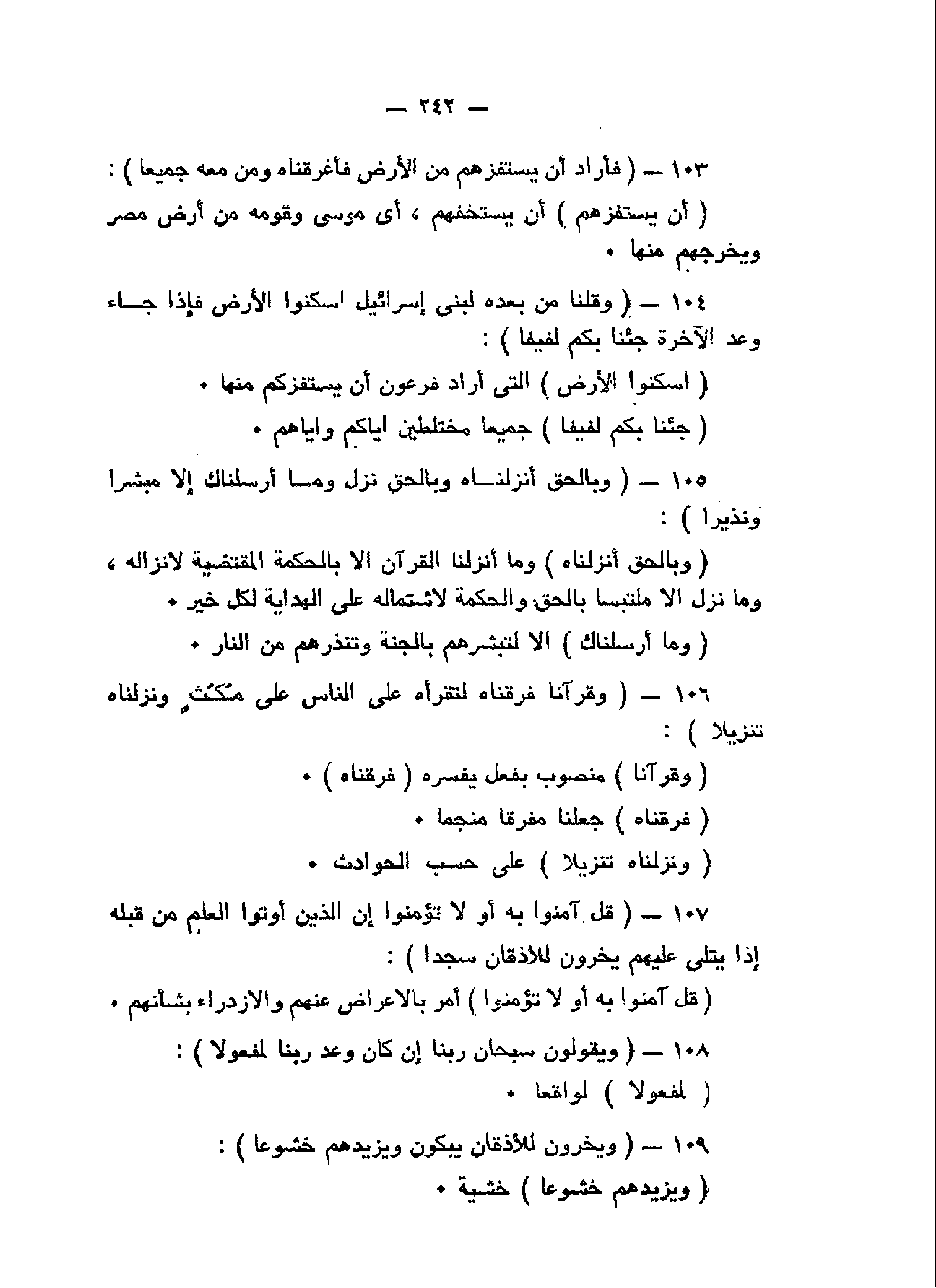 فَأَرادَ أَنْ يَسْتَفِزَّهُمْ مِنَ الْأَرْضِ فَأَغْرَقْناهُ وَمَنْ مَعَهُ جَمِيعاً (103) وَقُلْنا مِنْ بَعْدِهِ لِبَنِي إِسْرائِيلَ اسْكُنُوا الْأَرْضَ فَإِذا جاءَ وَعْدُ الْآخِرَةِ جِئْنا بِكُمْ لَفِيفاً (104) وَبِالْحَقِّ أَنْزَلْناهُ وَبِالْحَقِّ نَزَلَ وَما أَرْسَلْناكَ إِلاَّ مُبَشِّراً وَنَذِيراً (105) وَقُرْآناً فَرَقْناهُ لِتَقْرَأَهُ عَلَى النَّاسِ عَلى مُكْثٍ وَنَزَّلْناهُ تَنْزِيلاً (106) قُلْ آمِنُوا بِهِ أَوْ لا تُؤْمِنُوا إِنَّ الَّذِينَ أُوتُوا الْعِلْمَ مِنْ قَبْلِهِ إِذا يُتْلى عَلَيْهِمْ يَخِرُّونَ لِلْأَذْقانِ سُجَّداً (107)