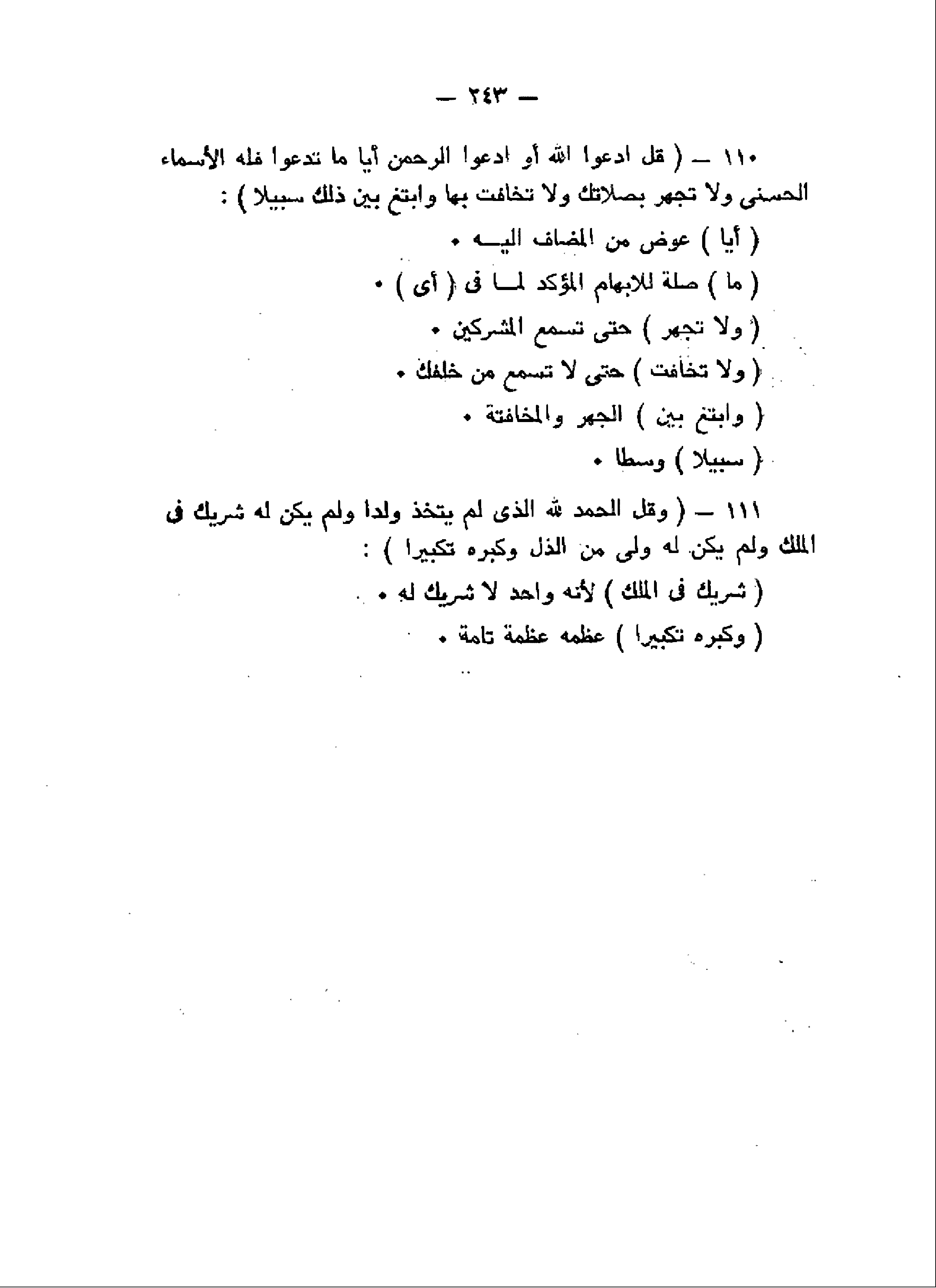 قُلِ ادْعُوا اللَّهَ أَوِ ادْعُوا الرَّحْمنَ أَيًّا ما تَدْعُوا فَلَهُ الْأَسْماءُ الْحُسْنى وَلا تَجْهَرْ بِصَلاتِكَ وَلا تُخافِتْ بِها وَابْتَغِ بَيْنَ ذلِكَ سَبِيلاً (110) وَقُلِ الْحَمْدُ لِلَّهِ الَّذِي لَمْ يَتَّخِذْ وَلَداً وَلَمْ يَكُنْ لَهُ شَرِيكٌ فِي الْمُلْكِ وَلَمْ يَكُنْ لَهُ وَلِيٌّ مِنَ الذُّلِّ وَكَبِّرْهُ تَكْبِيراً (111)