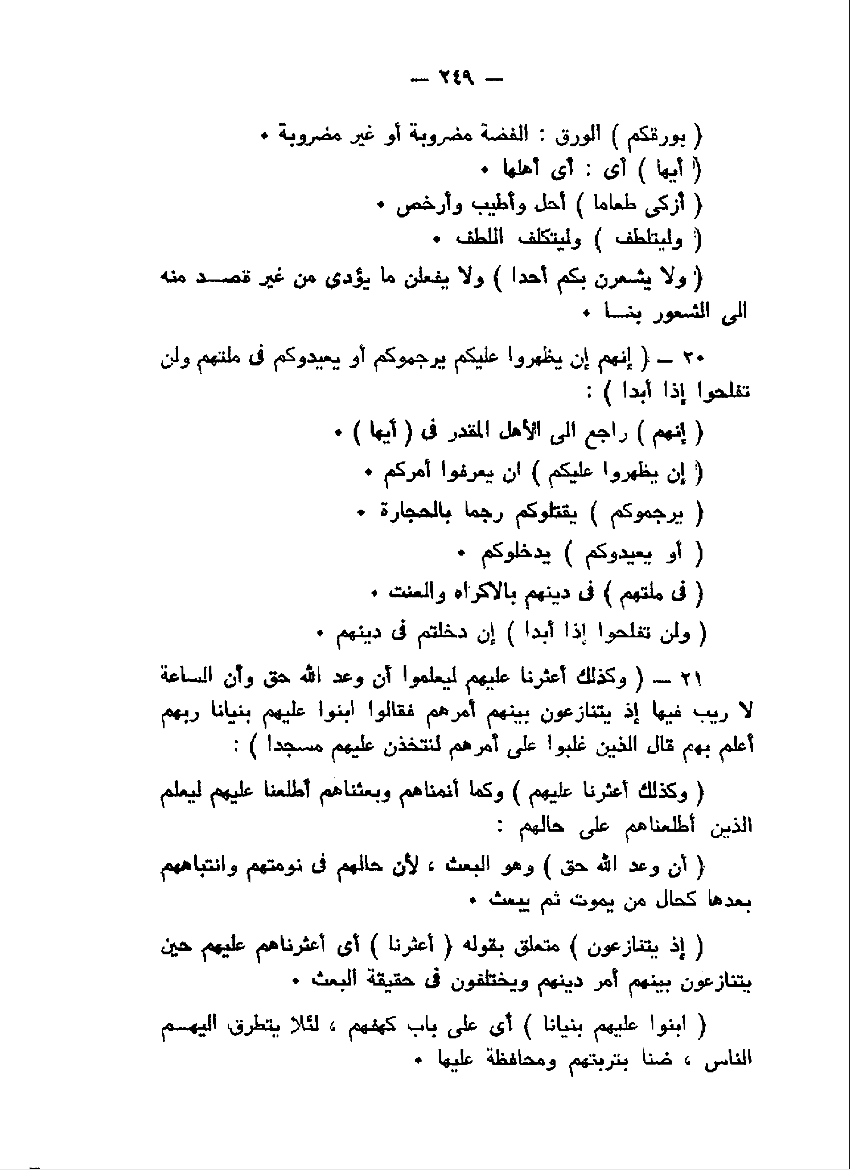 إِنَّهُمْ إِنْ يَظْهَرُوا عَلَيْكُمْ يَرْجُمُوكُمْ أَوْ يُعِيدُوكُمْ فِي مِلَّتِهِمْ وَلَنْ تُفْلِحُوا إِذاً أَبَداً (20) وَكَذلِكَ أَعْثَرْنا عَلَيْهِمْ لِيَعْلَمُوا أَنَّ وَعْدَ اللَّهِ حَقٌّ وَأَنَّ السَّاعَةَ لا رَيْبَ فِيها إِذْ يَتَنازَعُونَ بَيْنَهُمْ أَمْرَهُمْ فَقالُوا ابْنُوا عَلَيْهِمْ بُنْياناً رَبُّهُمْ أَعْلَمُ بِهِمْ قالَ الَّذِينَ غَلَبُوا عَلى أَمْرِهِمْ لَنَتَّخِذَنَّ عَلَيْهِمْ مَسْجِداً (21)