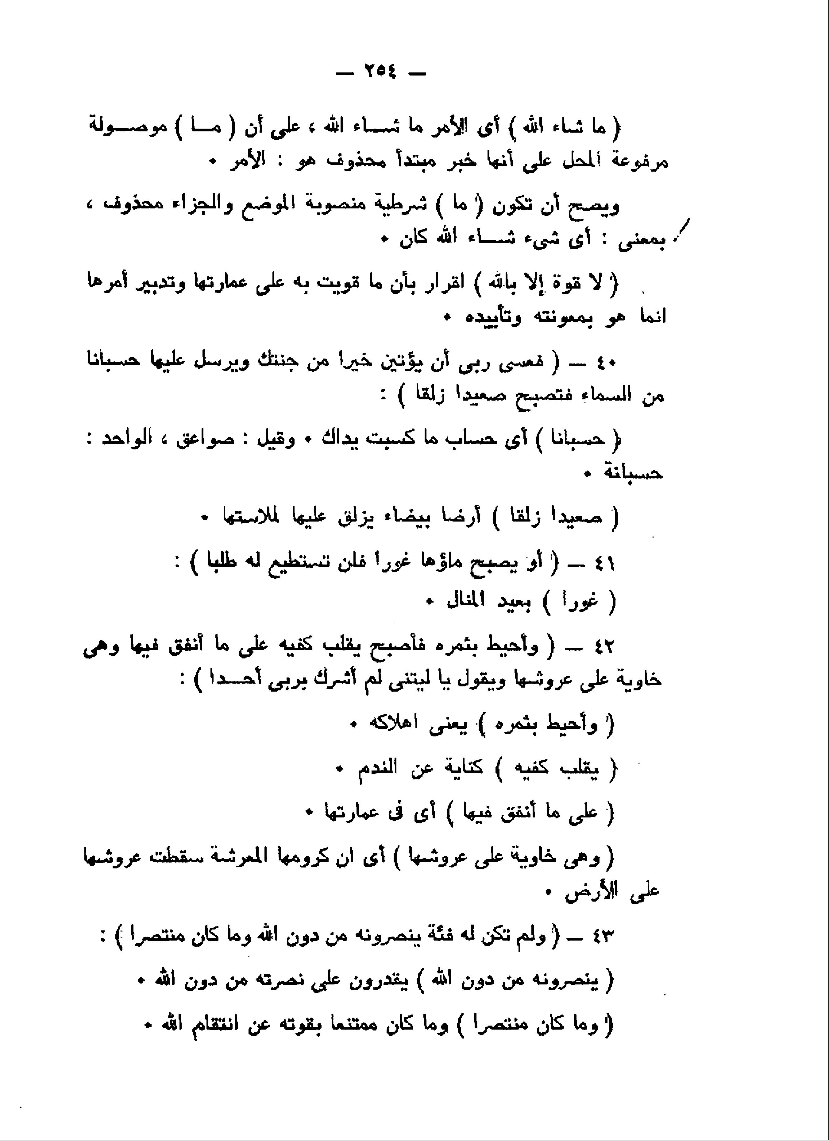 فَعَسى رَبِّي أَنْ يُؤْتِيَنِ خَيْراً مِنْ جَنَّتِكَ وَيُرْسِلَ عَلَيْها حُسْباناً مِنَ السَّماءِ فَتُصْبِحَ صَعِيداً زَلَقاً (40) أَوْ يُصْبِحَ ماؤُها غَوْراً فَلَنْ تَسْتَطِيعَ لَهُ طَلَباً (41) وَأُحِيطَ بِثَمَرِهِ فَأَصْبَحَ يُقَلِّبُ كَفَّيْهِ عَلى ما أَنْفَقَ فِيها وَهِيَ خاوِيَةٌ عَلى عُرُوشِها وَيَقُولُ يا لَيْتَنِي لَمْ أُشْرِكْ بِرَبِّي أَحَداً (42) وَلَمْ تَكُنْ لَهُ فِئَةٌ يَنْصُرُونَهُ مِنْ دُونِ اللَّهِ وَما كانَ مُنْتَصِراً (43)