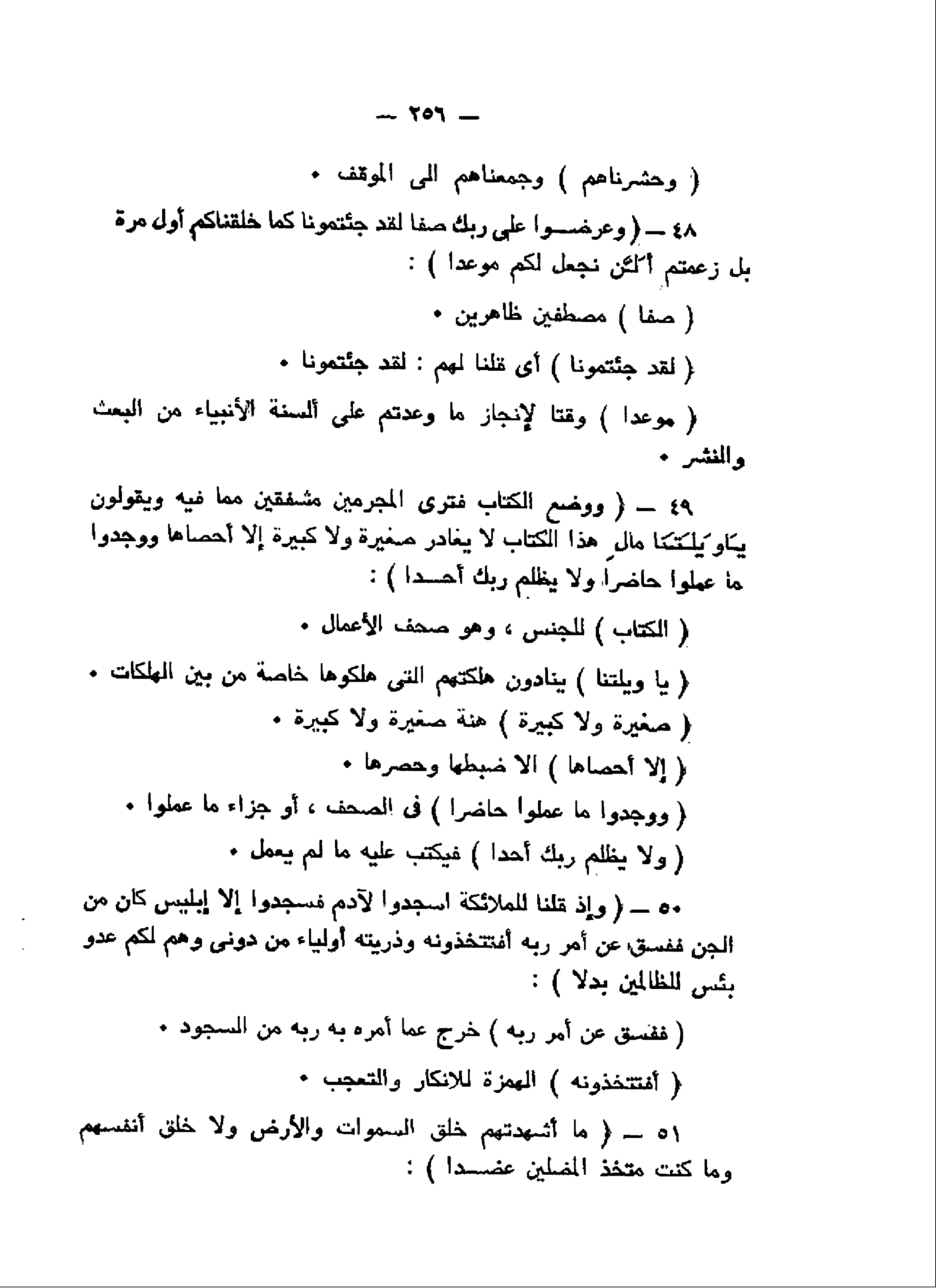 وَعُرِضُوا عَلى رَبِّكَ صَفًّا لَقَدْ جِئْتُمُونا كَما خَلَقْناكُمْ أَوَّلَ مَرَّةٍ بَلْ زَعَمْتُمْ أَلَّنْ نَجْعَلَ لَكُمْ مَوْعِداً (48) وَوُضِعَ الْكِتابُ فَتَرَى الْمُجْرِمِينَ مُشْفِقِينَ مِمَّا فِيهِ وَيَقُولُونَ يا وَيْلَتَنا مالِ هذَا الْكِتابِ لا يُغادِرُ صَغِيرَةً وَلا كَبِيرَةً إِلاَّ أَحْصاها وَوَجَدُوا ما عَمِلُوا حاضِراً وَلا يَظْلِمُ رَبُّكَ أَحَداً (49) وَإِذْ قُلْنا لِلْمَلائِكَةِ اسْجُدُوا لِآدَمَ فَسَجَدُوا إِلاَّ إِبْلِيسَ كانَ مِنَ الْجِنِّ فَفَسَقَ عَنْ أَمْرِ رَبِّهِ أَفَتَتَّخِذُونَهُ وَذُرِّيَّتَهُ أَوْلِياءَ مِنْ دُونِي وَهُمْ لَكُمْ عَدُوٌّ بِئْسَ لِلظَّالِمِينَ بَدَلاً (50) ما أَشْهَدْتُهُمْ خَلْقَ السَّماواتِ وَالْأَرْضِ وَلا خَلْقَ أَنْفُسِهِمْ وَما كُنْتُ مُتَّخِذَ الْمُضِلِّينَ عَضُداً (51)