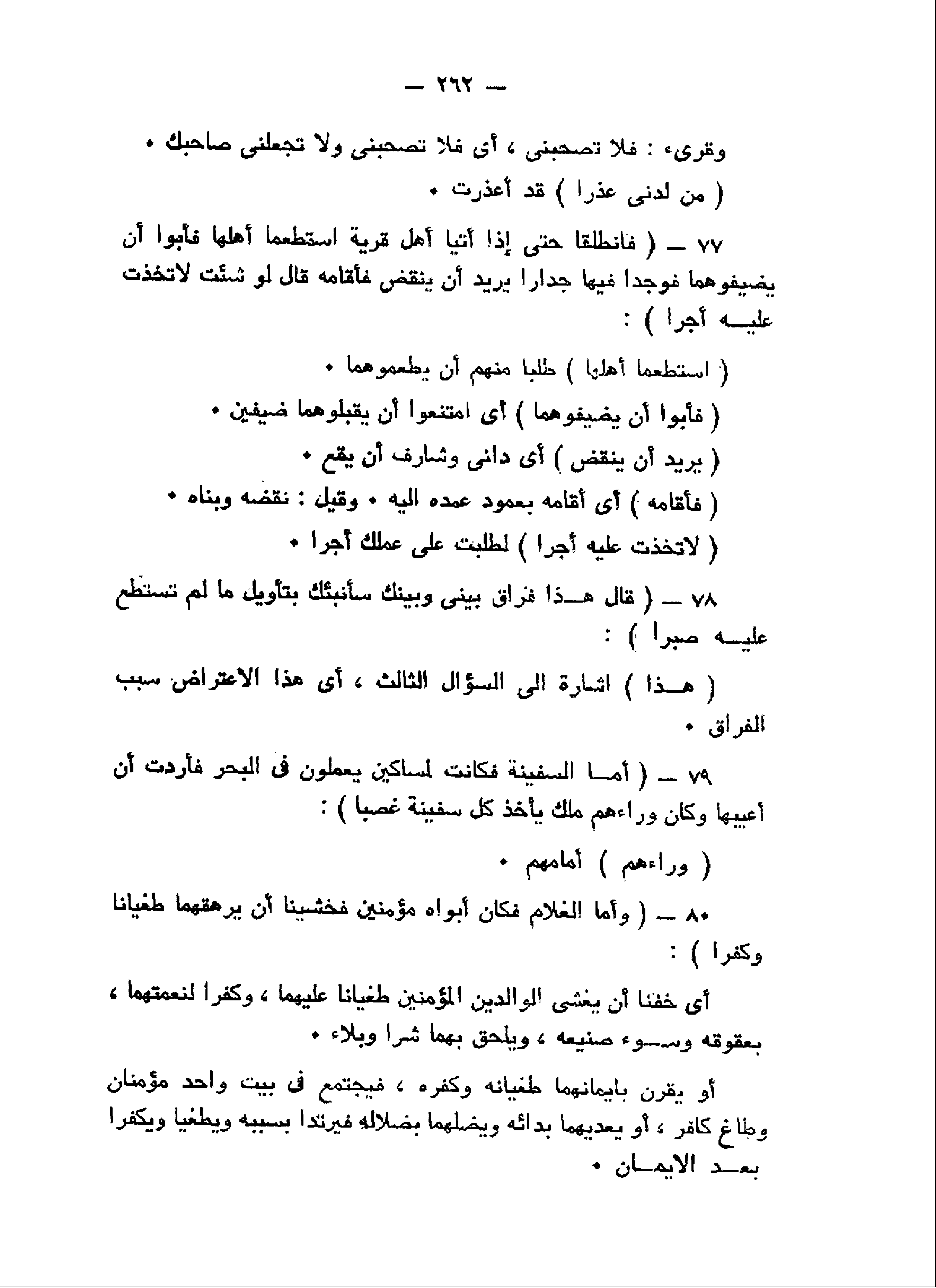 فَانْطَلَقا حَتَّى إِذا أَتَيا أَهْلَ قَرْيَةٍ اسْتَطْعَما أَهْلَها فَأَبَوْا أَنْ يُضَيِّفُوهُما فَوَجَدا فِيها جِداراً يُرِيدُ أَنْ يَنْقَضَّ فَأَقامَهُ قالَ لَوْ شِئْتَ لاتَّخَذْتَ عَلَيْهِ أَجْراً (77) قالَ هذا فِراقُ بَيْنِي وَبَيْنِكَ سَأُنَبِّئُكَ بِتَأْوِيلِ ما لَمْ تَسْتَطِعْ عَلَيْهِ صَبْراً (78) أَمَّا السَّفِينَةُ فَكانَتْ لِمَساكِينَ يَعْمَلُونَ فِي الْبَحْرِ فَأَرَدْتُ أَنْ أَعِيبَها وَكانَ وَراءَهُمْ مَلِكٌ يَأْخُذُ كُلَّ سَفِينَةٍ غَصْباً (79) وَأَمَّا الْغُلامُ فَكانَ أَبَواهُ مُؤْمِنَيْنِ فَخَشِينا أَنْ يُرْهِقَهُما طُغْياناً وَكُفْراً (80)