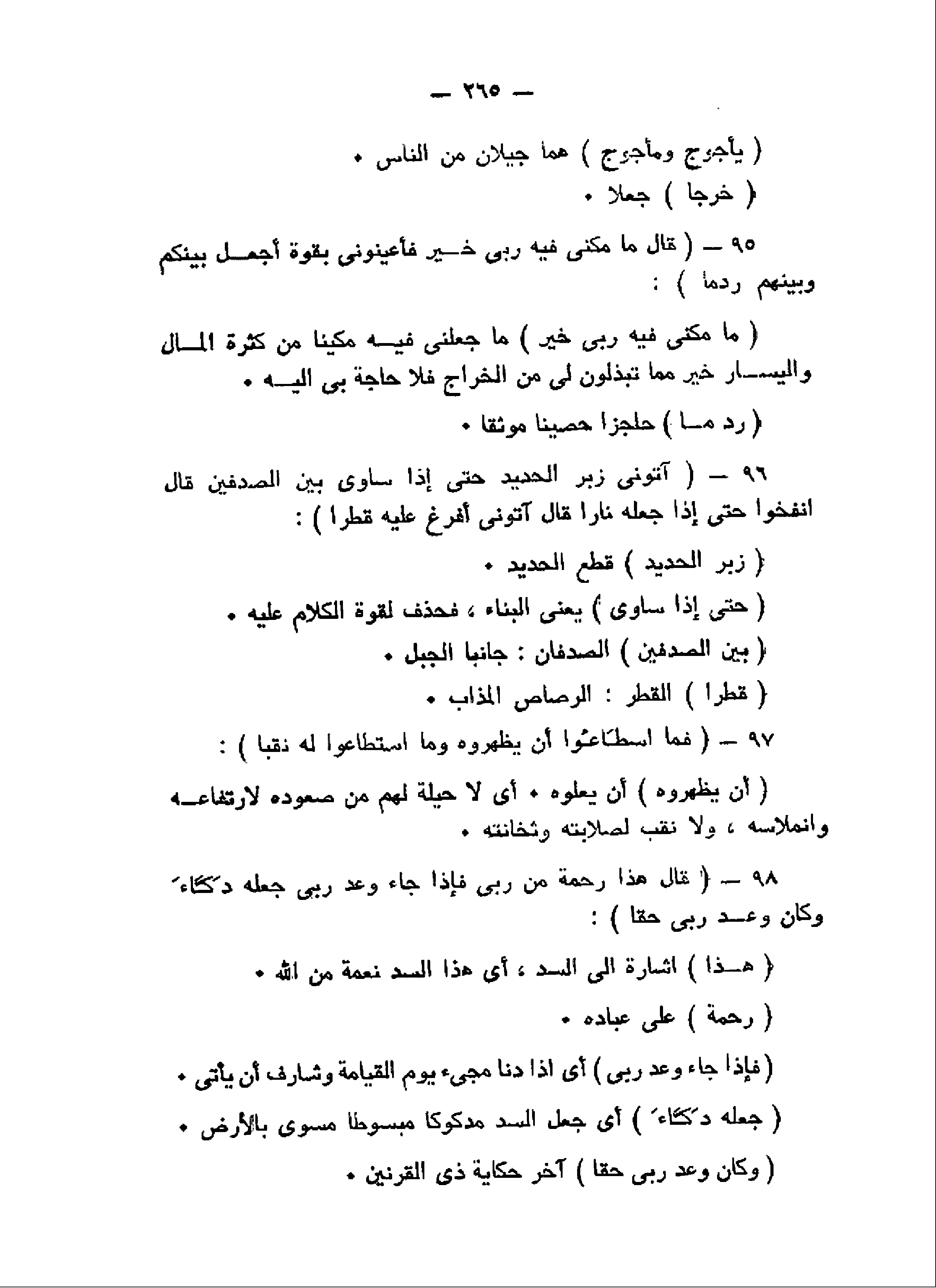 قالَ ما مَكَّنِّي فِيهِ رَبِّي خَيْرٌ فَأَعِينُونِي بِقُوَّةٍ أَجْعَلْ بَيْنَكُمْ وَبَيْنَهُمْ رَدْماً (95) آتُونِي زُبَرَ الْحَدِيدِ حَتَّى إِذا ساوى بَيْنَ الصَّدَفَيْنِ قالَ انْفُخُوا حَتَّى إِذا جَعَلَهُ ناراً قالَ آتُونِي أُفْرِغْ عَلَيْهِ قِطْراً (96) فَمَا اسْطاعُوا أَنْ يَظْهَرُوهُ وَمَا اسْتَطاعُوا لَهُ نَقْباً (97) قالَ هذا رَحْمَةٌ مِنْ رَبِّي فَإِذا جاءَ وَعْدُ رَبِّي جَعَلَهُ دَكَّاءَ وَكانَ وَعْدُ رَبِّي حَقًّا (98)