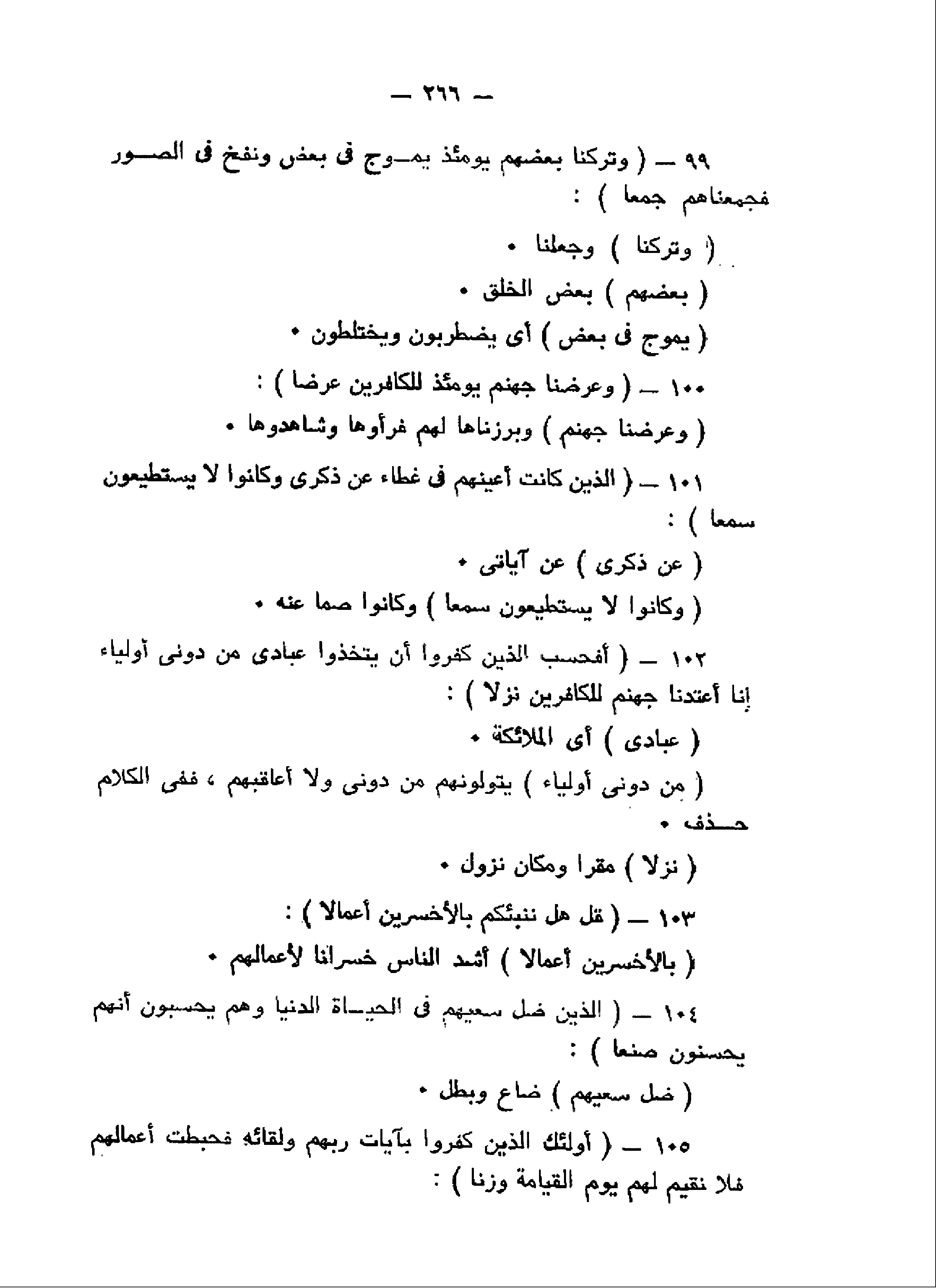 وَعَرَضْنا جَهَنَّمَ يَوْمَئِذٍ لِلْكافِرِينَ عَرْضاً (100) الَّذِينَ كانَتْ أَعْيُنُهُمْ فِي غِطاءٍ عَنْ ذِكْرِي وَكانُوا لا يَسْتَطِيعُونَ سَمْعاً (101) أَفَحَسِبَ الَّذِينَ كَفَرُوا أَنْ يَتَّخِذُوا عِبادِي مِنْ دُونِي أَوْلِياءَ إِنَّا أَعْتَدْنا جَهَنَّمَ لِلْكافِرِينَ نُزُلاً (102) قُلْ هَلْ نُنَبِّئُكُمْ بِالْأَخْسَرِينَ أَعْمالاً (103) الَّذِينَ ضَلَّ سَعْيُهُمْ فِي الْحَياةِ الدُّنْيا وَهُمْ يَحْسَبُونَ أَنَّهُمْ يُحْسِنُونَ صُنْعاً (104)