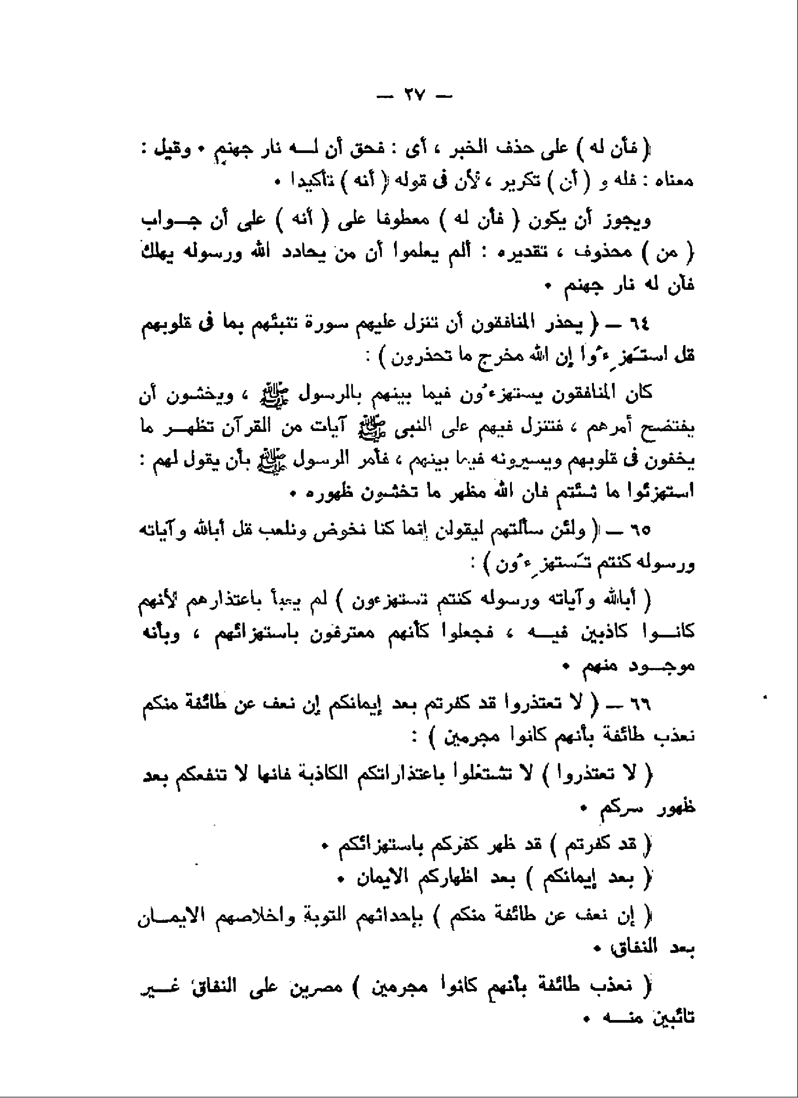 يَحْذَرُ الْمُنافِقُونَ أَنْ تُنَزَّلَ عَلَيْهِمْ سُورَةٌ تُنَبِّئُهُمْ بِما فِي قُلُوبِهِمْ قُلِ اسْتَهْزِؤُا إِنَّ اللَّهَ مُخْرِجٌ ما تَحْذَرُونَ (64) وَلَئِنْ سَأَلْتَهُمْ لَيَقُولُنَّ إِنَّما كُنَّا نَخُوضُ وَنَلْعَبُ قُلْ أَبِاللَّهِ وَآياتِهِ وَرَسُولِهِ كُنْتُمْ تَسْتَهْزِؤُنَ (65) لا تَعْتَذِرُوا قَدْ كَفَرْتُمْ بَعْدَ إِيمانِكُمْ إِنْ نَعْفُ عَنْ طائِفَةٍ مِنْكُمْ نُعَذِّبْ طائِفَةً بِأَنَّهُمْ كانُوا مُجْرِمِينَ (66)