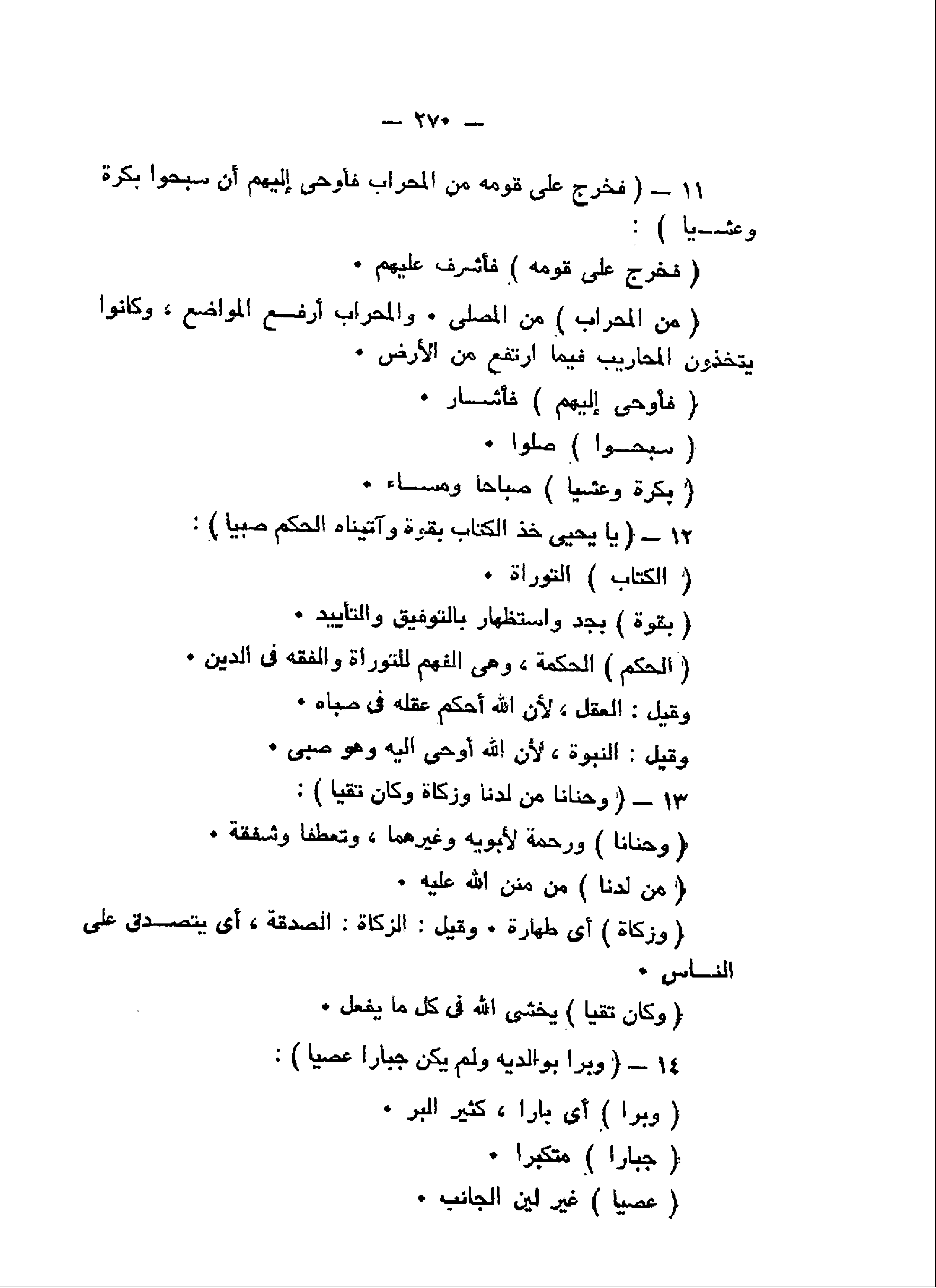 فَخَرَجَ عَلى قَوْمِهِ مِنَ الْمِحْرابِ فَأَوْحى إِلَيْهِمْ أَنْ سَبِّحُوا بُكْرَةً وَعَشِيًّا (11) يا يَحْيى خُذِ الْكِتابَ بِقُوَّةٍ وَآتَيْناهُ الْحُكْمَ صَبِيًّا (12) وَحَناناً مِنْ لَدُنَّا وَزَكاةً وَكانَ تَقِيًّا (13) وَبَرًّا بِوالِدَيْهِ وَلَمْ يَكُنْ جَبَّاراً عَصِيًّا (14)