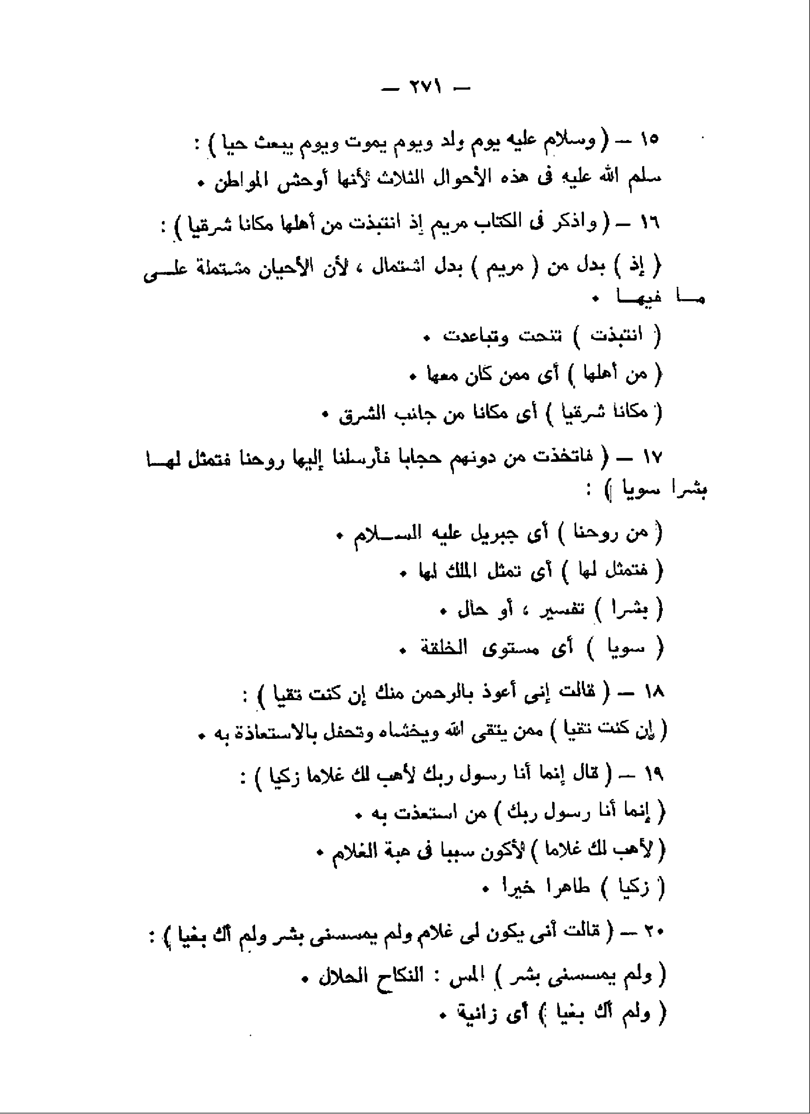 وَسَلامٌ عَلَيْهِ يَوْمَ وُلِدَ وَيَوْمَ يَمُوتُ وَيَوْمَ يُبْعَثُ حَيًّا (15) وَاذْكُرْ فِي الْكِتابِ مَرْيَمَ إِذِ انْتَبَذَتْ مِنْ أَهْلِها مَكاناً شَرْقِيًّا (16) فَاتَّخَذَتْ مِنْ دُونِهِمْ حِجاباً فَأَرْسَلْنا إِلَيْها رُوحَنا فَتَمَثَّلَ لَها بَشَراً سَوِيًّا (17) قالَتْ إِنِّي أَعُوذُ بِالرَّحْمنِ مِنْكَ إِنْ كُنْتَ تَقِيًّا (18) قالَ إِنَّما أَنَا رَسُولُ رَبِّكِ لِأَهَبَ لَكِ غُلاماً زَكِيًّا (19)