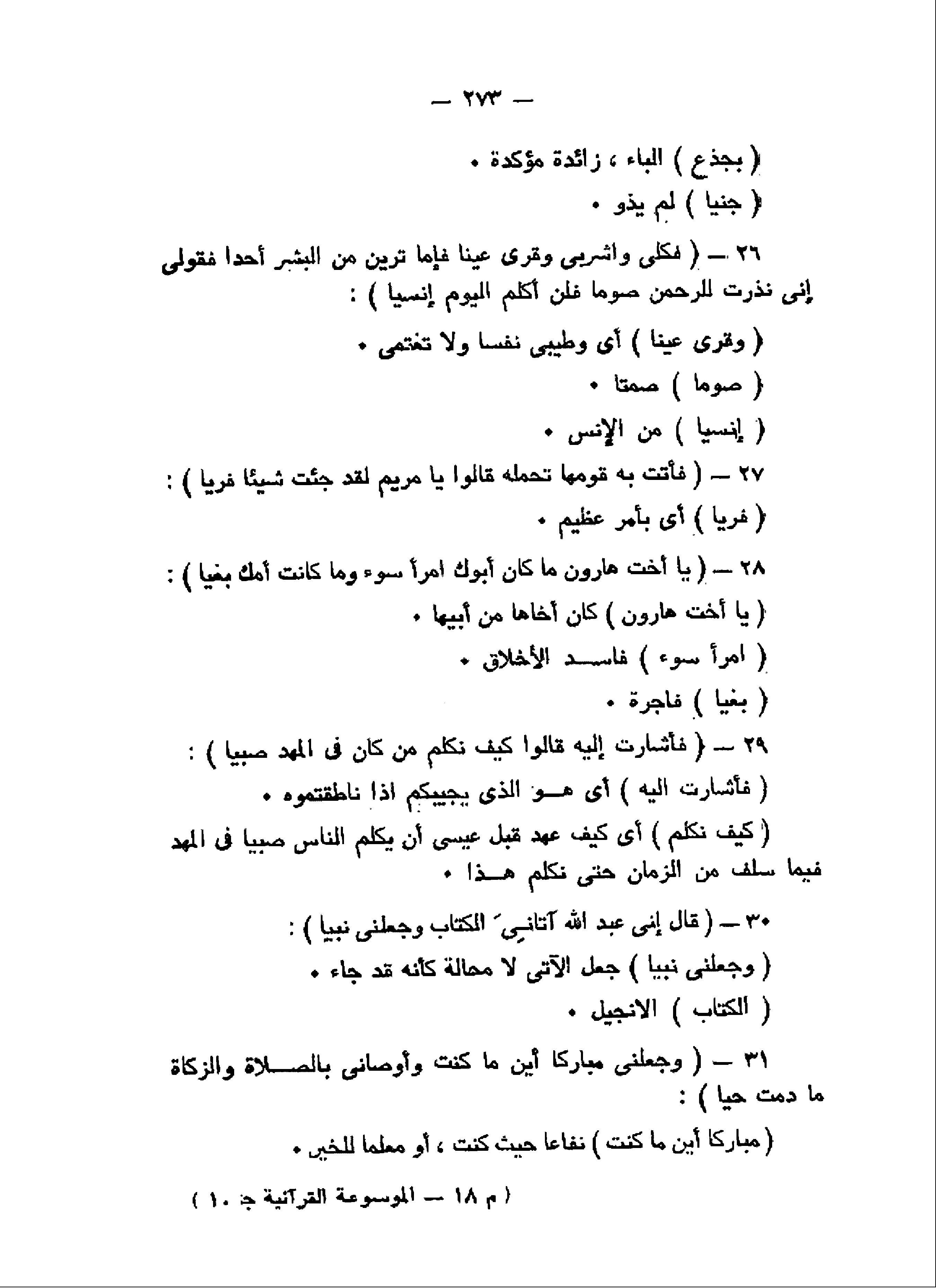فَكُلِي وَاشْرَبِي وَقَرِّي عَيْناً فَإِمَّا تَرَيِنَّ مِنَ الْبَشَرِ أَحَداً فَقُولِي إِنِّي نَذَرْتُ لِلرَّحْمنِ صَوْماً فَلَنْ أُكَلِّمَ الْيَوْمَ إِنْسِيًّا (26) فَأَتَتْ بِهِ قَوْمَها تَحْمِلُهُ قالُوا يا مَرْيَمُ لَقَدْ جِئْتِ شَيْئاً فَرِيًّا (27) يا أُخْتَ هارُونَ ما كانَ أَبُوكِ امْرَأَ سَوْءٍ وَما كانَتْ أُمُّكِ بَغِيًّا (28) فَأَشارَتْ إِلَيْهِ قالُوا كَيْفَ نُكَلِّمُ مَنْ كانَ فِي الْمَهْدِ صَبِيًّا (29) قالَ إِنِّي عَبْدُ اللَّهِ آتانِيَ الْكِتابَ وَجَعَلَنِي نَبِيًّا (30)