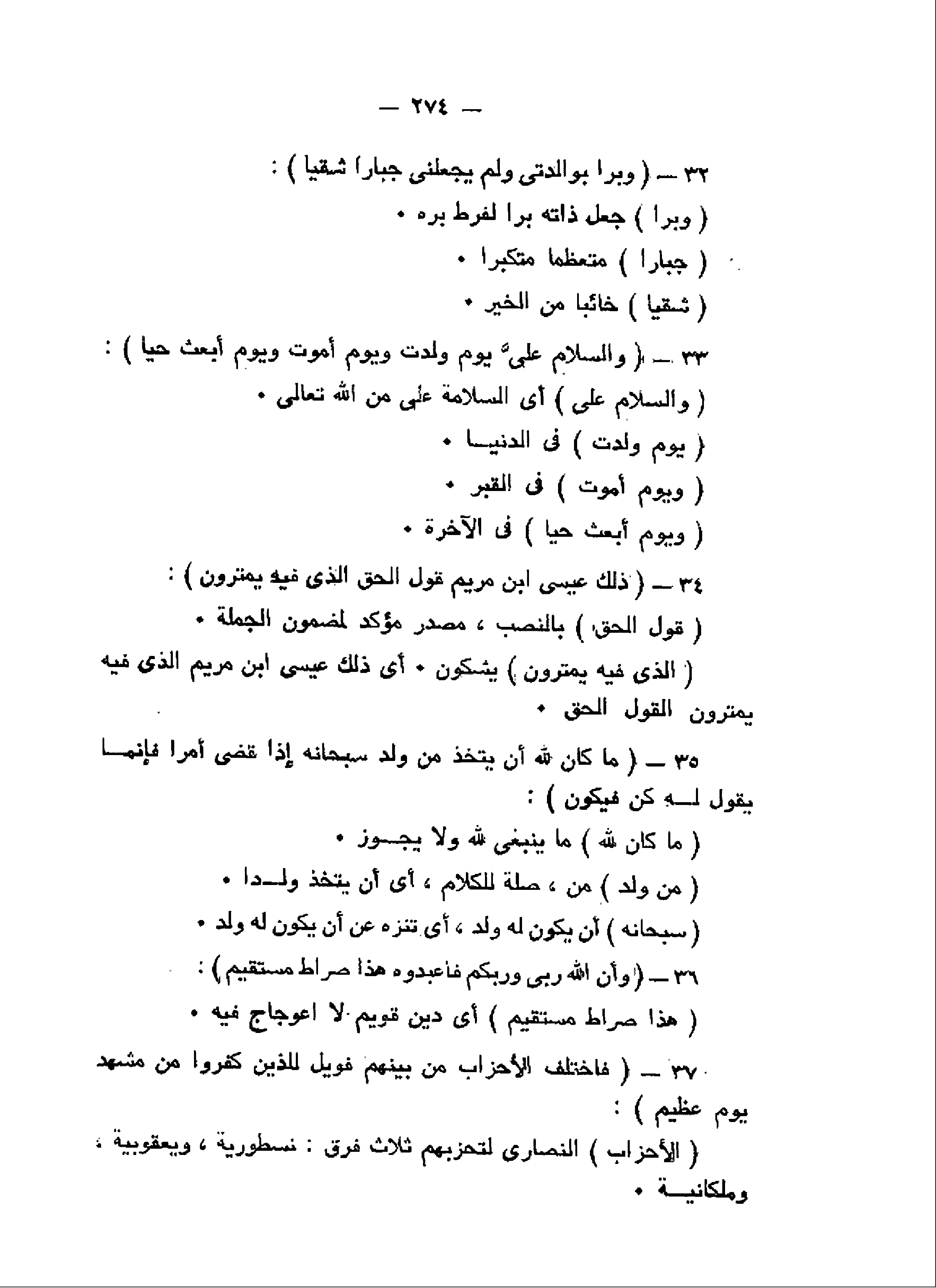 وَبَرًّا بِوالِدَتِي وَلَمْ يَجْعَلْنِي جَبَّاراً شَقِيًّا (32) وَالسَّلامُ عَلَيَّ يَوْمَ وُلِدْتُ وَيَوْمَ أَمُوتُ وَيَوْمَ أُبْعَثُ حَيًّا (33) ذلِكَ عِيسَى ابْنُ مَرْيَمَ قَوْلَ الْحَقِّ الَّذِي فِيهِ يَمْتَرُونَ (34) ما كانَ لِلَّهِ أَنْ يَتَّخِذَ مِنْ وَلَدٍ سُبْحانَهُ إِذا قَضى أَمْراً فَإِنَّما يَقُولُ لَهُ كُنْ فَيَكُونُ (35) وَإِنَّ اللَّهَ رَبِّي وَرَبُّكُمْ فَاعْبُدُوهُ هذا صِراطٌ مُسْتَقِيمٌ (36)