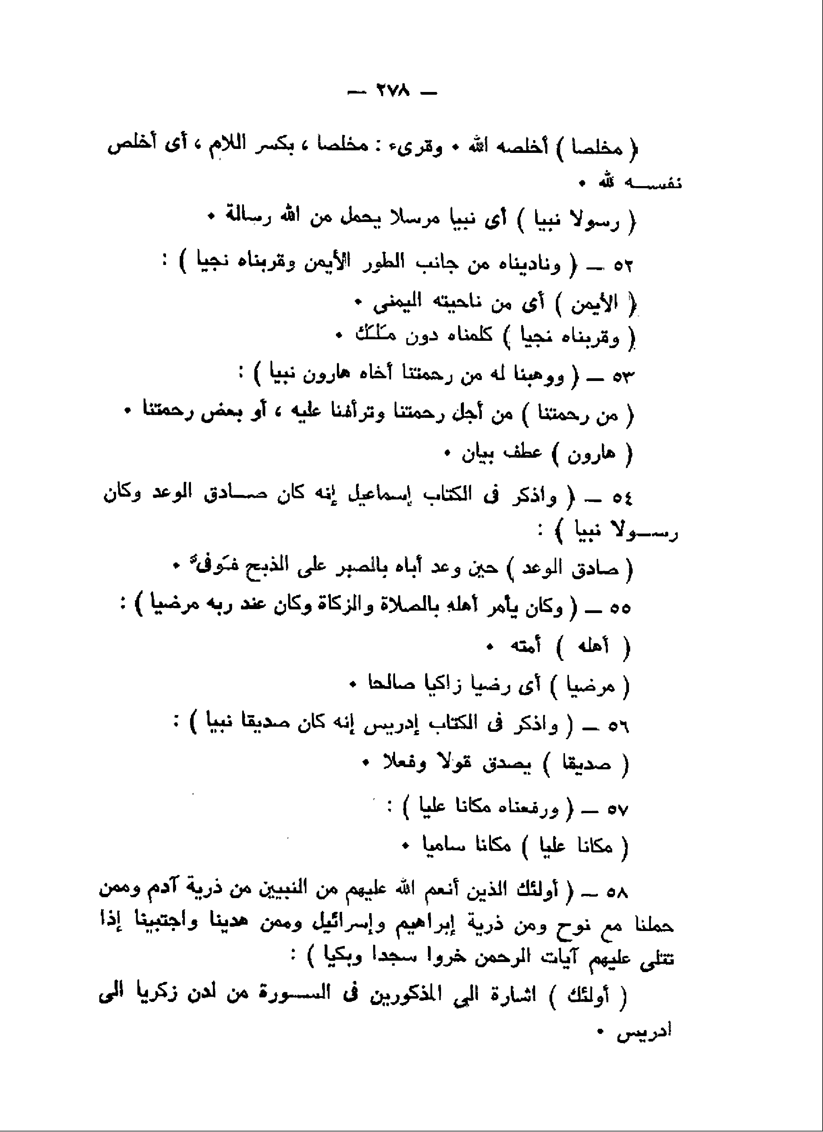 وَنادَيْناهُ مِنْ جانِبِ الطُّورِ الْأَيْمَنِ وَقَرَّبْناهُ نَجِيًّا (52) وَوَهَبْنا لَهُ مِنْ رَحْمَتِنا أَخاهُ هارُونَ نَبِيًّا (53) وَاذْكُرْ فِي الْكِتابِ إِسْماعِيلَ إِنَّهُ كانَ صادِقَ الْوَعْدِ وَكانَ رَسُولاً نَبِيًّا (54) وَكانَ يَأْمُرُ أَهْلَهُ بِالصَّلاةِ وَالزَّكاةِ وَكانَ عِنْدَ رَبِّهِ مَرْضِيًّا (55) وَاذْكُرْ فِي الْكِتابِ إِدْرِيسَ إِنَّهُ كانَ صِدِّيقاً نَبِيًّا (56)